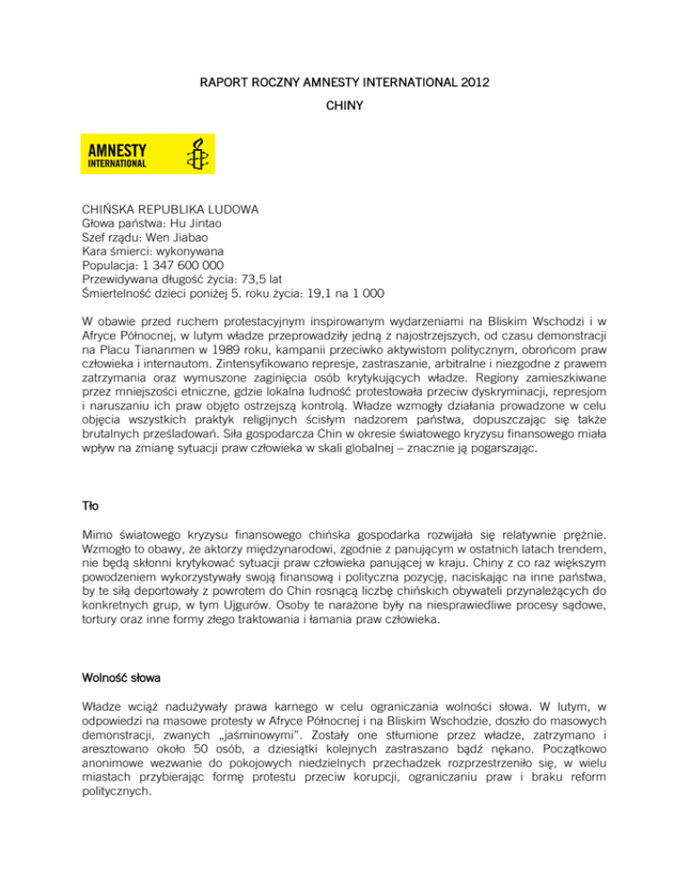 RAPORT ROCZNY AMNESTY INTERNATIONAL 2012 CHINY CHIŃSKA REPUBLIKA LUDOWA Głowa państwa: Hu Jintao Szef rządu: Wen Jiabao Kara śmierci: wykonywana Populacja: 1 347 600 000 Przewidywana długość życia: 73,5 lat Śmiertelność dzieci poniżej 5. roku życia: 19,1 na 1 000 W obawie przed ruchem protestacyjnym inspirowanym wydarzeniami na Bliskim Wschodzi i w Afryce Północnej, w lutym władze przeprowadziły jedną z najostrzejszych, od czasu demonstracji na Placu Tiananmen w 1989 roku, kampanii przeciwko aktywistom politycznym, obrońcom praw człowieka i internautom. Zintensyfikowano represje, zastraszanie, arbitralne i niezgodne z prawem zatrzymania oraz wymuszone zaginięcia osób krytykujących władze. Regiony zamieszkiwane przez mniejszości etniczne, gdzie lokalna ludność protestowała przeciw dyskryminacji, represjom i naruszaniu ich praw objęto ostrzejszą kontrolą. Władze wzmogły działania prowadzone w celu objęcia wszystkich praktyk religijnych ścisłym nadzorem państwa, dopuszczając się także brutalnych prześladowań. Siła gospodarcza Chin w okresie światowego kryzysu finansowego miała wpływ na zmianę sytuacji praw człowieka w skali globalnej – znacznie ją pogarszając. Tło Mimo światowego kryzysu finansowego chińska gospodarka rozwijała się relatywnie prężnie. Wzmogło to obawy, że aktorzy międzynarodowi, zgodnie z panującym w ostatnich latach trendem, nie będą skłonni krytykować sytuacji praw człowieka panującej w kraju. Chiny z co raz większym powodzeniem wykorzystywały swoją finansową i polityczna pozycję, naciskając na inne państwa, by te siłą deportowały z powrotem do Chin rosnącą liczbę chińskich obywateli przynależących do konkretnych grup, w tym Ujgurów. Osoby te narażone były na niesprawiedliwe procesy sądowe, tortury oraz inne formy złego traktowania i łamania praw człowieka. Wolność słowa Władze wciąż nadużywały prawa karnego w celu ograniczania wolności słowa. W lutym, w odpowiedzi na masowe protesty w Afryce Północnej i na Bliskim Wschodzie, doszło do masowych demonstracji, zwanych „jaśminowymi”. Zostały one stłumione przez władze, zatrzymano i aresztowano około 50 osób, a dziesiątki kolejnych zastraszano bądź nękano. Początkowo anonimowe wezwanie do pokojowych niedzielnych przechadzek rozprzestrzeniło się, w wielu miastach przybierając formę protestu przeciw korupcji, ograniczaniu praw i braku reform politycznych. Marcowe poprawki prawne dotyczące publikacji wprowadziły nowy wymóg posiadania licencji na rozpowszechnianie treści w Internecie i poprzez sieci nieformalne, pod groźbą sankcji karnych. Władze zamknęły bądź przejęły kontrolę nad wieloma wydawnictwami publikującymi artykuły dziennikarzy śledczych poruszające drażliwą tematykę. Zakazano także używania w wiadomościach tekstowych setek słów, takich jak „demokracja” czy „prawa człowieka”. • Dwóch aktywistów zatrzymanych w trakcie „jaśminowych” protestów zostało skazanych na długoletnie kary więzienia za publikowanie artykułów o tematyce politycznej. 23 grudnia Chen Wei został oskarżony o „podżeganie do obalenia władzy państwowej” i skazany na dziewięć lat za napisanie 11 artykułów, w których apelował o demokrację i przeprowadzenie reform politycznych. 26 grudnia Chen Xi został skazany pod tym samym zarzutem na karę 10 lat pozbawienia wolności za opublikowanie za granicą 36 artykułów. Ding Mao z prowincji Syczuan oraz Liang Haiyi, mieszkanka prowincji Guangdong, wciąż są przetrzymywani za udział w „jaśminowych” protestach. Obrońcy praw człowieka Władze wciąż nękały, zastraszały, prześladowały i traktowały jak przestępców działaczy na rzecz praw człowieka i demokracji. Aktywiści wspierający Demokratyczną Partię Chin skazywani byli na wieloletnie kary pozbawienia wolności. • W marcu Liu Xianbin oskarżony o „podżeganie do obalenia władzy państwowej”, skazany został na 10 lat więzienia za działalność prodemokratyczną, wspieranie ruchu Karty 08 oraz publikacje na temat reform politycznych. • Od czasu opuszczenia więzienia we wrześniu 2010 roku, działacz na rzecz praw człowieka Chen Guangcheng bezprawnie przetrzymywany był, wraz z żoną Yuan Weijing oraz córką, w areszcie domowym. Oddolny ruch poparcia niewidomego Guangchenga zyskał zwolenników w całym kraju, a wielu aktywistów zamieszczało w Internecie zdjęcia siebie w charakterystycznych dla Guangchenga ciemnych okularach. Przyjeżdżające z wielu zakątków Chin, osoby chcące wesprzeć mężczyznę i odwiedzić go były bite i okradane przez nieumundurowanych policjantów stacjonujących w okolicy jego domu. Wymuszone zaginięcia Wzrastała liczba osób dotkniętych „wymuszonym zaginięciem”. Wielu z nich, w tym Hada, mongolskiego aktywistę politycznego, przetrzymywano w tajnych więzieniach. Wśród osób przebywających w co raz częściej stosowanych, nielegalnych aresztach domowych była Liu Xia, żona laureata Pokojowej Nagrody Nobla Liu Xiaobo, oraz Zheng Enchong, szanghajski adwokat zajmujący się prawami mieszkańców. 30 sierpnia władze ogłosiły projekt, pierwszych od 1997 roku, zmian w kodeksie postępowania karnego. Obok kilku pozytywnych poprawek, zaproponowano legalizację przetrzymywania nawet do sześciu miesięcy bez konieczności powiadamiania rodziny i bliskich osoby zatrzymanej. Wielu ekspertów w dziedzinie prawa uznało to za legalizację wymuszonych zaginięć. W projekcie znalazł się także zakaz wykorzystywania bezprawnie zdobytych materiałów dowodowych, między innymi wymuszonych zeznań, uzyskanych poprzez różne formy złego traktowania, w tym tortury. Jednak tortury były wciąż powszechnie stosowane w miejscach zatrzymań. Sprzyjała im polityka rządu, który wspierał wszelkie działania władz więziennych, które miały na celu „transformację” wierzących więźniów, tak by wy