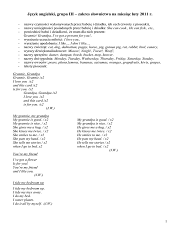 Język angielski, grupa III – zakres słownictwa na miesiąc luty 2011 r. - nazwy czynności wykonywanych przez babcię i dziadka, ich cech (zwroty z piosenki), nazwy umiejętności posiadanych przez babcię i dziadka: She can cook., He can fish., etc., powiedzieć babci i dziadkowi, że mam dla nich prezent: Grannie/ Grandpa, I’ve got a present for you!, wyrażenie uczucia miłości: I love you., wyrażenie upodobania: I like..., I don’t like..., nazwy zwierząt: cat, dog, dalmatian, puppy, horse, pig, guinea pig, rat, rabbit, bird, canary, wyrazy dźwiękonaśladowcze: Miaow!, Neigh!, Tweet!, Woof!, nazwy sprzętów: duster, dustpan, brush, bucket, mop, hoover, nazwy dni tygodnia: Monday, Tuesday, Wednesday, Thursday, Friday, Saturday, Sunday, nazwy owoców: pears, plums,lemons, bananas, satsumas, oranges, grapefruits, kiwis, grapes, teksty piosenek: Grannie, Grandpa Grannie, Grannie /x2 I love you /x2 and this card /x2 is for you. /x2 Grandpa, Grandpa /x2 I love you /x2 and this card /x2 is for you. /x2 (J.W.) My grannie, my grandpa My grannie is good. / x2 My grannie is nice. / x2 She gives me a hug. / x2 She kisses me twice. / x2 She smiles to me. / x2 She pats my head. / x2 She tells me stories / x2 when I go to bed. x2 My grandpa is good. / x2 My grandpa is nice. / x2 He gives me a hug. / x2 He kisses me twice. / x2 He smiles to me. / x2 He pats my head. / x2 He tells me stories / x2 when I go to bed. / x2 (J.W.) You’re my friend I’ve got a flower Is for you! You’re my friend and I like you. (J.W.) I tidy my bedroom up I tidy my bedroom up. I tidy my toys away. I do my bed. I water plants. I do it all by myself. (J.W.) 1 Let’s clean the house 1. Let’s clean the house! Let’s clean the house! Take a duster, take a duster and dust the house. 2. Let’s clean the house! Let’s clean the house! Take a dustpan and a brush, and dust the floor. 3. Let’s clean the house! Let’s clean the house! Take a bucket and a mop, and wash the floor. 4. Let’s clean the house! Let’s clean the house! Take a hoover, take a hoover, hoover the floor. (J.W.) The wheels on the bus go round and round The wheels on the bus go round and round, round and round, round and round. The wheels on the bus go round and round, all day long. The wipers on the bus go Swish, swish, swish; Swish, swish, swish, swish, swish, swish. The wipers on the bus go swish, swish, swish, all day long. The horn on the bus goes beep, beep, beep; Beep, beep, beep, beep, beep, beep. The horn on the bus goes beep, beep, beep, all day long. The doors on the bus go open and shut, open and shut, open and shut; The doors on the bus go open and shut, all day long. The baby on the bus says "Wah, wah, wah; Wah, wah, wah; Wah, wah, wah". The baby on the bus says "Wah, wah, wah", all day long. The mummy on the bus says "Shush, shush, shush; Shush, shush, shush; Shush, shush, shush." The mummy on the bus says "Shush, shush, shush" all day long. The daddy on the bus goes read, read, read; read, read, read; read, read, read; The daddy on the bus goes read, read, read; all day long. The children on the bus go wriggle, wriggle, wriggle, wriggle, wriggle, wriggle, wriggle, wriggle, wriggle; The children on the bus go wriggle, wriggle, wriggle, all day long. 2 The mummy on the bus says "Don’t do that!, Don’t do that!, Don’t do that!”; The mummy on the bus says "Don’t do that!” all day long. The lady on the bus says, "Get off my feet., Get off my feet., Get off my feet.” The lady on the bus says, "Get off my feet.” all day long. Do you like...? Days of the Week Do you like apples? I am Monday. I am Tuesday. Wednesday. Thursday. Friday. I am Saturday and I am sunny sunny Sunday. (J.W.) Yes, I do. Apples are good for me and you. Do you like pears / plums / lemons /bananas / satsumas / oranges / grapefruits / kiwis / grapes? Yes, I do. (...) (J.W.) oraz piosenki kursowe dotyczące rozdziału 4: English Adventure Starter, CD 1 Nauczyciel: Joanna Wójciak 3