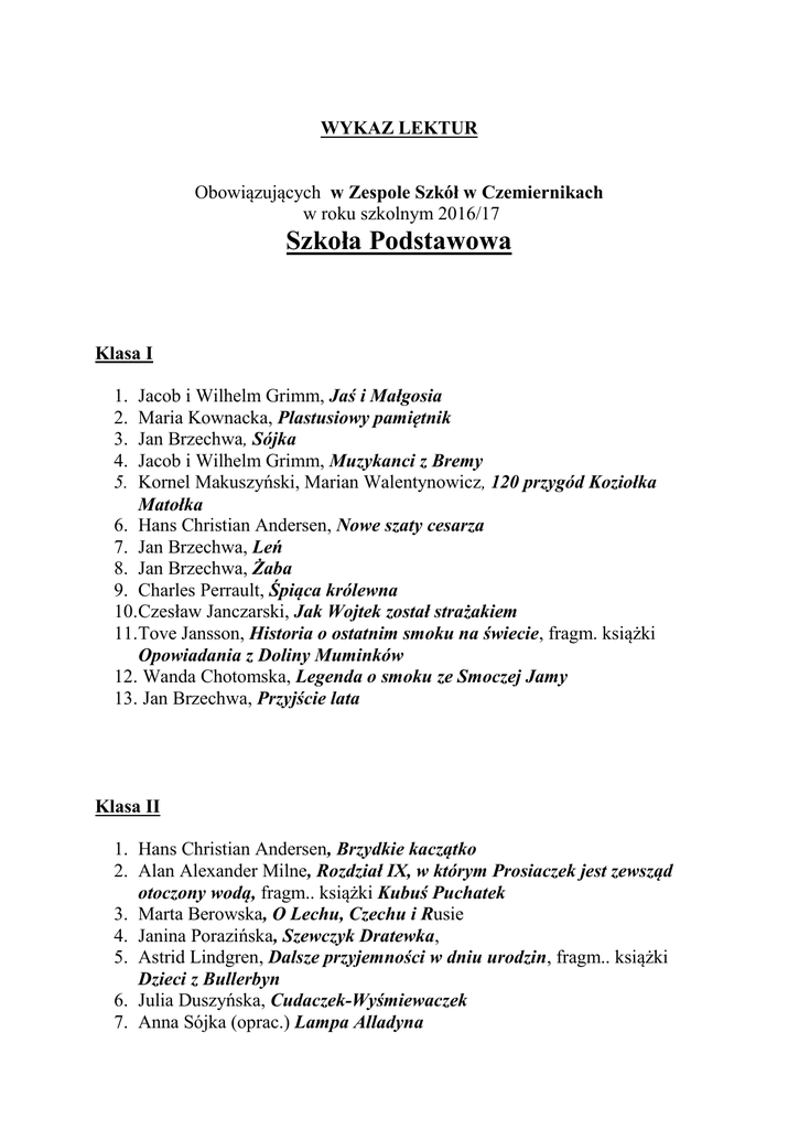 WYKAZ LEKTUR Obowiązujących w Zespole Szkół w Czemiernikach w roku szkolnym 2016/17 Szkoła Podstawowa Klasa I Jacob i Wilhelm Grimm, Jaś i Małgosia Maria Kownacka, Plastusiowy pamiętnik Jan Brzechwa, Sójka Jacob i Wilhelm Grimm, Muzykanci z Bremy Kornel Makuszyński, Marian Walentynowicz, 120 przygód Koziołka Matołka 6. Hans Christian Andersen, Nowe szaty cesarza 7. Jan Brzechwa, Leń 8. Jan Brzechwa, Żaba 9. Charles Perrault, Śpiąca królewna 10.Czesław Janczarski, Jak Wojtek został strażakiem 11.Tove Jansson, Historia o ostatnim smoku na świecie, fragm. książki Opowiadania z Doliny Muminków 12. Wanda Chotomska, Legenda o smoku ze Smoczej Jamy 13. Jan Brzechwa, Przyjście lata 1. 2. 3. 4. 5. Klasa II 1. Hans Christian Andersen, Brzydkie kaczątko 2. Alan Alexander Milne, Rozdział IX, w którym Prosiaczek jest zewsząd otoczony wodą, fragm.. książki Kubuś Puchatek 3. Marta Berowska, O Lechu, Czechu i Rusie 4. Janina Porazińska, Szewczyk Dratewka, 5. Astrid Lindgren, Dalsze przyjemności w dniu urodzin, fragm.. książki Dzieci z Bullerbyn 6. Julia Duszyńska, Cudaczek-Wyśmiewaczek 7. Anna Sójka (oprac.) Lampa Alladyna 8. Hans Christian Andersen, Calineczka 9. Kenneth Grahame, Nad brzegiem rzeki, fragm.. książki O czym szumią wierzby 10. Marian Orłoń, O Piaście Kołodzieju i tajemniczych wędrowcach 11. Joanna Papuzińska, Czar dla mamy, fragm. książki Nasza mama czarodziejka Klasa III 1. Marta Berowska, Legenda o śpiących rycerzach w Tatrach 2. Maria Kownacka, Kajtkowe przygody 3. Maria Krüger, Karolcia 4. Maria Konopnicka, Jak to ze lnem było 5. Janina Porazińska, O dwunastu miesiącach 6. Marian Orłoń, Przerwany hejnał 7. Hans Christian Andersen, Królowa śniegu (fragment) 8. Hugh Lofting, Doktor Dolittle i jego zwierzęta (fragment) 9. Franciszek Jankowski, Bajka o królu ryb 10. Artur Oppman, Syrena 11.Roman Pisarski, O psie, który jeździł koleją Klasa IV 1. 2. 3. 4. Jan Brzechwa, Akademia pana Kleksa Frances Hodgson Burnett, Mała księżniczka Carlo Collodi, Pinokio Clive Staples Levis, Opowieści z Narnii – Lew, czarownica i stara szafa Klasa V 1. 2. 3. 4. 5. Henryk Sienkiewicz, W pustyni i w puszczy Frances Hodgson Burnett,Tajemniczy ogród Lucy Maud Montgomery, Ania z Zielonego Wzgórza Wybór mitów greckich Wybór legend Klasa VI 1. 2. 3. 4. Stanisław Lem, Bajki robotów Irena Jurgielewiczowa, Ten obcy Maria Konopnicka, Dym Kornel Makuszyński, Szatan z siódmej klasy Gimnazjum KL. I 1. 2. 3. 4. 5. 6. 7. Jan Parandowski, Mitologia (wybór) Bolesław Prus, Kamizelka Adam Mickiewicz, Dziady cz. II Aleksander Fredro, Zemsta Antoine de Saint- Exupery, Mały Książę William Szekspir, Romeo i Julia Lektura dla młodzieży (np. M. Musierowicz, K. Siesickiej…) KL. II 1. 2. 3. 4. 5. 6. 7. 8. Jan Parandowski, Przygody Odyseusza Ernest Hemingway, Stary człowiek i morze Ida Fink, Opowiadania (wybór) Aleksander Kamiński, Kamienie na szaniec Henryk Sienkiewicz, Krzyżacy Molier, Skąpiec Arthur Conan Doyle, Przygody Sherlocka Holmesa Henryk Sienkiewicz, Latarnik KL. III 1. 2. 3. 4. 5. 6. 7. Juliusz Słowacki, Balladyna Eric-Emmanuel Schmitt, Oskar i pani Róża Zofia Chądzyńska, Wstęga pawilonu Stefan Żeromski, Syzyfowe prace J. R. R. Tolkien, Władca pierścieni (fragmenty) – podręcznik Ryszard Kapuściński, Wojna futbolowa (fragmenty) – podręcznik Stanisław Lem, Dzienniki gwiazdowe (fragmenty) – podręcznik