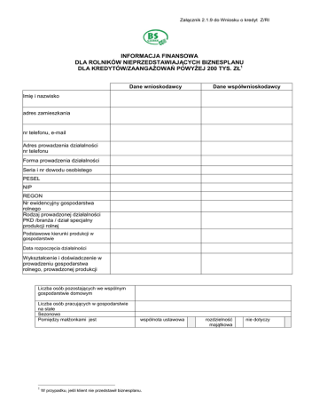 Załącznik 2.1.9 do Wniosku o kredyt Z/RI INFORMACJA FINANSOWA DLA ROLNIKÓW NIEPRZEDSTAWIAJĄCYCH BIZNESPLANU DLA KREDYTÓW/ZAANGAŻOWAŃ POWYŻEJ 200 TYS. ZŁ1 Dane wnioskodawcy Dane współwnioskodawcy Imię i nazwisko adres zamieszkania nr telefonu, e-mail Adres prowadzenia działalności nr telefonu Forma prowadzenia działalności Seria i nr dowodu osobistego PESEL NIP REGON Nr ewidencyjny gospodarstwa rolnego Rodzaj prowadzonej działalności PKD /branża / dział specjalny produkcji rolnej Podstawowe kierunki produkcji w gospodarstwie Data rozpoczęcia działalności Wykształcenie i doświadczenie w prowadzeniu gospodarstwa rolnego, prowadzonej produkcji Liczba osób pozostających we wspólnym gospodarstwie domowym Liczba osób pracujących w gospodarstwie na stałe Sezonowo Pomiędzy małżonkami jest 1 wspólnota ustawowa W przypadku, jeśli klient nie przedstawił biznesplanu. rozdzielność majątkowa nie dotyczy Załącznik 2.1.9 do Wniosku o kredyt WK-R I. INFORMACJA O MAJĄTKU GOSPODARSTWA stan na dzień………………….. 1. Posiadane i użytkowane grunty Grunty własne (ha) Wartość (zł) wg _______ Obciążenia Księgi wieczystej hipotekami (nr i kwota łączna) Grunty dzierżawione (ha) Grunty dobre (kl. I, II, III a) Grunty średnie (kl. III b i IV) Grunty słabe (kl. V i VI) Użytki zielone Tereny pod zabudowaniami Pozostałe grunty i nieużytki Nieużytki RAZEM Komentarz: 2. Budynki i budowle Rodzaj budynku RAZEM Komentarz: Rok budowy Aktualna wartość rynkowa w /zł/ wg polisy ubezpieczeniowej/wyceny rzeczoznawcy* Księga wieczysta i jej obciążenia X 3. Posiadane maszyny i urządzenia rolnicze oraz pojazdy samochodowe Rodzaj Rok produkcji Aktualna wartość rynkowa w /zł/ wg polisy ubezpieczeniowej/wyceny rzeczoznawcy* Obciążenia/ prawa osób trzecich RAZEM Komentarz: 2 Załącznik 2.1.9 do Wniosku o kredyt WK-R 4. Stado podstawowe/ Aktywa obrotowe Wyszczególnienie Rok bieżący stan na dzień__________ Ilość (ha, q, szt.) Wartość Prognoza na okres kredytowania Ilość (ha, q, szt.) Wartość Stado podstawowe ………………………….. …………………………... ………………………….. …………………………... Produkcja roślinna w toku Zapasy ogółem, w tym: pasze środki do produkcji zboża Stado obrotowe ………………………….. …………………………... ………………………….. …………………………... Należności, z tytułu: dopłat bezpośrednich Pozostałe, w tym: Komentarz: 5. Środki pieniężne Wyszczególnienie Rok bieżący/kwota na dzień ____________________ Prognoza na okres kredytowania (zł) Posiadana gotówka Środki pieniężne na rachunkach Lokaty Papiery wartościowe Jednostki uczestnictwa TFI Komentarz: 3 Załącznik 2.1.9 do Wniosku o kredyt WK-R 6. Pozostały majątek (np. działki budowlane, majątek spoza gospodarstwa np. mieszkanie) Aktualna wartość rynkowa w /zł/ Rodzaj Obciążenia/ prawa osób trzecich Komentarz: 7.Zadłużenie z tytułu zaciągniętych kredytów, pożyczek, przyznanych limitów, kart kredytowych, udzielonych poręczeń w innych bankach nie posiadam/y zobowiązań w innych bankach Posiadam/y zobowiązania w kwocie ogółem: ………………………..zł Udzieliliśmy poręczeń kwocie ogółem: ………………………..zł ZOBOWIĄZANIA WŁASNE nazwa instytucji finansującej rodzaj zobowiązania kwota i waluta wg umowy aktualna kwota pozostająca do spłaty okres kredytowania od…do miesięczna rata rodzaj zabezpieczenia UDZIELONE PORĘCZENIA Jeśli nie zaznaczono inaczej, wypełniając dalszą część, rok bieżący rozumiany jest jako cały bieżący rok czyli dotychczasowe wykonanie + prognoza do końca roku, a w przypadku prognozy podać należy dane wg roku planowanego największego obciążenia w okresie kredytowania, o ile w okresie kredytowania nie wystąpią zmiany w skali, organizacji, rodzaju produkcji itp. wpływające na wyniki gospodarstwa. Jeżeli planowane są zmiany należy przedstawić prognozę na cały okres kredytowania (załącznik do niniejszej informacji). Prognoza nie dotyczy kredytu w rachunku bieżącym. Dane za rok ubiegły i dwa lata wstecz należy wypełnić wówczas jeśli nie były przedstawiane w ramach monitoringu. 4 Załącznik 2.1.9 do Wniosku o kredyt WK-R II. Prowadzona produkcja 1) Produkcja zwierzęca Wyszczególnienie Dwa lata wstecz Rok bieżący Rok ubiegły Wartość(zł) wartość szt. /zł/ A. Sprzedaż produkcji zwierzęcej (wymienić poniżej) Bydło mleczne Trzoda Kury nioski Indyki Brojlery Gęsi Inna produkcja zwierzęca RAZEM SPRZEDAŻ B. Koszty produkcji zwierzęcej Zakup zwierząt ……………………. Zakup pasz Koszty weterynaryjne Pozostałe koszty RAZEM KOSZTY Dochód z produkcji zwierzęcej (A - B) Komentarz: Ilość (t) cena Prognoza roczna w okresie kredytowania wartość wartość (zł) (zł) szt. X X X X x x x 2) Produkcja roślinna Wyszczególnienie Dwa lata wstecz Rok ubiegły Rok bieżący wartość* wartość* (zł) ha Ilość (zł) (t) A. Struktura zasiewów i sprzedaż produkcji roślinnej (wymienić poniżej) Pszenica Jęczmień Żyto Kukurydza Inne zboża Rzepak Ziemniaki Buraki cukrowe Inna produkcja roślinna RAZEM SPRZEDAŻ B. Koszty produkcji roślinnej Zakup nasion Zakup nawozów mineralnych Zakup środków ochrony roślin Pozostałe koszty RAZEM KOSZTY Dochód z produkcji roślinnej (A - B) Komentarz: X X X X X cena Prognoza roczna w okresie kredytowania wartość* (zł) wartość* (zł) x x x x x **Wartość 0 jeśli produkcja na paszę 5 Załącznik 2.1.9 do Wniosku o kredyt WK-R III. Koszty pośrednie Pozostałe koszty prowadzenia gospodarstw (koszty pośrednie) - w zł Wyszczególnienie Czynsz dzierżawny Zakup oleju, paliwa Remonty, naprawy Opał, gaz Koszty transportu Podatki Ubezpieczenia KRUS Płace i ZUS Prowizje od kredytów Inne, w tym: Dwa lata wstecz Rok ubiegły Rok bieżący Prognoza na okres kredytowania RAZEM Komentarz: IV. RAC