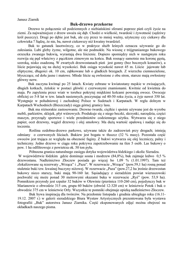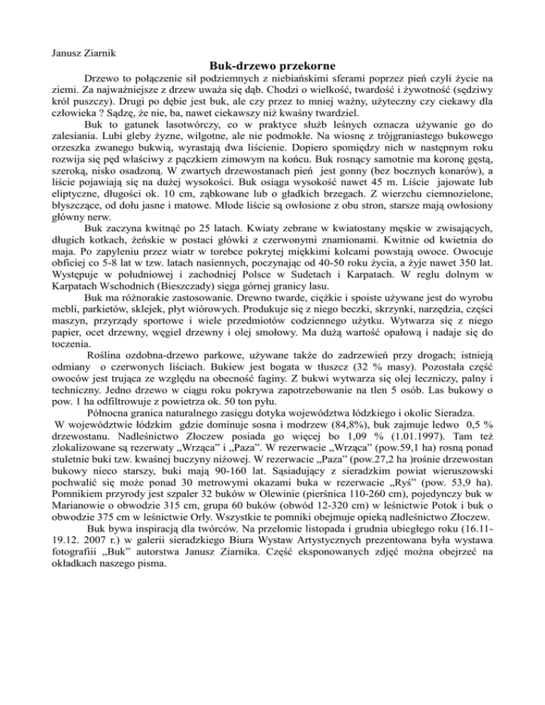 Janusz Ziarnik Buk-drzewo przekorne Drzewo to połączenie sił podziemnych z niebiańskimi sferami poprzez pień czyli Ŝycie na ziemi. Za najwaŜniejsze z drzew uwaŜa się dąb. Chodzi o wielkość, twardość i Ŝywotność (sędziwy król puszczy). Drugi po dębie jest buk, ale czy przez to mniej waŜny, uŜyteczny czy ciekawy dla człowieka ? Sądzę, Ŝe nie, ba, nawet ciekawszy niŜ kwaśny twardziel. Buk to gatunek lasotwórczy, co w praktyce słuŜb leśnych oznacza uŜywanie go do zalesiania. Lubi gleby Ŝyzne, wilgotne, ale nie podmokłe. Na wiosnę z trójgraniastego bukowego orzeszka zwanego bukwią, wyrastają dwa liścienie. Dopiero spomiędzy nich w następnym roku rozwija się pęd właściwy z pączkiem zimowym na końcu. Buk rosnący samotnie ma koronę gęstą, szeroką, nisko osadzoną. W zwartych drzewostanach pień jest gonny (bez bocznych konarów), a liście pojawiają się na duŜej wysokości. Buk osiąga wysokość nawet 45 m. Liście jajowate lub eliptyczne, długości ok. 10 cm, ząbkowane lub o gładkich brzegach. Z wierzchu ciemnozielone, błyszczące, od dołu jasne i matowe. Młode liście są owłosione z obu stron, starsze mają owłosiony główny nerw. Buk zaczyna kwitnąć po 25 latach. Kwiaty zebrane w kwiatostany męskie w zwisających, długich kotkach, Ŝeńskie w postaci główki z czerwonymi znamionami. Kwitnie od kwietnia do maja. Po zapyleniu przez wiatr w torebce pokrytej miękkimi kolcami powstają owoce. Owocuje obficiej co 5-8 lat w tzw. latach nasiennych, poczynając od 40-50 roku Ŝycia, a Ŝyje nawet 350 lat. Występuje w południowej i zachodniej Polsce w Sudetach i Karpatach. W reglu dolnym w Karpatach Wschodnich (Bieszczady) sięga górnej granicy lasu. Buk ma róŜnorakie zastosowanie. Drewno twarde, cięŜkie i spoiste uŜywane jest do wyrobu mebli, parkietów, sklejek, płyt wiórowych. Produkuje się z niego beczki, skrzynki, narzędzia, części maszyn, przyrządy sportowe i wiele przedmiotów codziennego uŜytku. Wytwarza się z niego papier, ocet drzewny, węgiel drzewny i olej smołowy. Ma duŜą wartość opałową i nadaje się do toczenia. Roślina ozdobna-drzewo parkowe, uŜywane takŜe do zadrzewień przy drogach; istnieją odmiany o czerwonych liściach. Bukiew jest bogata w tłuszcz (32 % masy). Pozostała część owoców jest trująca ze względu na obecność faginy. Z bukwi wytwarza się olej leczniczy, palny i techniczny. Jedno drzewo w ciągu roku pokrywa zapotrzebowanie na tlen 5 osób. Las bukowy o pow. 1 ha odfiltrowuje z powietrza ok. 50 ton pyłu. Północna granica naturalnego zasięgu dotyka województwa łódzkiego i okolic Sieradza. W województwie łódzkim gdzie dominuje sosna i modrzew (84,8%), buk zajmuje ledwo 0,5 % drzewostanu. Nadleśnictwo Złoczew posiada go więcej bo 1,09 % (1.01.1997). Tam teŜ zlokalizowane są rezerwaty „Wrząca” i „Paza”. W rezerwacie „Wrząca” (pow.59,1 ha) rosną ponad stuletnie buki tzw. kwaśnej buczyny niŜowej. W rezerwacie „Paza” (pow.27,2 ha )rośnie drzewostan bukowy nieco starszy, buki mają 90-160 lat. Sąsiadujący z sieradzkim powiat wieruszowski pochwalić się moŜe ponad 30 metrowymi okazami buka w rezerwacie „Ryś” (pow. 53,9 ha). Pomnikiem przyrody jest szpaler 32 buków w Olewinie (pierśnica 110-260 cm), pojedynczy buk w Marianowie o obwodzie 315 cm, grupa 60 buków (obwód 12-320 cm) w leśnictwie Potok i buk o obwodzie 375 cm w leśnictwie Orły. Wszystkie te pomniki obejmuje opieką nadleśnictwo Złoczew. Buk bywa inspiracją dla twórców. Na przełomie listopada i grudnia ubiegłego roku (16.1119.12. 2007 r.) w galerii sieradzkiego Biura Wystaw Artystycznych prezentowana była wystawa fotografiii „Buk” autorstwa Janusz Ziarnika. Część eksponowanych zdjęć moŜna obejrzeć na okładkach naszego pisma.