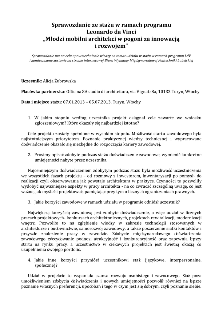 Sprawozdanie ze stażu w ramach programu Leonardo da Vinci „Młodzi mobilni architekci w pogoni za innowacją i rozwojem” Sprawozdanie ma na celu upowszechnienie wiedzy na temat udziału w stażu w ramach programu LdV i zamieszczone zostanie na stronie internetowej Biura Wymiany Międzynarodowej Politechniki Lubelskiej Uczestnik: Alicja Żubrowska Placówka partnerska: Officina 8A studio di architettura, via Vignale 8a, 10132 Turyn, Włochy Data i miejsce stażu: 07.01.2013 – 05.07.2013, Turyn, Włochy 1. W jakim stopniu według uczestnika projekt osiągnął cele zawarte we wniosku zgłoszeniowym? Które okazały się najbardziej istotne? Cele projektu zostały spełnione w wysokim stopniu. Możliwość startu zawodowego była najistotniejszym priorytetem. Poznanie praktycznej wiedzy technicznej i wypracowane doświadczenie okazało się niezbędne do rozpoczęcia kariery zawodowej. 2. Prosimy opisać zdobyte podczas stażu doświadczenie zawodowe, wymienić konkretne umiejętności nabyte przez uczestnika. Najcenniejszym doświadczeniem zdobytym podczas stażu była możliwość uczestniczenia we wszystkich fazach projektu – od rozmowy z inwestorem, inwentaryzacji po pomysł- do realizacji czyli obserwowania jak powstaje architektura w praktyce. Czynności te pozwoliły wydobyć najważniejsze aspekty w pracy architekta - na co zwracać szczególną uwagę, co jest ważne, jak myśleć i projektować, pamiętając przy tym o licznych ograniczeniach prawnych. 3. Jakie korzyści zawodowe w ramach udziału w programie odniósł uczestnik? Największą korzyścią zawodową jest zdobyte doświadczenie, a więc udział w licznych pracach projektowych- konkursach architektonicznych, projektach rewitalizacji, modernizacji wnętrz. Pozwoliło to na zgłębienie wiedzy w zakresie technologii stosowanych w architekturze i budownictwie, samorozwój zawodowy, a także poszerzenie siatki kontaktów i przyszłe znalezienie pracy w zawodzie. Zdobycie międzynarodowego doświadczenia zawodowego zdecydowanie podnosi atrakcyjność i konkurencyjność oraz zapewnia lepszy startu na rynku pracy, a uczestnictwo w ciekawych projektach jest świetną okazją do uzupełnienia swojego portfolio. 4. Jakie inne korzyści przyniósł uczestnikowi staż (językowe, interpersonalne, społeczne)? Udział w projekcie to wspaniała szansa rozwoju osobistego i zawodowego. Staż poza umożliwieniem zdobycia doświadczenia i nowych umiejętności pozwolił również na lepsze poznanie własnych preferencji, upodobań i tego w czym jest się dobrym, czyli poznanie siebie. Zmiana miejsca zamieszkania, całego środowiska pozwoliło doskonalić się, otworzyć na nowe pomysły, spojrzeć trochę pod innym kątem na swoją pracę, a do tego usamodzielnić i nabrać odpowiedzialności. Przebywanie w nowym środowisku nauczyło pracy w grupie, otwartości i umiejętności wyrażania swojego zdania, a ponadto dało możliwość integracji z osobami o podobnych celach i zainteresowaniach. Konieczność posługiwania się językiem obcym w każdej sytuacji znakomicie wpłynęła na jego poprawę, a praca w środowisku technicznym pozwoliła na rozwój zasobu słownictwa specjalistycznego. Poza zdobywaniem doświadczenia i wszelkich związanych z tym umiejętnościami, staż zagraniczny stał się okazją do poznania nowej kultury, zobaczenie inspirujących miejsc, wydarzeń i przeżycia ciekawych emocji. 5. Czy kryteria zastosowane przy wyborze uczestników okazały się adekwatne do postawionych później przed uczestnikiem celów? Cele okazały się zgodne z profilem uczestników, dzięki czemu później trafnie osiągnięte. 6. Czy przygotowanie kulturowo – językowo – pedagogiczne okazało się wystarczające podczas stażu? W jakim stopniu ułatwiło jego organizację i przebieg? Każde z form przygotowania do stażu było pomocne i wyczerpujące. Najbardziej wymiernym okazało się przygotowanie językowe, bo to język obcy zawsze jest największą barierą w kraju goszczącym. Dzięki odbytym lekcjom z języka włoskiego, własnej motywacji w tym zakresie oraz zakupionym środkom dydaktycznym, komunikacja podczas pobytu - w pracy czy w życiu codziennym była płynna i nie tworzyła problemów. Przygotowanie kulturowe pomogło odkryć bogactwo Włoch, zaprogramować liczne wizyty i podróże, a także wykazało różnice kulturowe, których trzeba być świadomym, by móc odnaleźć się i swobodnie poruszać w obcym kraju. Odbyte przed wyjazdem zajęcia z przygotowania pedagogicznego ułatwiły współpracę w grupie, bycie pewnym siebie i śmiałe wyrażanie własnego zdania. Rozwinięte kompetencje miękkie pomogły szczególnie w pracy projektowej nad konkursami, gdzie grupa musiała zmierzyć się z presją czasu i polegać wyłącznie na sobie. 7. Jak przebiegała organizacja podróży oraz organizacja zakwaterowania? Jeszcze przed rozpoczęciem stażu opiekun instytucji przyjmującej zapewnił potrzebne wsparcie w kwestii znalezienia zakwaterowania. Podane zostały niezbędne informacje dotyczące dogodnej lokalizacji, przedział cenowy oraz strony internetowe, przez które można było szukać mieszkania. To instytucja przyjmująca pomogła sfinalizować kwestię zakwaterowania, zorganizowała odbiór stażysty po podróży oraz zapewniła potrzebne przejazdy w czasie trwania stażu. Podróż i ubezpieczenie zorganizowano we własnym zakresie. Wybrano przewóz autokarowy firmy Agat, trasa Lublin-Turyn oraz ubezpieczenie Karta Euro26 World zapewniająca ubezpieczenie od kosztów leczenia i NNW. 8. Jakie doświadczenia zdobyte podczas stażu okazały się najistotniejsze? Doświadczenie zawodowe - czyli praca w biurze architektonicznym okazała się najistotniejsza. Pozwoliła rozwinąć się w zawodzie, we własnej osobowości, a przy okazji w relacjach z innymi. Jej międzynarodowy profil dodatkowo wzbogacił wiedzę językową oraz świadomość kulturalną.