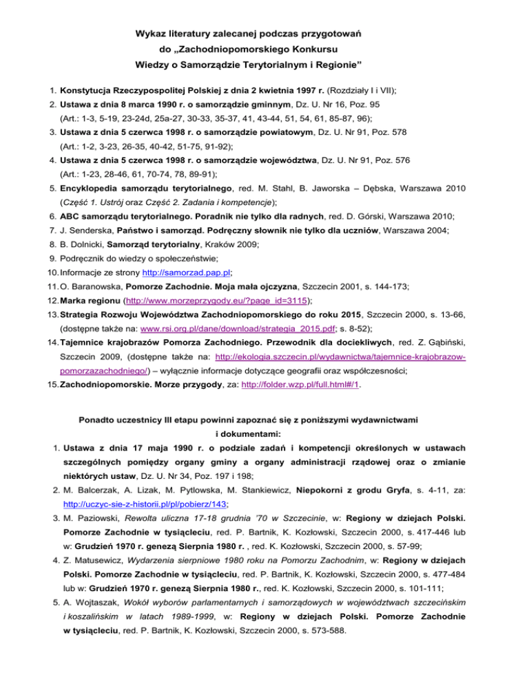 Wykaz literatury zalecanej podczas przygotowań do „Zachodniopomorskiego Konkursu Wiedzy o Samorządzie Terytorialnym i Regionie” 1. Konstytucja Rzeczypospolitej Polskiej z dnia 2 kwietnia 1997 r. (Rozdziały I i VII); 2. Ustawa z dnia 8 marca 1990 r. o samorządzie gminnym, Dz. U. Nr 16, Poz. 95 (Art.: 1-3, 5-19, 23-24d, 25a-27, 30-33, 35-37, 41, 43-44, 51, 54, 61, 85-87, 96); 3. Ustawa z dnia 5 czerwca 1998 r. o samorządzie powiatowym, Dz. U. Nr 91, Poz. 578 (Art.: 1-2, 3-23, 26-35, 40-42, 51-75, 91-92); 4. Ustawa z dnia 5 czerwca 1998 r. o samorządzie województwa, Dz. U. Nr 91, Poz. 576 (Art.: 1-23, 28-46, 61, 70-74, 78, 89-91); 5. Encyklopedia samorządu terytorialnego, red. M. Stahl, B. Jaworska – Dębska, Warszawa 2010 (Część 1. Ustrój oraz Część 2. Zadania i kompetencje); 6. ABC samorządu terytorialnego. Poradnik nie tylko dla radnych, red. D. Górski, Warszawa 2010; 7. J. Senderska, Państwo i samorząd. Podręczny słownik nie tylko dla uczniów, Warszawa 2004; 8. B. Dolnicki, Samorząd terytorialny, Kraków 2009; 9. Podręcznik do wiedzy o społeczeństwie; 10. Informacje ze strony http://samorzad.pap.pl; 11. O. Baranowska, Pomorze Zachodnie. Moja mała ojczyzna, Szczecin 2001, s. 144-173; 12. Marka regionu (http://www.morzeprzygody.eu/?page_id=3115); 13. Strategia Rozwoju Województwa Zachodniopomorskiego do roku 2015, Szczecin 2000, s. 13-66, (dostępne także na: www.rsi.org.pl/dane/download/strategia_2015.pdf; s. 8-52); 14. Tajemnice krajobrazów Pomorza Zachodniego. Przewodnik dla dociekliwych, red. Z. Gąbiński, Szczecin 2009, (dostępne także na: http://ekologia.szczecin.pl/wydawnictwa/tajemnice-krajobrazowpomorzazachodniego/) – wyłącznie informacje dotyczące geografii oraz współczesności; 15. Zachodniopomorskie. Morze przygody, za: http://folder.wzp.pl/full.html#/1. Ponadto uczestnicy III etapu powinni zapoznać się z poniższymi wydawnictwami i dokumentami: 1. Ustawa z dnia 17 maja 1990 r. o podziale zadań i kompetencji określonych w ustawach szczególnych pomiędzy organy gminy a organy administracji rządowej oraz o zmianie niektórych ustaw, Dz. U. Nr 34, Poz. 197 i 198; 2. M. Balcerzak, A. Lizak, M. Pytlowska, M. Stankiewicz, Niepokorni z grodu Gryfa, s. 4-11, za: http://uczyc-sie-z-historii.pl/pl/pobierz/143; 3. M. Paziowski, Rewolta uliczna 17-18 grudnia ’70 w Szczecinie, w: Regiony w dziejach Polski. Pomorze Zachodnie w tysiącleciu, red. P. Bartnik, K. Kozłowski, Szczecin 2000, s. 417-446 lub w: Grudzień 1970 r. genezą Sierpnia 1980 r. , red. K. Kozłowski, Szczecin 2000, s. 57-99; 4. Z. Matusewicz, Wydarzenia sierpniowe 1980 roku na Pomorzu Zachodnim, w: Regiony w dziejach Polski. Pomorze Zachodnie w tysiącleciu, red. P. Bartnik, K. Kozłowski, Szczecin 2000, s. 477-484 lub w: Grudzień 1970 r. genezą Sierpnia 1980 r., red. K. Kozłowski, Szczecin 2000, s. 101-111; 5. A. Wojtaszak, Wokół wyborów parlamentarnych i samorządowych w województwach szczecińskim i koszalińskim w latach 1989-1999, w: Regiony w dziejach Polski. Pomorze Zachodnie w tysiącleciu, red. P. Bartnik, K. Kozłowski, Szczecin 2000, s. 573-588.