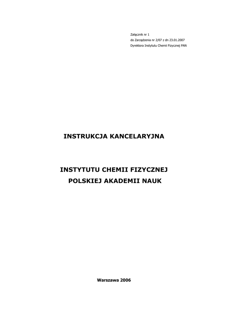 Załącznik nr 1 do Zarządzenia nr 2/07 z dn 23.01.2007 Dyrektora Instytutu Chemii Fizycznej PAN INSTRUKCJA KANCELARYJNA INSTYTUTU CHEMII FIZYCZNEJ POLSKIEJ AKADEMII NAUK Warszawa 2006 Spis treści I. Przepisy ogólne str. 3 II. System kancelaryjny i jednolity rzeczowy wykaz akt III. Podział dokumentacji na kategorie archiwalne str. 5 str. 7 IV. Podział czynności kancelaryjnych i obieg korespondencji w Instytucie str. 8 V. Przyjmowanie wpływów str. 10 VI. Otwieranie i sprawdzanie wpływów str. 11 VII. Rozdzielanie i doręczanie wpływów str. 13 VIII. Rejestracja i znakowanie spraw str. 14 IX. Zakładanie teczek aktowych str. 16 X. Załatwianie spraw i sporządzanie pism str. 17 XI. Podpisywanie pism str. 21 XII. Sporządzanie odpisów pism i dokumentów str. 22 XIII. Wysyłanie pism str. 23 XIV. Przechowywanie akt str. 24 XV. Postępowanie z aktami zawierającymi informacje niejawne stanowiące tajemnicę służbową oznaczoną klauzulą „zastrzeżone” str. 26 XVI. Przekazywanie akt do Archiwum Zakładowego str. 26 XVII. Nadzór nad wykonywaniem czynności kancelaryjnych str. 28 XVIII. Postępowanie z dokumentacją w przypadku reorganizacji Instytutu lub ustania jego działalności str. 29 Wykaz załączników zał. nr 1 – wzór pieczęci wpływu zał. nr 2 – wzór formularza spisu spraw zał. nr 3 – wykaz symboli literowych komórek organizacyjnych Instytutu zał. nr 4 – przykład opisu teczki zał. nr 5 – wzór formularza spisu zdawczo-odbiorczego 2 Rozdział I PRZEPISY OGÓLNE §1 1. Instrukcja kancelaryjna – zwana dalej Instrukcją – określa organizację i tryb wykonywania czynności kancelaryjnych w Instytucie Chemii Fizycznej Polskiej Akademii Nauk – zwanym dalej Instytutem – oraz sposób postępowania z dokumentacją jawną od momentu wytworzenia jej w komórkach organizacyjnych Instytutu lub wpływu do Instytutu do czasu przekazania jej do Archiwum Zakładowego – zwanego dalej Archiwum – lub na makulaturę. 2. Określone w Instrukcji tryb i zasady wykonywania czynności kancelaryjnych zapewniają jednolitość tworzenia, rejestrowania spraw i przechowywania dokumentacji w Instytucie oraz jej ochronę przed uszkodzeniem, zniszczeniem bądź utratą. 3. W postępowaniu z dokumentacją zawierającą informacje niejawne mają zastosowanie odrębne przepisy, z zastrzeżeniem ust. 4. 4. Z dokumentacją opatrzoną klauzulą „zastrzeżone” postępuje się według niniejszej Instrukcji. §2 Terminy użyte w Instrukcji oznaczają: dokument – uwierzytelnione pismo ustanawiające lub stwierdzające stan prawny albo służące do realizacji określonych uprawnień; dokumentacja – wszelkie dokumenty, korespondencję, dokumentację finansową, kadrową, techniczną, statystyczną, kartograficzną, niezależnie od techniki jej wykonania i utrwalenia (rękopisy, maszynopisy, wydruki komputerowe, fotografie, mapy i plany, taśmy magnetyczne, nośniki elektroniczne itp.); Dyrektor – osobę kierującą Instytutem Chemii Fizycznej PAN; komórka organizacyjna – zakład, dział, pracownię lub samodzielne stanowisko pracy powołane do realizacji zadań ustalonych w regulaminie organizacyjnym; 3 komórka macierzysta - komórkę organizacyjną, do zadań której należy ostateczne pod względem merytorycznym opracowanie danej sprawy i która powinna posiadać całość materiałów (akt) w tym zakresie; komórka inna niż macierzysta – komórkę organizacyjną, w której występują akta należące do tej samej klasy wykazu akt, co w komórce merytorycznej, lecz stanowią one jedynie materiały pomocnicze, cząstkowe lub powtarzalne; referent sprawy - pracownika załatwiającego merytorycznie daną sprawę lub przygotowującego wnioski do decyzji przełożonych i przechowującego dokumentację sprawy w czasie jej załatwiania; sekretariat - stanowisko pracy wykonujące obsługę sekretarską Instytutu; kancelaria – dział zajmujący się odbiorem korespondencji przychodzącej i ekspedycją przesyłek wychodzących; sprawa - zdarzenie lub stan rzeczy, a także pismo, dokument, wymagające rozpatrzenia i podjęcia czynności służbowych; akta sprawy - całą dokumentację zawierającą informacje, które były, są lub mogą być istotne przy załatwianiu danej sprawy; korespondencja - każde pismo wpływające do Instytutu Chemii Fizycznej PAN lub wysyłane przez Instytut; przesyłka – dokumenty, telegramy, faksy oraz pakiety, paczki itp. otrzymywane i wysyłane za pośrednictwem poczty, kuriera itp.; wpływ – każdą przesyłkę otrzymaną przez Instytut; pieczęć urzędowa - pieczęć okrągłą z wizerunkiem orła pośrodku i pełną nazwą Instytutu w otoku; pieczęć - stemple nagłówkowe, imienne, wpływu itp.; wykaz akt – wykaz haseł rzeczowych akt, oznaczonych symbolami klasyfikacyjnymi i kwalifikacją archiwalną akt; spis spraw - formularz służący do chronologicznego rejestrowania spraw wpływających lub rozpoczętych w Instytucie, prowadzony odrębnie dla poszczególnych grup spraw; czystopis – tekst dokumentu w postaci ostatecznej, przygotowany do podpisu przez wystawcę; znak sprawy - zespół symboli oznaczających przynależność sprawy do określonej komórki organizacyjnej oraz określonej grupy spraw wraz z numerem, pod którym sprawa została zarejestrowana w spisie spraw; 4 teczka aktowa - teczkę wiązaną, segregator, skoroszyt itp., służące do przechowywania jednorodnych lub rzeczowo pokrewnych akt spraw ostatecznie załatwionych, objętych tą samą grupą akt, ustaloną wykazem akt, i stanowiącą odrębną jednostkę archiwalną. Rozdział II SYSTEM KANCELARYJNY I JEDNOLITY RZECZOWY WYKAZ AKT §3 1. W Instytucie Chemii Fizycznej PAN obowiązuje bezdziennikowy system kancelaryjny, którego podstawą jest jednolity rzeczowy wykaz akt – zwany dalej wykazem akt – stanowiący załącznik nr 2 do zarządzenia Dyrektora Instytutu Chemii Fizycznej. 2. W systemie bezdziennikowym rejestracji w spisach spraw prowadzo
