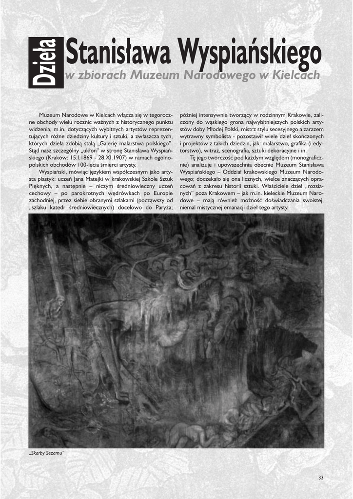 Dzie³a Stanis³awa Wyspiañskiego w zbiorach Muzeum Narodowego w Kielcach Muzeum Narodowe w Kielcach w³¹cza siê w tegoroczne obchody wielu rocznic wa¿nych z historycznego punktu widzenia, m.in. dotycz¹cych wybitnych artystów reprezentuj¹cych ró¿ne dziedziny kultury i sztuki, a zw³aszcza tych, których dzie³a zdobi¹ sta³¹ „Galeriê malarstwa polskiego”. St¹d nasz szczególny „uk³on” w stronê Stanis³awa Wyspiañskiego (Kraków: 15.I.1869 - 28.XI.1907) w ramach ogólnopolskich obchodów 100-lecia œmierci artysty. Wyspiañski, mówi¹c jêzykiem wspó³czesnym jako artysta plastyk: uczeñ Jana Matejki w krakowskiej Szkole Sztuk Piêknych, a nastêpnie – niczym œredniowieczny uczeñ cechowy – po parokrotnych wêdrówkach po Europie zachodniej, przez siebie obranymi szlakami (pocz¹wszy od „szlaku katedr œredniowiecznych) docelowo do Pary¿a; póŸniej intensywnie tworz¹cy w rodzinnym Krakowie, zaliczony do w¹skiego grona najwybitniejszych polskich artystów doby M³odej Polski, mistrz stylu secesyjnego a zarazem wytrawny symbolista - pozostawi³ wiele dzie³ skoñczonych i projektów z takich dziedzin, jak: malarstwo, grafika (i edytorstwo), witra¿, scenografia, sztuki dekoracyjne i in. Tê jego twórczoœæ pod ka¿dym wzglêdem (monograficznie) analizuje i upowszechnia obecnie Muzeum Stanis³awa Wyspiañskiego – Oddzia³ krakowskiego Muzeum Narodowego; doczeka³o siê ona licznych, wielce znacz¹cych opracowañ z zakresu historii sztuki. W³aœciciele dzie³ „rozsianych” poza Krakowem – jak m.in. kieleckie Muzeum Narodowe – maj¹ równie¿ mo¿noœæ doœwiadczania swoistej, niemal mistycznej emanacji dzie³ tego artysty. „Skarby Sezamu” 33 Wyspiañski studiowa³ w czasach króluj¹cego nadal w Krakowie, dawnej stolicy Polski, historyzmu maj¹cego mocne oparcie zarówno w wyk³adowcach Uniwersytetu Jagielloñskiego (w którym Wyspiañski studiowa³ polonistykê), jak i w œrodowisku artystów. Matejko powodowany patriotyzmem rzutuj¹cym bez reszty na jego zainteresowania zawodowe stworzy³ sugestywn¹ „panoramê” historii Polski w swoich obrazach opieraj¹c siê na studiach nad zabytkami: pocz¹wszy od monumentalnych po drobne (ci¿my, pierœcienie, koronki...) – zawsze jednak eksponuj¹c postaæ ludzk¹ i to jako studium psychologiczne. Jego wybitni uczniowiesymboliœci, tacy jak Jacek Malczewski, czy w³aœnie Wyspiañski – bêd¹c momentami w opozycji wobec Matejki w sprawach sztuki (stylów artystycznych) – kontynuowali jego najistotniejsze idee. Wybieraj¹c „szlak” symbolizmu nadawali wybranym przez siebie motywom znaczenie jakby „przerastaj¹ce” wygl¹d, formê – co prowadzi do z³o¿onych interpretacji po dziœ dzieñ. Proces ten zachodzi³ u Wyspiañskiego, urodzonego poety-romantyka, bardzo naturalnie: i w twórczoœci literackiej (poetyckiej, dramatycznej), i plastycznej. Wyspiañski „widzia³ Polskê ogromn¹ – duchem”, pomimo przegranych powstañ narodowych i zagubienia „z³otego rogu” („Wesele”, 1901), siêgaj¹c „po oparcie” do korzeni cywilizacji europejskiej – do mitów staro¿ytnej Grecji (jak czyni³ to równie¿ chêtnie wspomniany Malczewski; obydwu fascynowa³ m.in. „Mit Apolloñski”) i tradycji s³owiañskiej, pra-polskiej. Jak przysta³o na modernistê m³odopolskiego studiowa³ tak¿e przyrodê „wyczuwaj¹c” w niej panteistycznego ducha, ³¹cz¹c to z potrzebami wzornikowymi czysto artystycznymi. „Portret Elizy Pareñskiej” 34 Portret podwójny Elizy-Lizki Pareñskiej (zaginiony) Studiowa³ zw³aszcza z upodobaniem florê w najdrobniejszych szczegó³ach, czego œladem s¹ jego motywy ornamentalne. Postaæ ludzk¹ traktowa³ dwojako: osobno tworz¹c ekspresyjne wizje wielkich przodków, a osobno studia portretowane „z modela” – wychwytuj¹c ich charakterystyczne pozy i wyrazy twarzy jak przysta³o na nieugiêtego malarzapsychologa (st¹d œwietne wizerunki naturalnie zachowuj¹cych siê dzieci). Tegoroczne krakowskie pokazy na temat Wyspiañskiego spinaj¹ te biegunowo ró¿ne tendencje jego twórczoœci: w Muzeum Stanis³awa Wyspiañskiego – obok sta³ej ekspozycji – czasowa wystawa „Zielnik Wyspiañskiego”, a z inicjatywy Andrzeja Wajdy w nowopowsta³ym „Pawilonie witra¿y Wyspiañskiego” – monumentalne, obecnie wykonane (co wzbudza komentarze i dyskusje) witra¿e wg oryginalnych projektów artysty, na których widniej¹ ogromne, odmaterializowane postacie – „relikwie”: dwóch polskich Piastów panuj¹cych: Henryka Pobo¿nego [pod Legnic¹!] i Kazimierza Wielkiego oraz œw. Stanis³awa Biskupa. Wyspiañski pragn¹³ je widzieæ zdobi¹ce katedrê wawelsk¹... Artysta, jak wiadomo, chêtnie pracowa³ dla potrzeb krakowskiego Towarzystwa Lekarskiego, dla restaurowanych krakowskich koœcio³ów OO Dominikanów i Franciszkanów, ale zmar³ z niezrealizowanym marzeniem utworzenia i przyozdobienia „WaweluAkropolu” w odrodzonej Polsce. O tym jego i innych patriotów wielkim marzeniu nie zapomniano, znaleŸli siê nastêpcy – kontynuatorzy idei. Kieleckie Muzeum Narodowe posiada na w³asnoœæ piêæ dzie³ Wyspiañskiego, które dobitnie œwiadcz¹ o rozwoju twórczym artysty i jego zainteresowaniach malarskich. Najstarszy jest szkic na kalce jednego z witra¿y do krakowskiego Koœcio³a Mariackiego, o tematyce pasyjnej – „Zdjêcie z krzy¿a”, wykonany wraz z Józefem Mehofferem ok. 1890 r., jeszcze pod okiem Jana Matejki odpowiedzialnego wówczas za restauracjê wnêtrza tej kolegiaty. Tematyka religijna z pewnoœci¹ ugruntowa³a u Wyspiañskiego (a tak¿e u Mehoffera) potrzebê re¿imu w interpretowaniu podejmowanych tematów na sposób alegoryczny, symboliczny. W po³owie lat 90. XIX w. Wyspiañski wykona³ ju¿ samodzielnie m.in. projekt motywu kwiatu wodnego – „Kaczeñce”, jednego z wielu elementów do polichromii krakowskiego koœcio³a OO Franciszkanów, skorelowanej z Czterema ¯ywio³ami na witra¿ach w tym samym k