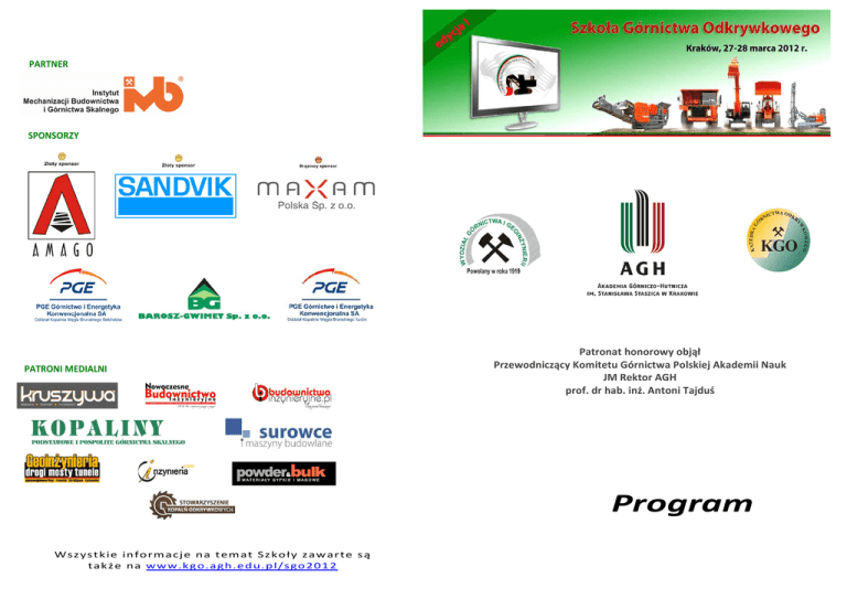 PARTNER SPONSORZY PATRONI MEDIALNI Patronat honorowy objął Przewodniczący Komitetu Górnictwa Polskiej Akademii Nauk JM Rektor AGH prof. dr hab. inż. Antoni Tajduś najlepszych warunków uczestnictwa gościom VIP bardzo prosimy o potwierdzenie przybycia do dnia 3 września 2010 na adres: [email protected], tel. 12/ 617 44 90, 603 915 445. Program Wszystkie informacje na temat Szkoły zawarte są także na www.kgo.agh.edu.pl/sgo2012 Program Szkoły Górnictwa Odkrywkowego 2012 DZIEŃ 1 (27 MARCA 2012, AGH KRAKÓW, PAWILON U2, UL. REYMONTA 7, KRAKÓW) DZIEŃ 2 (28 MARCA 2012, AGH KRAKÓW, PAWILON U2, UL. REYMONTA 7, KRAKÓW) 9.00 – 10.00 Rejestracja uczestników 9.30 – 9.45 10.00 – 10.30 Powitanie uczestników i otwarcie obrad Prezentacja Złotego Sponsora (AMAGO Sp. z o.o.) Prezentacja Złotego Sponsora (Sandvik Mining and Construction Sp. z o.o.) 10.30 – 12.30 Nowoczesne metody pozyskiwania danych geoprzestrzennych do projektowania i prowadzenia ruchu odkrywkowego zakładu górniczego Prezentacja Instytutu Mechanizacji Budownictwa i Górnictwa Skalnego (Stefan Góralczyk, IMBiGS) Interaktywny poradnik do sporządzania Programu Gospodarowania Odpadami Wydobywczymi jako narzędzie wspomagające prowadzenie ruchu zakładu górniczego (Ireneusz Baic, IMBiGS) 9.45 – 11.10 Prezentacja firmy Maxam Polska Sp. z o.o. Przerwa kawowa Przerwa kawowa Analiza możliwości zastosowania naziemnej interferometrii radarowej do wykrywania deformacji skarp (Anna Szafarczyk, AGH Kraków) Wykorzystanie cyfrowej fotogrametrii naziemnej do aktualizacji mapy numerycznej wyrobiska górniczego w Zakładzie Górniczym KWB „Bełchatów” (Anna Gawin, Dawid Olczyk, PGE GiEK S.A. Oddział KWB Bełchatów) 12.30 – 13.40 11.10 – 13.30 Modelowanie złóż kopalin stałych geostatystycznymi metodami 2D i 3D (Jacek Mucha, Monika Wasilewska-Błaszczyk, AGH Kraków) Modelowanie złóż kruszyw naturalnych na przykładzie złoża piasku, przy pomocy oprogramowania GeoPlan (Michał Szepietowski, Jan Szymański, Soft-Projekt) Przestrzenny model złoża na przykładzie Zakładu Górniczego KWB „Turów”. Wczoraj i dziś. (Michał Kłos, PRGW Sp. z o.o.) Satelitarny system śledzenia maszyn KOMATSU – KOMTRAX (Andrzej Tokarczyk, KOMATSU Poland Sp. z o.o.) Modelowanie złoża węgla brunatnego Bełchatów dla potrzeb planowania górniczego i racjonalnej gospodarki złożem (Waldemar Jończyk, PGE GiEK S.A. Oddział KWB Bełchatów) Obiad 15.00 – 18.10 Nowoczesne rozwiązania informatyczne wspomagające projektowanie kopalń odkrywkowych i prowadzenie ruchu zakładu górniczego Prowadzenie ruchu zakładu górniczego w oparciu o oprogramowanie Minescape na przykładzie Zakładu Górniczego KWB „Bełchatów” (Edward Sośniak, PGE GiEK S.A. Oddział KWB Bełchatów) Zasady efektywnego doboru maszyn w układach cyklicznych Metody efektywnego doboru młotów hydraulicznych, wiertarek i wiertnic w kopalniach odkrywkowych (Artur Bęben, AGH Kraków) Dobór metod urabiania i transportu bloków skalnych w kopalniach odkrywkowych (Marek Wiącek, Dariusz Sobala, AMAGO Sp. z o.o., Zbigniew Kasztelewicz, AGH Kraków) Metody doboru sprzętu mobilnego w odkrywkowych zakładach górniczych (Błażej Muzykiewicz, Lafarge Cement S.A., Andrzej Tokarczyk, KOMATSU Poland Sp. z o.o.) Urabianie margli kredowych za pomocą spycharko-zrywarki KOMATSU D475A-5 w kopalni Folwark (Joachim Wilczek, Górażdże Cement S.A., Andrzej Tokarczyk, KOMATSU Poland Sp. z o.o.) Nowoczesne metody modelowania złóż kopalin 13.40 – 15.00 Zasady efektywnego doboru maszyn w układach ciągłych Zasady optymalnego doboru koparek wielonaczyniowych dla kopalń górnictwa odkrywkowego (Zbigniew Kasztelewicz, AGH Kraków) Zasady doboru technologii wydobycia utworów trudno urabianych w kopalniach odkrywkowych (Wiesław Kozioł, Łukasz Machniak, AGH Kraków) Metody efektywnego doboru urządzeń czyszczących i sterujących dla przenośnika taśmowego (Aleksander Słupik, MAS Sp. z o.o.) Przegląd zagadnień przetwarzania geologiczno-górniczych danych przestrzennych w kontekście Dyrektywy INSPIRE (Artur Krawczyk, AGH Kraków) Lotniczy skaning laserowy uniwersalnym źródłem pozyskiwania danych dla prowadzenia ruchu odkrywkowego zakładu górniczego (Łukasz Sławik, MGGP Aero Sp. z o.o.) Metoda wykorzystania skaningu laserowego dla identyfikacji partii blocznych złoża granodiorytu (Szymon Modrzejewski, Magda Mania, Poltegor-Instytut) Tworzenie map górniczych na przykładzie oprogramowania Geolisp (Marian Poniewiera, Geo-lisp) Prezentacja Partnera SGO Dobór maszyn do Kopalni Melafiru „Tłumaczów” (Jarosław Wojtanowski, Bergerat Monnoyeur Sp. z o.o.) Monitorowanie pracy maszyn w górnictwie odkrywkowym na przykładzie CARETRACK (Paweł Chmielewski, Volvo Maszyny Budowlane Polska Sp. z o.o.) Analiza parametrów pracy i doboru maszyn jako kryterium optymalizacji wydajności i kosztów (Paweł Chmielewski, Volvo Maszyny Budowlane Polska Sp.z o.o.) Dobór układów wydobywczych złożonych z koparek jednonaczyniowych i samochodów technologicznych o dużych wydajnościach dla krajowych kopalń odkrywkowych (Marceli Bednarek, Liebherr-Polska Sp. z o.o.) 13.30 – 14.30 Obiad 14.30 – 16.00 Projektowanie optymalnego zakładu przeróbczego Prezentacja firmy „Ventyx” Zastosowanie programu Gemcom Surpac do projektowania kopalń odkrywkowych w grupie Holcim (Paweł Kawalec, Holcim Group Support Ltd) Planowanie i harmonogramowanie produkcji górniczej przy pomocy programu SoftMine Eksploatacja na przykładzie Zakładu Górniczego KWB „Turów” (Marek Praski, PRGW Sp. z o.o.) Wspomaganie prowadzenia ewidencji gruntów i budynków oraz realizacji zadań działu ochrony środowiska w kopalni odkrywkowej (Grzegorz Bida, PRGW Sp. z o.o.) Rola Centralnej Bazy Danych w Systemie Zarządzania Złożem na przykładzie Zakładu Górniczego KWB „Turów” (Mirosław Makos, PGE GiEK S.A. Oddział KWB Turów, Leszek Wachelka, PRGW Sp. z o.o.) Zasady e