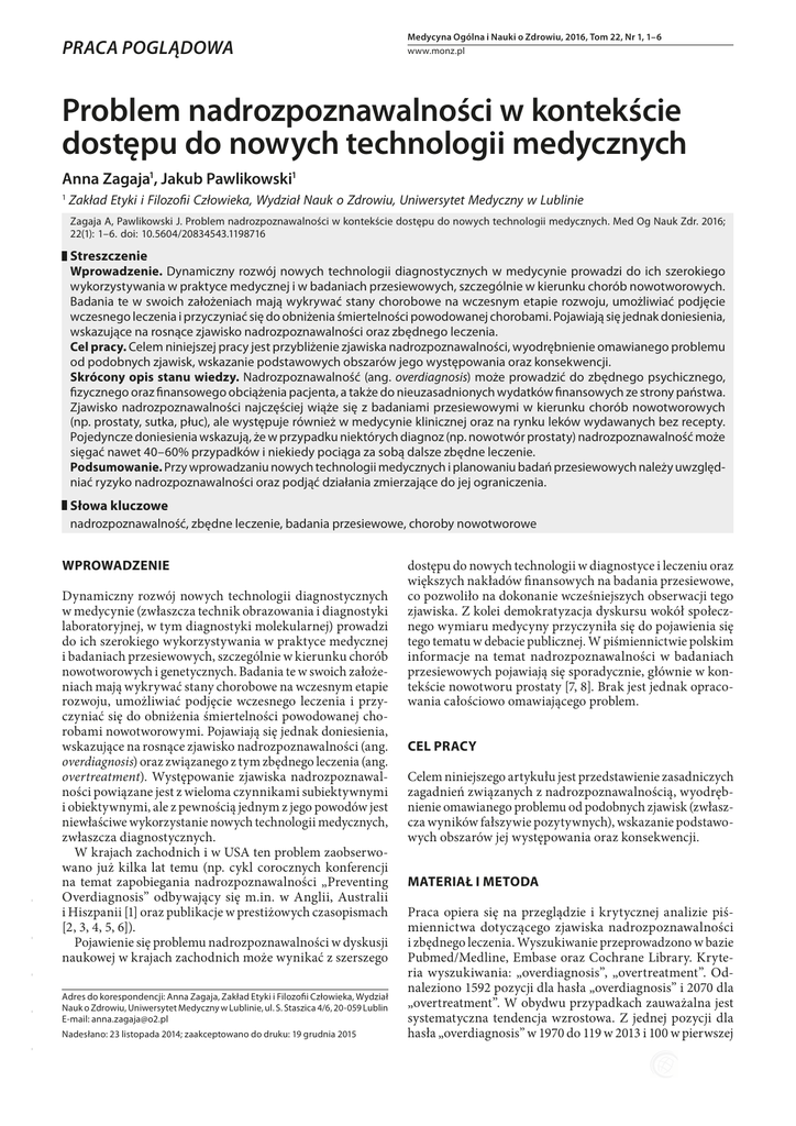 PRACA POGLĄDOWA Medycyna Ogólna i Nauki o Zdrowiu, 2016, Tom 22, Nr 1, 1–6 www.monz.pl Problem nadrozpoznawalności w kontekście dostępu do nowych technologii medycznych Anna Zagaja1, Jakub Pawlikowski1 Zakład Etyki i Filozofii Człowieka, Wydział Nauk o Zdrowiu, Uniwersytet Medyczny w Lublinie 1 Zagaja A, Pawlikowski J. Problem nadrozpoznawalności w kontekście dostępu do nowych technologii medycznych. Med Og Nauk Zdr. 2016; 22(1): 1–6. doi: 10.5604/20834543.1198716 Streszczenie Wprowadzenie. Dynamiczny rozwój nowych technologii diagnostycznych w medycynie prowadzi do ich szerokiego wykorzystywania w praktyce medycznej i w badaniach przesiewowych, szczególnie w kierunku chorób nowotworowych. Badania te w swoich założeniach mają wykrywać stany chorobowe na wczesnym etapie rozwoju, umożliwiać podjęcie wczesnego leczenia i przyczyniać się do obniżenia śmiertelności powodowanej chorobami. Pojawiają się jednak doniesienia, wskazujące na rosnące zjawisko nadrozpoznawalności oraz zbędnego leczenia. Cel pracy. Celem niniejszej pracy jest przybliżenie zjawiska nadrozpoznawalności, wyodrębnienie omawianego problemu od podobnych zjawisk, wskazanie podstawowych obszarów jego występowania oraz konsekwencji. Skrócony opis stanu wiedzy. Nadrozpoznawalność (ang. overdiagnosis) może prowadzić do zbędnego psychicznego, fizycznego oraz finansowego obciążenia pacjenta, a także do nieuzasadnionych wydatków finansowych ze strony państwa. Zjawisko nadrozpoznawalności najczęściej wiąże się z badaniami przesiewowymi w kierunku chorób nowotworowych (np. prostaty, sutka, płuc), ale występuje również w medycynie klinicznej oraz na rynku leków wydawanych bez recepty. Pojedyncze doniesienia wskazują, że w przypadku niektórych diagnoz (np. nowotwór prostaty) nadrozpoznawalność może sięgać nawet 40–60% przypadków i niekiedy pociąga za sobą dalsze zbędne leczenie. Podsumowanie. Przy wprowadzaniu nowych technologii medycznych i planowaniu badań przesiewowych należy uwzględniać ryzyko nadrozpoznawalności oraz podjąć działania zmierzające do jej ograniczenia. Słowa kluczowe nadrozpoznawalność, zbędne leczenie, badania przesiewowe, choroby nowotworowe Dynamiczny rozwój nowych technologii diagnostycznych w medycynie (zwłaszcza technik obrazowania i diagnostyki laboratoryjnej, w tym diagnostyki molekularnej) prowadzi do ich szerokiego wykorzystywania w praktyce medycznej i badaniach przesiewowych, szczególnie w kierunku chorób nowotworowych i genetycznych. Badania te w swoich założeniach mają wykrywać stany chorobowe na wczesnym etapie rozwoju, umożliwiać podjęcie wczesnego leczenia i przyczyniać się do obniżenia śmiertelności powodowanej chorobami nowotworowymi. Pojawiają się jednak doniesienia, wskazujące na rosnące zjawisko nadrozpoznawalności (ang. overdiagnosis) oraz związanego z tym zbędnego leczenia (ang. overtreatment). Występowanie zjawiska nadrozpoznawalności powiązane jest z wieloma czynnikami subiektywnymi i obiektywnymi, ale z pewnością jednym z jego powodów jest niewłaściwe wykorzystanie nowych technologii medycznych, zwłaszcza diagnostycznych. W krajach zachodnich i w USA ten problem zaobserwowano już kilka lat temu (np. cykl corocznych konferencji na temat zapobiegania nadrozpoznawalności „Preventing Overdiagnosis” odbywający się m.in. w Anglii, Australii i Hiszpanii [1] oraz publikacje w prestiżowych czasopismach [2, 3, 4, 5, 6]). Pojawienie się problemu nadrozpoznawalności w dyskusji naukowej w krajach zachodnich może wynikać z szerszego - - - - WPROWADZENIE Adres do korespondencji: Anna Zagaja, Zakład Etyki i Filozofii Człowieka, Wydział Nauk o Zdrowiu, Uniwersytet Medyczny w Lublinie, ul. S. Staszica 4/6, 20-059 Lublin E-mail: [email protected] - Nadesłano: 23 listopada 2014; zaakceptowano do druku: 19 grudnia 2015 dostępu do nowych technologii w diagnostyce i leczeniu oraz większych nakładów finansowych na badania przesiewowe, co pozwoliło na dokonanie wcześniejszych obserwacji tego zjawiska. Z kolei demokratyzacja dyskursu wokół społecznego wymiaru medycyny przyczyniła się do pojawienia się tego tematu w debacie publicznej. W piśmiennictwie polskim informacje na temat nadrozpoznawalności w badaniach przesiewowych pojawiają się sporadycznie, głównie w kontekście nowotworu prostaty [7, 8]. Brak jest jednak opracowania całościowo omawiającego problem. CEL PRACY Celem niniejszego artykułu jest przedstawienie zasadniczych zagadnień związanych z nadrozpoznawalnością, wyodrębnienie omawianego problemu od podobnych zjawisk (zwłaszcza wyników fałszywie pozytywnych), wskazanie podstawowych obszarów jej występowania oraz konsekwencji. MATERIAŁ I METODA Praca opiera się na przeglądzie i krytycznej analizie piśmiennictwa dotyczącego zjawiska nadrozpoznawalności i zbędnego leczenia. Wyszukiwanie przeprowadzono w bazie Pubmed/Medline, Embase oraz Cochrane Library. Kryteria wyszukiwania: „overdiagnosis”, „overtreatment”. Odnaleziono 1592 pozycji dla hasła „overdiagnosis” i 2070 dla „overtreatment”. W obydwu przypadkach zauważalna jest systematyczna tendencja wzrostowa. Z jednej pozycji dla hasła „overdiagnosis” w 1970 do 119 w 2013 i 100 w pierwszej 2 Medycyna Ogólna i Nauki o Zdrowiu, 2016, Tom 22, Nr 1 Anna Zagaja, Jakub Pawlikowski. Problem nadrozpoznawalności w kontekście dostępu do nowych technologii medycznych połowie 2014 roku. Z jednej pozycji dla „overtreatment” w 1929 do 236 w 2013 i 136 w pierwszej połowie 2014. Zauważalna jest również zmiana pojmowania hasła „overtreatment”, które w pierwszej połowie XX wieku dotyczyło ilości stosowanego leku, natomiast w drugiej połowie zaczęło być rozumiane jako konsekwencja nadrozpoznawalności. OPIS STANU WIEDZY - - - - - Nadrozpoznawalność polega na rozpoznawaniu stanów chorobowych sugerujących poważniejszą sytuację kliniczną niż wskazyw