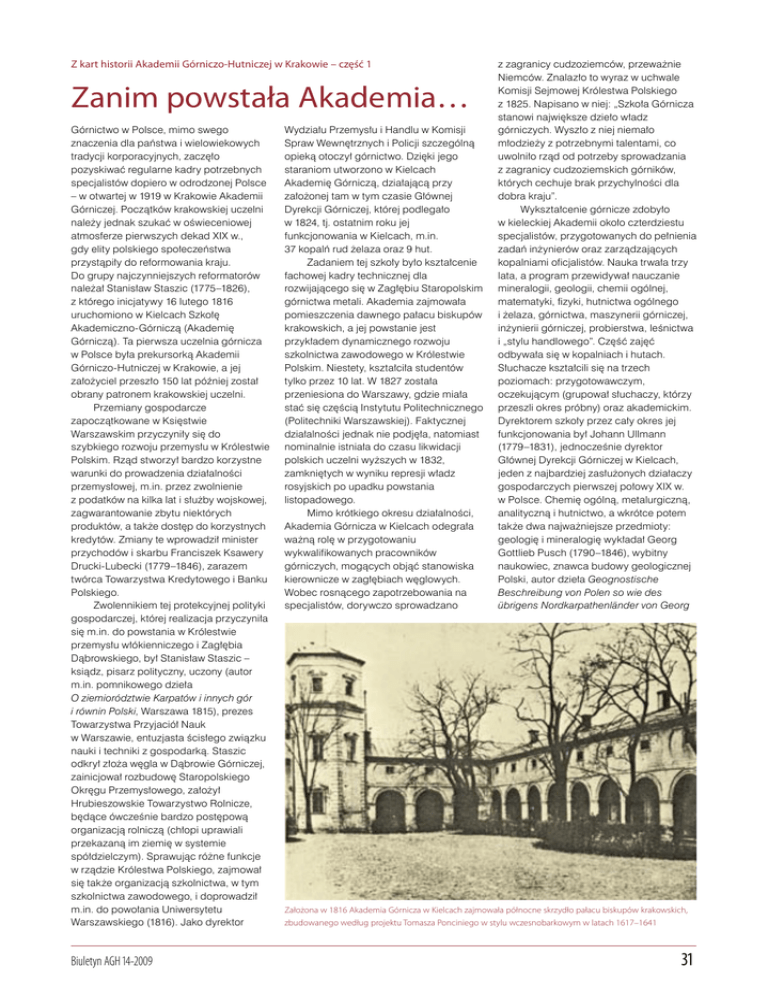 Z kart historii Akademii Górniczo-Hutniczej w Krakowie – część 1 Zanim powstała Akademia… Górnictwo w Polsce, mimo swego znaczenia dla państwa i wielowiekowych tradycji korporacyjnych, zaczęło pozyskiwać regularne kadry potrzebnych specjalistów dopiero w odrodzonej Polsce – w otwartej w 1919 w Krakowie Akademii Górniczej. Początków krakowskiej uczelni należy jednak szukać w oświeceniowej atmosferze pierwszych dekad XIX w., gdy elity polskiego społeczeństwa przystąpiły do reformowania kraju. Do grupy najczynniejszych reformatorów należał Stanisław Staszic (1775–1826), z którego inicjatywy 16 lutego 1816 uruchomiono w Kielcach Szkołę Akademiczno-Górniczą (Akademię Górniczą). Ta pierwsza uczelnia górnicza w Polsce była prekursorką Akademii Górniczo-Hutniczej w Krakowie, a jej założyciel przeszło 150 lat później został obrany patronem krakowskiej uczelni. Przemiany gospodarcze zapoczątkowane w Księstwie Warszawskim przyczyniły się do szybkiego rozwoju przemysłu w Królestwie Polskim. Rząd stworzył bardzo korzystne warunki do prowadzenia działalności przemysłowej, m.in. przez zwolnienie z podatków na kilka lat i służby wojskowej, zagwarantowanie zbytu niektórych produktów, a także dostęp do korzystnych kredytów. Zmiany te wprowadził minister przychodów i skarbu Franciszek Ksawery Drucki-Lubecki (1779–1846), zarazem twórca Towarzystwa Kredytowego i Banku Polskiego. Zwolennikiem tej protekcyjnej polityki gospodarczej, której realizacja przyczyniła się m.in. do powstania w Królestwie przemysłu włókienniczego i Zagłębia Dąbrowskiego, był Stanisław Staszic – ksiądz, pisarz polityczny, uczony (autor m.in. pomnikowego dzieła O ziemiorództwie Karpatów i innych gór i równin Polski, Warszawa 1815), prezes Towarzystwa Przyjaciół Nauk w Warszawie, entuzjasta ścisłego związku nauki i techniki z gospodarką. Staszic odkrył złoża węgla w Dąbrowie Górniczej, zainicjował rozbudowę Staropolskiego Okręgu Przemysłowego, założył Hrubieszowskie Towarzystwo Rolnicze, będące ówcześnie bardzo postępową organizacją rolniczą (chłopi uprawiali przekazaną im ziemię w systemie spółdzielczym). Sprawując różne funkcje w rządzie Królestwa Polskiego, zajmował się także organizacją szkolnictwa, w tym szkolnictwa zawodowego, i doprowadził m.in. do powołania Uniwersytetu Warszawskiego (1816). Jako dyrektor Biuletyn AGH 14-2009 Wydziału Przemysłu i Handlu w Komisji Spraw Wewnętrznych i Policji szczególną opieką otoczył górnictwo. Dzięki jego staraniom utworzono w Kielcach Akademię Górniczą, działającą przy założonej tam w tym czasie Głównej Dyrekcji Górniczej, której podlegało w 1824, tj. ostatnim roku jej funkcjonowania w Kielcach, m.in. 37 kopalń rud żelaza oraz 9 hut. Zadaniem tej szkoły było kształcenie fachowej kadry technicznej dla rozwijającego się w Zagłębiu Staropolskim górnictwa metali. Akademia zajmowała pomieszczenia dawnego pałacu biskupów krakowskich, a jej powstanie jest przykładem dynamicznego rozwoju szkolnictwa zawodowego w Królestwie Polskim. Niestety, kształciła studentów tylko przez 10 lat. W 1827 została przeniesiona do Warszawy, gdzie miała stać się częścią Instytutu Politechnicznego (Politechniki Warszawskiej). Faktycznej działalności jednak nie podjęła, natomiast nominalnie istniała do czasu likwidacji polskich uczelni wyższych w 1832, zamkniętych w wyniku represji władz rosyjskich po upadku powstania listopadowego. Mimo krótkiego okresu działalności, Akademia Górnicza w Kielcach odegrała ważną rolę w przygotowaniu wykwalifikowanych pracowników górniczych, mogących objąć stanowiska kierownicze w zagłębiach węglowych. Wobec rosnącego zapotrzebowania na specjalistów, dorywczo sprowadzano z zagranicy cudzoziemców, przeważnie Niemców. Znalazło to wyraz w uchwale Komisji Sejmowej Królestwa Polskiego z 1825. Napisano w niej: „Szkoła Górnicza stanowi największe dzieło władz górniczych. Wyszło z niej niemało młodzieży z potrzebnymi talentami, co uwolniło rząd od potrzeby sprowadzania z zagranicy cudzoziemskich górników, których cechuje brak przychylności dla dobra kraju”. Wykształcenie górnicze zdobyło w kieleckiej Akademii około czterdziestu specjalistów, przygotowanych do pełnienia zadań inżynierów oraz zarządzających kopalniami oficjalistów. Nauka trwała trzy lata, a program przewidywał nauczanie mineralogii, geologii, chemii ogólnej, matematyki, fizyki, hutnictwa ogólnego i żelaza, górnictwa, maszynerii górniczej, inżynierii górniczej, probierstwa, leśnictwa i „stylu handlowego”. Część zajęć odbywała się w kopalniach i hutach. Słuchacze kształcili się na trzech poziomach: przygotowawczym, oczekującym (grupował słuchaczy, którzy przeszli okres próbny) oraz akademickim. Dyrektorem szkoły przez cały okres jej funkcjonowania był Johann Ullmann (1779–1831), jednocześnie dyrektor Głównej Dyrekcji Górniczej w Kielcach, jeden z najbardziej zasłużonych działaczy gospodarczych pierwszej połowy XIX w. w Polsce. Chemię ogólną, metalurgiczną, analityczną i hutnictwo, a wkrótce potem także dwa najważniejsze przedmioty: geologię i mineralogię wykładał Georg Gottlieb Pusch (1790–1846), wybitny naukowiec, znawca budowy geologicznej Polski, autor dzieła Geognostische Beschreibung von Polen so wie des übrigens Nordkarpathenländer von Georg Założona w 1816 Akademia Górnicza w Kielcach zajmowała północne skrzydło pałacu biskupów krakowskich, zbudowanego według projektu Tomasza Ponciniego w stylu wczesnobarkowym w latach 1617–1641 31 Gottlieb Pusch (Stuttgart 1833, cz. 1; 1836, cz. 2). Wraz ze wzrostem produkcji przemysłowej w kolejnych dekadach XIX w., Polska odrabiała zacofanie gospodarcze, szczególnie z pierwszej połowy stulecia. Pod koniec wieku produkcja na ziemiach polskich zwiększyła się prawie czterokrotn