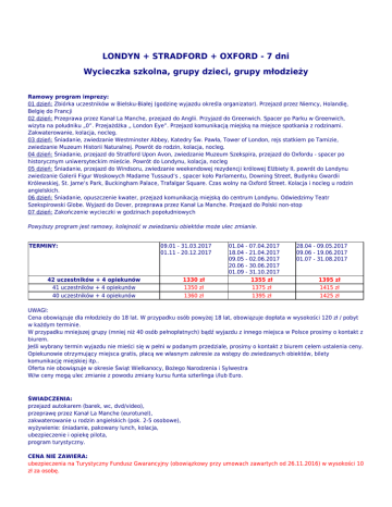 LONDYN + STRADFORD + OXFORD - 7 dni Wycieczka szkolna, grupy dzieci, grupy młodzieży Ramowy program imprezy: 01 dzień: Zbiórka uczestników w Bielsku-Białej (godzinę wyjazdu określa organizator). Przejazd przez Niemcy, Holandię, Belgię do Francji 02 dzień: Przeprawa przez Kanał La Manche, przejazd do Anglii. Przyjazd do Greenwich. Spacer po Parku w Greenwich, wizyta na południku „0”. Przejażdżka „ London Eye”. Przejazd komunikacją miejską na miejsce spotkania z rodzinami. Zakwaterowanie, kolacja, nocleg. 03 dzień: Śniadanie, zwiedzanie Westminster Abbey, Katedry Św. Pawła, Tower of London, rejs statkiem po Tamizie, zwiedzanie Muzeum Historii Naturalnej. Powrót do rodzin, kolacja, nocleg. 04 dzień: Śniadanie, przejazd do Stratford Upon Avon, zwiedzanie Muzeum Szekspira, przejazd do Oxfordu - spacer po historycznym uniwersyteckim mieście. Powrót do Londynu, kolacja, nocleg 05 dzień: Śniadanie, przejazd do Windsoru, zwiedzanie weekendowej rezydencji królowej Elżbiety II, powrót do Londynu zwiedzanie Galerii Figur Woskowych Madame Tussaud’s , spacer koło Parlamentu, Downing Street, Budynku Gwardii Królewskiej, St. Jame’s Park, Buckingham Palace, Trafalgar Square. Czas wolny na Oxford Street. Kolacja i nocleg u rodzin angielskich. 06 dzień: Śniadanie, opuszczenie kwater, przejazd komunikacją miejską do centrum Londynu. Odwiedzimy Teatr Szekspirowski Globe. Wyjazd do Dover, przeprawa przez Kanał La Manche. Przejazd do Polski non-stop 07 dzień: Zakończenie wycieczki w godzinach popołudniowych Powyższy program jest ramowy, kolejność w zwiedzaniu obiektów może ulec zmianie. TERMINY: 09.01 - 31.03.2017 01.11 - 20.12.2017 42 uczestników + 4 opiekunów 41 uczestników + 4 opiekunów 40 uczestników + 4 opiekunów 1330 zł 1350 zł 1360 zł 01.04 - 07.04.2017 18.04 - 21.04.2017 09.05 - 02.06.2017 20.06 - 30.06.2017 01.09 - 31.10.2017 1355 zł 1375 zł 1395 zł 28.04 - 09.05.2017 09.06 - 19.06.2017 01.07 - 31.08.2017 1395 zł 1415 zł 1425 zł UWAGI: Cena obowiązuje dla młodzieży do 18 lat. W przypadku osób powyżej 18 lat, obowiązuje dopłata w wysokości 120 zł / pobyt w każdym terminie. W przypadku mniejszej grupy (mniej niż 40 osób pełnopłatnych) bądź wyjazdu z innego miejsca w Polsce prosimy o kontakt z biurem. Jeśli wybrany termin wyjazdu nie mieści się w pełni w podanym przedziale, prosimy o kontakt z biurem celem ustalenia ceny. Opiekunowie otrzymujący miejsca gratis, płacą we własnym zakresie za wstępy do zwiedzanych obiektów, bilety komunikację miejskiej itp.. Oferta nie obowiązuje w okresie Świąt Wielkanocy, Bożego Narodzenia i Sylwestra W/w ceny mogą ulec zmianie z powodu zmiany kursu funta szterlinga i/lub Euro. ŚWIADCZENIA: przejazd autokarem (barek, wc, dvd/video), przeprawę przez Kanał La Manche (eurotunel), zakwaterowanie u rodzin angielskich (pok. 2-5 osobowe), wyżywienie: śniadanie, pakowany lunch, kolacja, ubezpieczenie i opiekę pilota, program turystyczny. CENA NIE ZAWIERA: ubezpieczenia na Turystyczny Fundusz Gwarancyjny (obowiązkowy przy umowach zawartych od 26.11.2016) w wysokości 10 zł za osobę. posiłków podczas przejazdu autokarem, biletów wstępu do zwiedzanych obiektów, przewodników i ewentualnych biletów komunikacji miejskiej (ok. 95 GBP). Powrót do: Wielka Brytania Powrót do: Grupy dzieci i młodzieży - wycieczki zagraniczne Powrót do: strona główna Pytania? Sugestie? Rezerwacja? AGA TRAVEL Bielsko-Biała, Konfederatów Barskich 8/9, Tel. fax. +338 160 150, e-mail: [email protected], gg: 5389588