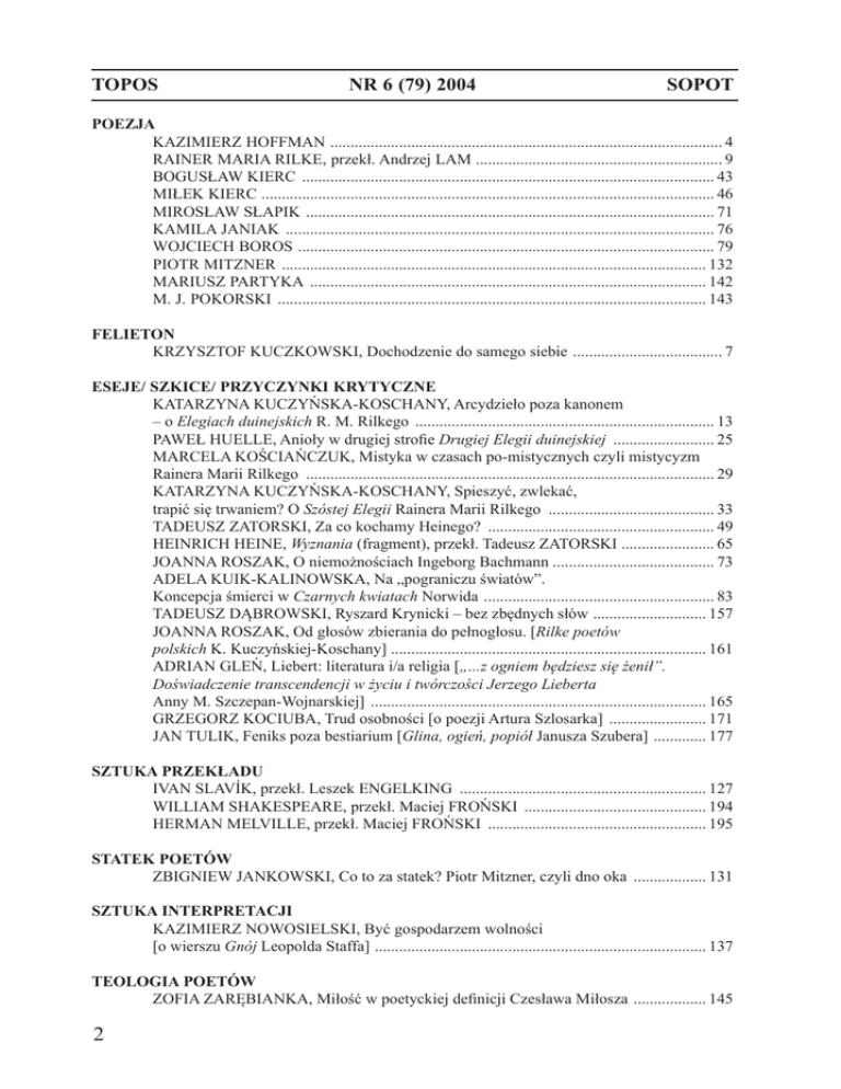 TOPOS NR 6 (79) 2004 SOPOT POEZJA KAZIMIERZ HOFFMAN .................................................................................................. 4 RAINER MARIA RILKE, przekł. Andrzej LAM ............................................................. 9 BOGUSŁAW KIERC ....................................................................................................... 43 MIŁEK KIERC ................................................................................................................. 46 MIROSŁAW SŁAPIK ...................................................................................................... 71 KAMILA JANIAK ........................................................................................................... 76 WOJCIECH BOROS ........................................................................................................ 79 PIOTR MITZNER .......................................................................................................... 132 MARIUSZ PARTYKA ................................................................................................... 142 M. J. POKORSKI ........................................................................................................... 143 FELIETON KRZYSZTOF KUCZKOWSKI, Dochodzenie do samego siebie ...................................... 7 ESEJE/ SZKICE/ PRZYCZYNKI KRYTYCZNE KATARZYNA KUCZYŃSKA-KOSCHANY, Arcydzieło poza kanonem – o Elegiach duinejskich R. M. Rilkego ........................................................................... 13 PAWEŁ HUELLE, Anioły w drugiej strofie Drugiej Elegii duinejskiej .......................... 25 MARCELA KOŚCIAŃCZUK, Mistyka w czasach po-mistycznych czyli mistycyzm Rainera Marii Rilkego ...................................................................................................... 29 KATARZYNA KUCZYŃSKA-KOSCHANY, Spieszyć, zwlekać, trapić się trwaniem? O Szóstej Elegii Rainera Marii Rilkego .......................................... 33 TADEUSZ ZATORSKI, Za co kochamy Heinego? ......................................................... 49 HEINRICH HEINE, Wyznania (fragment), przekł. Tadeusz ZATORSKI ........................ 65 JOANNA ROSZAK, O niemożnościach Ingeborg Bachmann ........................................ 73 ADELA KUIK-KALINOWSKA, Na „pograniczu światów”. Koncepcja śmierci w Czarnych kwiatach Norwida .......................................................... 83 TADEUSZ DĄBROWSKI, Ryszard Krynicki – bez zbędnych słów ............................. 157 JOANNA ROSZAK, Od głosów zbierania do pełnogłosu. [Rilke poetów polskich K. Kuczyńskiej-Koschany] ............................................................................... 161 ADRIAN GLEŃ, Liebert: literatura i/a religia [„...z ogniem będziesz się żenił”. Doświadczenie transcendencji w życiu i twórczości Jerzego Lieberta Anny M. Szczepan-Wojnarskiej] .................................................................................... 165 GRZEGORZ KOCIUBA, Trud osobności [o poezji Artura Szlosarka] ......................... 171 JAN TULIK, Feniks poza bestiarium [Glina, ogień, popiół Janusza Szubera] .............. 177 SZTUKA PRZEKŁADU IVAN SLAVÍK, przekł. Leszek ENGELKING .............................................................. 127 WILLIAM SHAKESPEARE, przekł. Maciej FROŃSKI .............................................. 194 HERMAN MELVILLE, przekł. Maciej FROŃSKI ....................................................... 195 STATEK POETÓW ZBIGNIEW JANKOWSKI, Co to za statek? Piotr Mitzner, czyli dno oka ................... 131 SZTUKA INTERPRETACJI KAZIMIERZ NOWOSIELSKI, Być gospodarzem wolności [o wierszu Gnój Leopolda Staffa] ................................................................................... 137 TEOLOGIA POETÓW ZOFIA ZARĘBIANKA, Miłość w poetyckiej definicji Czesława Miłosza ................... 145 2 ROZMOWY „TOPOSU” Odmienne stany szczęścia. Ze Zbigniewem CHOJNOWSKIM, poetą, krytykiem, badaczem literatury rozmawia Dominika SZMYT ...................................... 149 PROZA / DZIENNIKI / WSPOMNIENIA JAN SKÁCEL, Harfa w śniegu; Najbardziej niebieski felieton; Jak Radio Czechosłowackie nagrywało słowika w Żilochovicach, przekł. Agata FIRLEJ ............ 103 WACŁAW HOLEWIŃSKI, Nie tknął mnie nikt (fragment powieści) .......................... 107 EUGENIUSZ SOBOL, Powołanie; Marsylianka ........................................................... 117 MACIEJ CISŁO, Tapa Hautupo IV i Ruda Hania .......................................................... 121 ZBIGNIEW SILSKI [małe prozy] .................................................................................. 129 WYSTAWY MARIUSZ JAKIMOWICZ, Leonardo da Vinci. Geniusz i jego machiny; World Press Foto; Lekcja paryska. Impresjonizm i postimpresjonizm z kolekcji Milwaukee Art Muzeum ................................................................................................. 181 JOANNA ROSZAK, László Lakner. Prace konceptualne & W hołdzie Celanowi ........ 185 MARCELA KOŚCIAŃCZUK, Wyspy Franciszki i Stefana Themersonów .................. 186 MUZYCZNA FALA WOJCIECH FUŁEK, Rock do muzeum? ...................................................................... 189 RECENZJE / KSIĄŻKI KRZYSZTOF KUCZKOWSKI (Cz. Miłosz, Spiżarnia literacka) ................................ 197 JERZY GIZELLA (J. Stempowski, Zapiski dla zjawy) .................................................. 198 JERZY GIZELLA (S. Marai, Dziennik) ......................................................................... 200 JOANNA ROSZAK (G. Steiner, Gramatyki tworzenia) ................................................ 203 WOJCIECH FUŁEK (J. Głowacki, Z głowy) ................................................................. 204 ANNA SZCZEBLEWSKA (J. Napiórkowski, Krótki, daremny bieg Tarzana) ............. 206 PAWEŁ MACKIEWICZ (O. Tokarczuk, Ost
