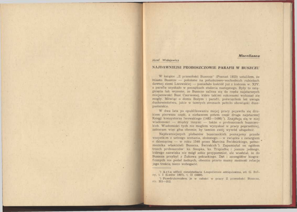 Miscellanea Józef W id a je w ic z NAJDAWNIEJSI PROBOSZCZOWIE PARAFII W BUSZCZU W książce „Z przeszłości Buszcza“ (Poznań 1925) ustaliłem, że miasto Buszcze — położone na południowo-wschodnich rubieżach dawnej ziemi Lwowskiej — posiadało kościół już z końcem w. X IV , a parafię uzyskało w początkach stulecia następnego. Były to osią gnięcia tak wczesne, że Buszcze zalicza się do rzędu najstarszych miejscowości Rusi Czerwonej, które takimi sukcesami wykazać się mogły. Mówiąc o domu Bożym i parafii, poświęciłem tetż uwagę duchowieństwu, jakie w tamtych stronach pełniło obowiązki dusz pasterskie. W dwa lata po opublikowaniu m ojej pracy pojawiła się dru kiem pierwsza część, a niebawem potem część druga najstarszej Księgi konsystorza lwowskiego (1482— 1498)'). Znajdują się, w niej wiadomości — między innymi — także o proboszczach buszczeckich. Wiadomości tych nie mogłem wyzyskać w pracy poprzedniej, zabieram więc głos obecnie, by tamten swój wywód uźupełnić. Najdawniejszych plebanów buszczeckich poznajemy przede wszystkim z ustnego zeznania, złożonego — w związku z zatargiem o dziesięcinę — w roku 1540 przez Marcina Świdnickiego, pełno mocnika właścicieli Buszcza, Św irskich'). Zapamiętał on ogółem trzech proboszczów: ks. Snopka, ks. Trzpiałkę i jeszcze jednego, którego nazwiska nie mógł sobie przypomnieć, ale wiedział, że do Buszcza przybył z Żukowa pokuckiego. Dat i szczegółów biogra ficznych nie podał żadnych, obecnie przeto mamy możność relację jego treścią nieco wzbogacić. ’ ) A c t a officii consistoliaris Leopoliensis antiąuissdma, ed. G. Rol ny, t. I (Lw ów 1927), t. II (1930). ■) Przedrukowałem je w całości w pracy Z przeszłości Buszcza, JOZEF WIDAJEWICZ 238 Ks. Jan Snopek był pierwszym proboszczem w Buszczu, ja kiego znamy z imienia i nazwiska. Pochodził ze stanu szlacheckie go, ale gdzie znajdowały się ojczyste jego strony, nie powiada miają źródła wyraźnie. Z rodziny znamy tylko brata jego, Jakuba, ożenionego z wdową po Macieju Kuroszu, Jadwigą Herburtówną *). Małżeństwo zdaje się świadczyć, iż dawnością rodu czy może za możnością — Snopkowie nie ustępowali Herburtom, tzn. zaliczali się do przedniejszej szlachty w kraju. Pewien cień na współżycie z bratem rzuca spór (nie wiem y o co), wytoczony przez ks. Jana przed sądem duchownym we Lw ow ie ')• Z notatki, wciągniętej do Aktów grodzkich halickich pod ro kiem 1481, czerpiemy wiadomość, iż Jakub Snopek posiadał dom w Rohatynie '). Dwadzieścia lat wstecz (1461) starosta halicki, Sta nisław z Chodcza. zaciągnął dług u niejakiego Jana Snopka i należytość zabezpieczył na posiadłości swojej, położonej w obrębie przedmieścia Rohatyna przy ulicy Babińskiej"). Trudno nie dopa trzyć się związku między jedną wiadomością i drugą: skoro Jakub Snopek posiadał w Rohatynie dom własny, to chyba w obrębie owej posiadłości, którą Jan Snopek miał ongiś w zastawie (nie wnikam w to. w jaki sposób zastaw, cały lub w części, przeszedł na własność Jana Snopka). Żeby zachodził tu przypadek i jeden Snopek (nazwisko dość rzadkie) z drugim spokrewniony nie był, uwierzyć trudno, sprawa przecie tłumaczy się jasno: Jakub Snopek odziedziczył po prostu dom po Janie, tzn. był jego synem. A w ta kim razie w tym że Janie mielibyśmy zarazem ojca buszczeckiego plebana, przy czym imię Jan. po ojcu widocznie przejęte, mogło by wskazywać, że pleban był pierworodnym jego synem. Gdy się cofniemy do początkowych lat X V wieku, napotkamy jeszcze jednego Snopka. W dokumencie z roku 1402, zawierającym darowiznę Bolszowca na rzecz arcybiskupa halickiego, Jakuba Strepy, występuje wśród świadków. Piotr Snopek „de Kunaczow“ 7) (dziś Kunaszów w powiecie rohatyńskim). Czy Kunaszów utrzymał się w posiadaniu Snopków na stałe, nie wiemy, w toku X V wieku źródła o nim wspominają nieraz (por. X II tom Aktów gr. i ziem.), lecz jako właścicieli wymieniają ludzi innych, nie Snopków. W y *) A k t a gr. i ziem., t. X IX (Lw ów 1906), nr. 1000 i 1629. ‘) A c t a officii, t. I, nr. 961, 1103 i 1104. “) A k t a gr. i ziem., t. X IX , nr. 1620. “) A k t a gr. i ziem., t. X I I (Lw ów 1887), nr. 2979. Tegoż też Snopka zdaje się dotyczyć wzmianka z roku 1454. Ibidem, t. X IX , nr. 2712, w której wyszczególniono samo nazwisko, a pominięto imię. ') A k t a gr. i ziem., t. II (Lw ów 1870). nr. 28. 13] 1’ liOBOSZCZOWIE PAK A KII W in s zc zr 239 kluczone nie jest, że — jak to u szlachty działo się często — drogą transakcyj majątkowych część Kunaszowa odpadła od Snopków, a część utrzymała się nadal w ich posiadaniu, ale mogło też być inacżej: Snopkowie sprzedali Kunaszów cały i zakupili w to miejsce jakiś inny majątek w ziemi halickiej. Pod rokiem 1444 znajduje się wiadomość, że znany już nam Jan Snopek pochodził „de Mogasw a“ ”), cóż kiedy śladów nie ma, czy w ziemi halickiej istniała miejscowość takiej nazwy (Słownik Geograficzny nomenklatury „Mogaswa“ w ogóle nie zna). Związek Jana Snopka z Rohatynem poznaliśmy już poprzednio, tu zaś dodać nie zawadzi, iż — za wypożyczenie pieniędzy — miał on nadto w zastawie wieś Nastaszczyn ”),również w rohatyńskim powiecie położoną. Dane te w każ dym razie dają podstawę do wyrażenia domysłu, iże w bliższej lub dalszej okolicy Rohatyna znajdowały się rodzinne strony pro boszcza buszczeckiego: Jan Snopek ,,de Mogaswa“ był zapewne jego ojcem, a Piotr Snopek „de Kunaczow“ — chyba dziadkiem. Nie da się oznaczyć dokładnie, kiedy ks. Snopek stanowisko plebana w Buszczu objął, pierwsza wiadomość, iż posterunek buszczecki już zajmował, pochodzi z 8 lipca 1483 roku; wtedy wła śnie dał w aktach konsystorskich oblatować zapis fundacyjny dzie dzica Jana Boszcza z roku 1433. Mając na uw