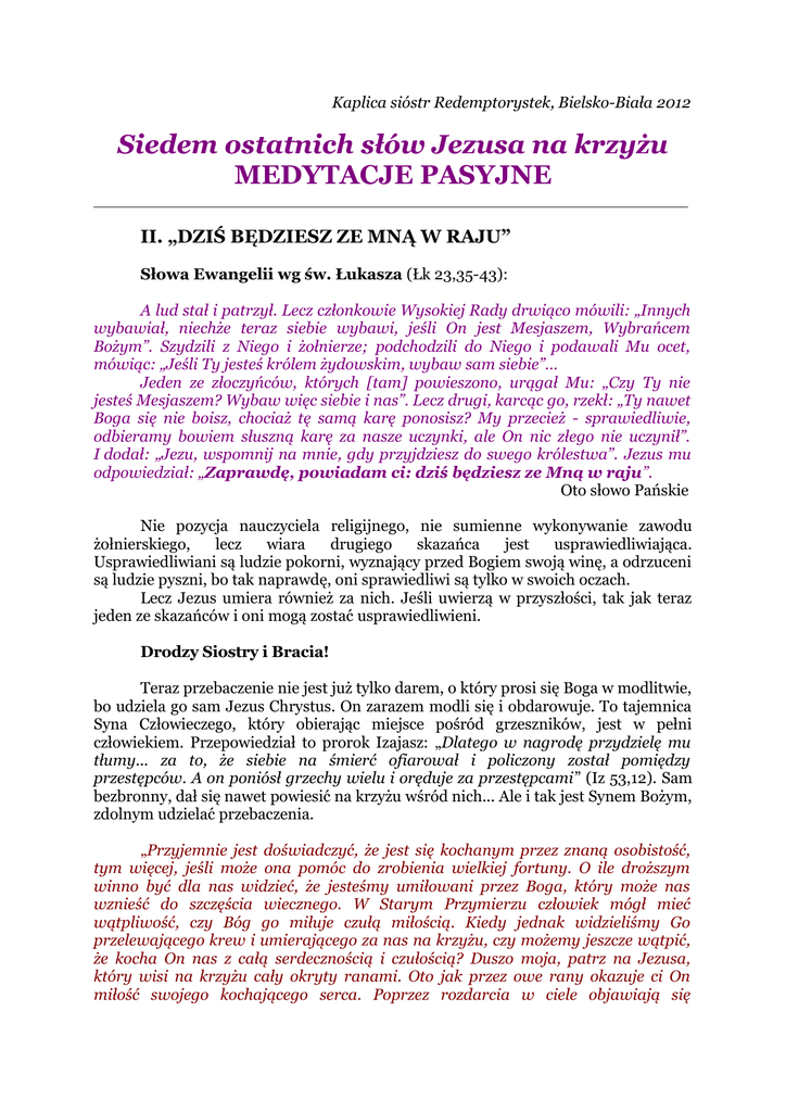 Kaplica sióstr Redemptorystek, Bielsko-Biała 2012 Siedem ostatnich słów Jezusa na krzyżu MEDYTACJE PASYJNE ___________________________________________________________________________ II. „DZIŚ BĘDZIESZ ZE MNĄ W RAJU” Słowa Ewangelii wg św. Łukasza (Łk 23,35-43): A lud stał i patrzył. Lecz członkowie Wysokiej Rady drwiąco mówili: „Innych wybawiał, niechże teraz siebie wybawi, jeśli On jest Mesjaszem, Wybrańcem Bożym”. Szydzili z Niego i żołnierze; podchodzili do Niego i podawali Mu ocet, mówiąc: „Jeśli Ty jesteś królem żydowskim, wybaw sam siebie”… Jeden ze złoczyńców, których [tam] powieszono, urągał Mu: „Czy Ty nie jesteś Mesjaszem? Wybaw więc siebie i nas”. Lecz drugi, karcąc go, rzekł: „Ty nawet Boga się nie boisz, chociaż tę samą karę ponosisz? My przecież - sprawiedliwie, odbieramy bowiem słuszną karę za nasze uczynki, ale On nic złego nie uczynił”. I dodał: „Jezu, wspomnij na mnie, gdy przyjdziesz do swego królestwa”. Jezus mu odpowiedział: „Zaprawdę, powiadam ci: dziś będziesz ze Mną w raju”. Oto słowo Pańskie Nie pozycja nauczyciela religijnego, nie sumienne wykonywanie zawodu żołnierskiego, lecz wiara drugiego skazańca jest usprawiedliwiająca. Usprawiedliwiani są ludzie pokorni, wyznający przed Bogiem swoją winę, a odrzuceni są ludzie pyszni, bo tak naprawdę, oni sprawiedliwi są tylko w swoich oczach. Lecz Jezus umiera również za nich. Jeśli uwierzą w przyszłości, tak jak teraz jeden ze skazańców i oni mogą zostać usprawiedliwieni. Drodzy Siostry i Bracia! Teraz przebaczenie nie jest już tylko darem, o który prosi się Boga w modlitwie, bo udziela go sam Jezus Chrystus. On zarazem modli się i obdarowuje. To tajemnica Syna Człowieczego, który obierając miejsce pośród grzeszników, jest w pełni człowiekiem. Przepowiedział to prorok Izajasz: „Dlatego w nagrodę przydzielę mu tłumy... za to, że siebie na śmierć ofiarował i policzony został pomiędzy przestępców. A on poniósł grzechy wielu i oręduje za przestępcami” (Iz 53,12). Sam bezbronny, dał się nawet powiesić na krzyżu wśród nich... Ale i tak jest Synem Bożym, zdolnym udzielać przebaczenia. „Przyjemnie jest doświadczyć, że jest się kochanym przez znaną osobistość, tym więcej, jeśli może ona pomóc do zrobienia wielkiej fortuny. O ile droższym winno być dla nas widzieć, że jesteśmy umiłowani przez Boga, który może nas wznieść do szczęścia wiecznego. W Starym Przymierzu człowiek mógł mieć wątpliwość, czy Bóg go miłuje czułą miłością. Kiedy jednak widzieliśmy Go przelewającego krew i umierającego za nas na krzyżu, czy możemy jeszcze wątpić, że kocha On nas z całą serdecznością i czułością? Duszo moja, patrz na Jezusa, który wisi na krzyżu cały okryty ranami. Oto jak przez owe rany okazuje ci On miłość swojego kochającego serca. Poprzez rozdarcia w ciele objawiają się tajemnice serca - mówi św. Bernard. Pasyjne) (Św. Alfons Maria de Liguori, Medytacje W nawróconym łotrze dokonał się cud. Zawisł on na krzyżu obok Niewinnego. Tutaj możliwe są dwie reakcje: skrucha albo drwina. Nawrócony łotr, popularnie nazywany „dobrym”, otrzymuje najpiękniejszą rzecz, jakiej grzesznik może oczekiwać od Boga: darem tym jest czułe serce. Nasze zwrócone na niewinnego oczy sprawiają, że stajemy albo się lepsi, albo jeszcze bardziej źli. Gdy zbliża się śmierć, wychodzi też na jaw prawdziwa natura grzeszników, którzy albo za swe winy żałują, albo się zasklepiają w swej zatwardziałości. Zresztą na progu tamtego świata wszystkie namiętności obnażają swą względność, gdy chodzi o żądzę bogactw, władzy czy światowych uciech. W obliczu śmierci okazuje się, jak bardzo to wszystko pozbawione jest znaczenia. Śmierć niemal każdą sprawę czyni czymś nieważnym. Może tu właśnie kryje się łaska żalu danego nam na tę ostatnią godzinę. Brama wieczności jest zwierciadłem, w którym każdy musi się przejrzeć. 1. „Wspomnij na mnie” „Wspomnij na mnie - powiedział do Ciebie, o mój Jezu, dobry łotr i został pocieszony, słysząc od Ciebie słowa: Zaprawdę powiadam ci: Dziś ze Mną będziesz w raju (Łk 23,42-43). Wspomnij na mnie - mówię i ja do Ciebie; wspomnij, Panie, że jestem jedną z owych owieczek, za które oddałeś życie. Pociesz i mnie pozwalając mi odczuć, że mi przebaczasz, udzielając mi wielkiego żalu za moje grzechy”. (Św. Alfons Maria de Liguori, Medytacje Pasyjne) W trakcie naszego tutaj życia Bóg wciąż o nas myśli. To my nie myślimy o Nim, bo jesteśmy oporni albo roztargnieni. A On w stosunku do nas jest samym miłosierdziem i współczuciem. „Ja bowiem znam zamiary, jakie mam wobec was — wyrocznia Pana — zamiary pełne pokoju, a nie zguby, by zapewnić wam przyszłość, jakiej oczekujecie” (Jr 29,11). Nasz grzech nigdy nie może być przeszkodą dla Bożej troskliwości i wielkodusznego przebaczenia. Poza tym Bóg najlepiej wie, jacy jesteśmy, bo czyż nie sam nas stworzył? Jak mówi biblijny mędrzec: „Miłujesz bowiem wszystkie byty, niczym się nie brzydzisz, co uczyniłeś, bo gdybyś miał coś w nienawiści, nie byłbyś tego ukształtował... Oszczędzasz wszystko, bo to wszystko Twoje, Władco, miłujący życie!” (Mdr 11,24.26). Wśród czterech ewangelistów tylko św. Łukasz umieszcza scenę z nawróconym złoczyńcą w swoim przekazie pasyjnym. Jest on bowiem „ewangelistą miłosierdzia”. Przypomnijmy, że również tylko on przekazał nam przypowieści: o synu marnotrawnym, o zgubionej drachmie oraz o zabłąkanej i odnalezionej owcy. 2. „Dziś” „Dziś” - słowo to nabiera pełnej treści, gdy przywołujemy Boże działanie. Chwila obecna przepełniona jest Bożą mocą i przebaczeniem. „Tego wieczora zobaczycie, że to Pan wyprowadził was z ziemi egipskiej” — mówi Bóg do synów Izraela przy wyprow