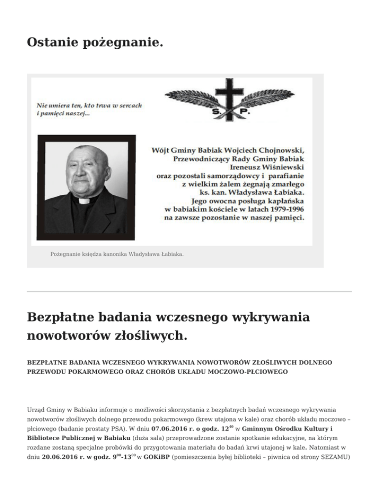Ostanie pożegnanie. Pożegnanie księdza kanonika Władysława Łabiaka. Bezpłatne badania wczesnego wykrywania nowotworów złośliwych. BEZPŁATNE BADANIA WCZESNEGO WYKRYWANIA NOWOTWORÓW ZŁOŚLIWYCH DOLNEGO PRZEWODU POKARMOWEGO ORAZ CHORÓB UKŁADU MOCZOWO-PŁCIOWEGO Urząd Gminy w Babiaku informuje o możliwości skorzystania z bezpłatnych badań wczesnego wykrywania nowotworów złośliwych dolnego przewodu pokarmowego (krew utajona w kale) oraz chorób układu moczowo – płciowego (badanie prostaty PSA). W dniu 07.06.2016 r. o godz. 1240 w Gminnym Ośrodku Kultury i Bibliotece Publicznej w Babiaku (duża sala) przeprowadzone zostanie spotkanie edukacyjne, na którym rozdane zostaną specjalne probówki do przygotowania materiału do badań krwi utajonej w kale. Natomiast w dniu 20.06.2016 r. w godz. 900-1300 w GOKiBP (pomieszczenia byłej biblioteki – piwnica od strony SEZAMU) prowadzone będą badania PSA oraz odebrane zostaną probówki. W badaniach mogą uczestniczyć: badanie PSA – mężczyźni powyżej 50 roku życia, badanie krwi utajonej w kale – mężczyźni i kobiety powyżej 50 roku życia. Zapisy prowadzone są w sekretariacie Urzędu Gminy w Babiaku (pok. 33) od pn.-pt. w godz. 730-1530 lub tel.: 632711071. Zasady dotyczące wymiany i przechowywania gazu propan butan w butlach 11 kg. Komenda Powiatowa Państwowej Straży Pożarnej w Kole informuje, że w ostatnim czasie odnotowano wzmożoną ilość interwencji spowodowaną „wyczuwalnym gazem” na klatkach schodowych w budynkach mieszkalnych wielorodzinnych. Wykonane podczas działań pomiary nie wykazały obecności gazu, a przyczyną wyczuwalnego zapachu „gazu” była nieostrożność podczas wymiany pustych butli gazowych przez lokatorów. W związku z powyższym pragniemy przypomnieć o kilku zasadach obowiązujących podczas wymiany i przechowywania gazu propan butan w butlach 11 kg. Więcej informacji: http://www.kolo.psp.bip.net.pl/?a=1150 Informacja ARiMR. Biuro Powiatowe Agencji Restrukturyzacji i Modernizacji Rolnictwa w Kole informuje, iż Komisja Europejska podjęła decyzję o wydłużeniu do 15 czerwca 2016 roku okresu składania wniosków o tegoroczne płatności bezpośrednie. XV Sesja Rady Gminy Babiak XV SESJA RADY GMINY B A B I A K odbędzie się w dniu 11 maja 2016 r. tj. środa o godz. 12:00 w sali Gminnego Ośrodka Kultury i Biblioteki Publicznej w Babiaku z następującym porządkiem obrad: 1. Otwarcie Sesji Rady Gminy oraz stwierdzenie prawomocności obrad. 2. Prezentacja porządku obrad Sesji. 3. Przyjęcie Protokołu Nr XIV/16 poprzedniej Sesji Rady Gminy. 4. Sprawozdanie z działalności Wójta Gminy w okresie międzysesyjnym z uwzględnieniem sprawozdania z wykonania uchwał Rady. 5. Informacja Przewodniczącego Rady o działaniach podejmowanych w okresie międzysesyjnym. 6. Wystąpienia zaproszonych gości. 7. Podjęcie uchwały w sprawie zmian budżetowych na 2016 rok. 8. Podjęcie uchwały w sprawie zmian w Wieloletniej Prognozie Finansowej na lata 2016-2024. 9. Podjęcie uchwały w sprawie określenia przystanków komunikacyjnych oraz warunków korzystania z przystanków komunikacyjnych, których właścicielem lub zarządcą jest Gmina Babiak, 10. Podjęcie uchwały w sprawie wyrażenia zgody na użyczenie nieruchomości położonej w miejscowości Lubotyń. 11. Podjęcie uchwały w sprawie nabycia nieruchomości położonej w miejscowości Żurawieniec. 12. Podjęcie uchwały w sprawie nabycia nieruchomości położonej w miejscowości Babiak. 13. Podjęcie uchwały w sprawie przyjęcia darowizny przez Gminę Babiak. 14. Podjęcie uchwały w sprawie przystąpienia do opracowania programu rewitalizacji. 15. Podjęcie uchwały w sprawie przedłużenia czasu obowiązywania dotychczasowych taryf dla zbiorowego zaopatrzenia w wodę i zbiorowego odprowadzania ścieków na terenie gminy Babiak. 16. Sprawozdanie z realizacji Programu współpracy Gminy Babiak z organizacjami pozarządowymi oraz podmiotami, o których mowa w art. 3 ust.3 Ustawy z dnia 24 kwietnia 2003 roku o działalności pożytku publicznego i o wolontariacie za 2015 rok. 17. Wnioski i zapytania radnych. 18. Wnioski i zapytania sołtysów. 19. Odpowiedzi na wnioski i zapytania. 20. Wolne wnioski i informacje. 21. Zamknięcie obrad XV Sesji Rady Gminy Babiak. 225 Rocznica Uchwalenia Konstytucji 3-go Maja Bezpłatne szkolenia komputerowe. Bezpłatne szkolenia z GRAFIKI KOMPUTEROWEJ i PROGRAMOWANIA w KONINIE Serdecznie zapraszamy na bezpłatne szkolenia finansowane ze środków UE: GRAFIKA KOMPUTEROWA (na programach Gimp i Inkscape) – szkolenie weekendowe – 80 godz. – od 4-26 czerwca (4 kolejne weekendy sobota-niedziela) PROGRAMOWANIE – TWORZENIE I ZARZĄDZANIE STRONAMI WWW – szkolenie weekendowe – 80 godz. – od 27 sierpnia – 26 września (6 kolejnych weekendów sobota-niedziela). Praca w grupach max. 12 osobowych. Na szkolenia zapraszamy osoby w wieku 25-64 lata, z wykształceniem co najwyżej średnim. Dodatkowe informacje: Agata Bryzgalska tel. 601 256 601, mail: [email protected] Informacja ARiMR Szanowni Państwo Uprzejmie informuję i proszę o wywieszenie na tablicach ogłoszeń oraz powiadomienie sołtysów z prośbą o kurendę następującej informacji W związku z upływającym 16 maja terminem podstawowym składania wniosków obszarowych Biuro Powiatowe ARiMR w Kole będzie otwarte w dniach 9 do 13 maja oraz 16 maja w godz.6.00 -22.00 w sobotę 14 maja w godz. 6.00-14.00 Spotkanie informacyjno – szkoleniowe dotyczące niskiej emisji w gminie Babiak. Czym jest niska emisja? Czy zjawisko to stanowi zagrożenie dla gminy Babiak? Jakie działania możemy podjąć, aby je ograniczyć? Co gmina Babiak zyska w wyniku opracowania Planu Gospodarki Niskoemisyjnej? Na te i wiele innych zagadnień, w związku z pracami nad „Planem Gospodarki Niskoemisyjnej dla gminy Babiak” odpowiadali wykonawcy tego planu, przedstawiciele firmy Ekolog Sp. z o.o. z Poznania. Na spotkanie, które odbyło si