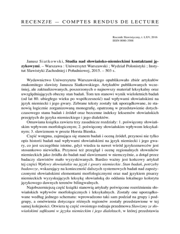 RECENZJE — COMPTES RENDUS DE LECTURE Rocznik Slawistyczny, t. LXV, 2016 ISSN 0080-3588 Janusz S i a t k o w s k i, Studia nad słowiańsko-niemieckimi kontaktami językowymi. – Warszawa : Uniwersytet Warszawski ; Wydział Polonistyki ; Instytut Slawistyki Zachodniej i Południowej, 2015. – 503 s. Wydawnictwo Uniwersytetu Warszawskiego opublikowało zbiór artykułów znakomitego slawisty Janusza Siatkowskiego. Artykułów publikowanych wcześniej, ale zaktualizowanych, poszerzonych o najnowszy materiał leksykalny oraz uwzględniających obecny stan badań. Tom ten stanowi wynik wieloletnich badań (od lat 80. ubiegłego wieku po współczesność) nad wpływami słowiańskimi na język niemiecki i jego gwary. Zebrane teksty zostały tak uporządkowane, że stanowią logicznie zorganizowaną monografię, opatrzoną w przedstawienie dotychczasowego stanu badań i źródeł oraz bezcenne indeksy leksemów słowiańskich przejętych do języka niemieckiego i jego dialektów. Omawiana książka zawiera trzy zasadnicze rozdziały: 1. poświęcony słowiańskim wpływom morfologicznym; 2. poświęcony słowiańskim wpływom leksykalnym; 3. slawizmom w prozie Horsta Bienka. Część wstępna, zajmująca się stanem badań i oceną źródeł, przynosi nie tylko opis historii badań nad wpływami słowiańskimi na język niemiecki i jego gwary, co jest szczególnie istotne, gdyż wiedza ta nawet wśród językoznawców jest stosunkowo niewielka. Przynosi też przegląd i ocenę regionalnych słowników niemieckich jako źródła do badań nad slawizmami w niemczyźnie, a dotąd przez badaczy slawistów mało wyzyskiwanych. Bardzo ważny jest końcowy artykuł tej części Wpływy słowiańskie na język i gwary niemieckie. Stan badań, potrzeby badawcze, wskazujący na konieczność dalszych systemowych badań nad zapożyczonymi słowiańskimi elementami morfologicznymi oraz nad językiem pisarzy niemieckich wyzyskujących leksykę słowiańską do oddania lokalnego kolorytu językowego dawnych terenów bilingwalnych. Najobszerniejszą część książki stanowią artykuły poświęcone rozróżnieniu słowiańskich wpływów morfologicznych i leksykalnych. Zostały one uporządkowane według jednego schematu: wprowadzono taki sam podział na grupy i podgrupy, a omówienia dotyczące różnych regionów zostały przedstawione w tej samej kolejności. Otwiera tę część swoistego rodzaju przedmowa Slawizmy ze słowiańskimi sufiksami w języku niemieckim i jego dialektach, w której przedstawia 118 RECENZJE Autor zasady uporządkowania artykułów. Chodzi o przedstawienie pożyczek słowiańskich z wybranymi sufiksami słowiańskimi występujących w języku naszych zachodnich sąsiadów i jego dawnych dialektach, nawiązujących do zwartego obszaru słowiańskiego (często chodzi o tereny dwujęzyczne). Autor koncentruje się w dalszej części na slawizmach z sufiksami -ak, -ač, -ik, -nik, -(l)ik, -(n)ica, -ьcь, -itjь, -uš, -arь, -ski, -cki, -owski, -ewski, -inski, -awa. Z zasady uwzględnia się wyrazy pospolite, pomijając nazwy własne, gdyż wymagałoby to wyzyskanie innych, niż słowniki regionalne, źródeł. Podaje jednak Autor nazwy reprezentantów narodów słowiańskich i czyni odstępstwa od wymienionej zasady omawiając śląskie nazwy osobowe na -uš, a także pochodzenie nazwiska Puttkammer. Ukłonem w stronę nazw własnych jest też artykuł Slawizmy z sufiksami -ski, -cki, -owski, -ewski, -inski. Punktem wyjścia omawianych w nim pożyczek były tak zakończone nazwiska słowiańskie, zwłaszcza polskie. Zapożyczeń leksykalnych jest tu stosunkowo niewiele, zazwyczaj mamy do czynienia z neologizmami o funkcji żartobliwej i prześmiewczej, tworzonymi na wzór polskiej struktury morfologicznej (charakterystycznej głównie dla nazwisk) od niemieckich podstaw. Są one zazwyczaj ograniczone regionalnie (na ogół do obszaru byłych Prus Zachodnich i Wschodnich, a z terenu obecnych Niemiec – do Zagłębia Ruhry). Odnoszą się te neologizmy głównie do osób, określając zwykle ich negatywne cechy. Część dotyczącą zjawisk morfologicznych kończą teksty pisane po polsku i po niemiecku będące jakby teoretycznymi podsumowaniami dotychczasowych rozważań szczegółowych i przynoszące uwagi o interferencji językowej w zakresie fleksji i słowotwórstwa oraz o słowiańskich sufiksach w dialektach niemieckich w ujęciu synchronicznym. Grupa artykułów dotycząca wpływów leksykalnych jest mniejsza. Zajmują się one zarówno konkretnymi wyrazami, np. kaszubskie merlica, słowiańskie *materica, *matica, nazwisko Puttkammer, jak i wpływami poszczególnych języków słowiańskich (polskiego, czeskiego) na język i gwary niemieckie. Ostatnia część książki nawiązuje do postulatów badawczych, o których wspominał Autor w tekście kończącym zbiór artykułów Stan badań i źródła. Pisał tam o konieczności badań nad językiem pisarzy wprowadzających slawizmy dla podkreślenia lokalnego kolorytu. Doskonałym tego przykładem jest ta właśnie partia książki poświęcona slawizmom w prozie Horsta Bienka. Profesor J. Siatkowski zdecydował się na włączenie tego opracowania do prezentowanego zbioru (mimo iż stosunkowo niedawno ukazało się w osobnym wydaniu polskim i niemieckim), gdyż daje możliwość szczegółowych porównań z przedstawionymi wpływami na niemczyznę śląską, stanowi egzemplifikację słowiańsko-niemieckich wpływów językowych. RECENZJE 119 Książkę uzupełniają, jak już wspomniano, indeksy leksemów będących pożyczkami słowiańskimi w języku niemieckim. Oprócz zbiorczego indeksu niemieckiego dołączono indeks zbiorczy słowiański i indeksy wskazujące na poszczególne języki słowiańskie (bułgarski, czeski i słowacki, łużycki, polski z kaszubskim, serbsko-chorwacki, słoweński, języki wschodniosłowiańskie) i inne (albański, angielski, arabski, francuski, grecki, hebrajski, hiszpański, holen