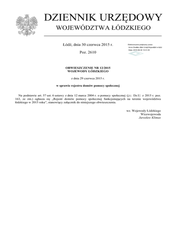DZIENNIK URZĘDOWY WOJEWÓDZTWA ŁÓDZKIEGO Łódź, dnia 30 czerwca 2015 r. Elektronicznie podpisany przez: Anna Siwińska; Łódzki Urząd Wojewódzki w Łodzi Poz. 2610 Data: 2015-06-30 13:31:35 OBWIESZCZENIE NR 12/2015 WOJEWODY ŁÓDZKIEGO z dnia 29 czerwca 2015 r. w sprawie rejestru domów pomocy społecznej Na podstawie art. 57 ust. 6 ustawy z dnia 12 marca 2004 r. o pomocy społecznej (j.t.: Dz.U. z 2015 r. poz. 163, ze zm.) ogłasza się „Rejestr domów pomocy społecznej funkcjonujących na terenie województwa łódzkiego w 2015 roku”, stanowiący załącznik do niniejszego obwieszczenia. wz. Wojewody Łódzkiego Wicewojewoda Jarosław Klimas Dziennik Urzędowy Województwa Łódzkiego –2– Poz. 2610 Załącznik do obwieszczenia nr 12/2015 Wojewody Łódzkiego z dnia 29 czerwca 2015 r. REJESTR DOMÓW POMOCY SPOŁECZNEJ FUNKCJONUJĄCYCH NA TERENIE WOJEWÓDZTWA ŁÓDZKIEGO W 2015 ROKU Lp. Nazwa domu pomocy społecznej Adres i telefon Typ domu pomocy społecznej dla niepełnosprawnych intelektualnie mężczyzn dla niepełnosprawnych intelektualnie mężczyzn Liczba miejsc na które wydano zezwolenie Podmiot prowadzący Dyrektor Numer w rejestrze Numer w rejestrze 10 Fundacja im. Brata Alberta Jan Bujnowicz PS.9014/1/DPS 1 PS.III-9013/13/2010 z dnia 27.10.2010 r. PS.I-9013/1/2001 z dnia 12.03.2001 r. 14 Fundacja im. Brata Alberta Jan Bujnowicz PS.9014/2/DPS 54 PS.III.9013/13/09/10 z dnia 31.07.2009 r. PS.I-9013/1/2001 z dnia 12.03.2001 r. Numer i data wydania zezwolenia na czas nieokreślony Numer i data wydania zezwolenia warunkowego 1 Dom Pomocy Społecznej w Łodzi ul. Helenówek 7, 91-366 Łódź tel. (042) 658-91-70 2 Dom Pomocy Społecznej w Chorzeszowie Chorzeszów 37, 98-105 Wodzierady tel. (043) 677-33-81 3 Dom Pomocy Społecznej Towarzystwa Przyjaciół „Dom na Osiedlu” w Łodzi ul. Kalinowa 5, 90-348 Łódź tel. (042) 678-13-57 dla dzieci i młodzieży niepełnosprawnych intelektualnie 12 Towarzystwo Przyjaciół „Dom na Osiedlu” Beata Adamczyk PS.9014/3/DPS 2 ― PS.I-9013/4/2001 z dnia 27.04.2001 r. 4 Dom Pomocy Społecznej w Łodzi ul. Wapienna 29, 91-078 Łódź tel. (042) 640-72-11 dla dzieci i młodzieży niepełnosprawnych intelektualnie 9 Stowarzyszenie Osieroconym Dzieciom Specjalnej Troski Joanna Stajniak PS.9014/4/DPS 3 ― PS.I-9013/5/2001 z dnia 28.06.2001 r. 5 Dom Pomocy Społecznej w Radomsku dla osób w podeszłym wieku 60 Powiat Radomszczański Grażyna Dębska PS.9014/5/DPS 30 6/1 z dnia 21.05.2008 r. PS.I-9013/9/2001 z dnia 17.09.2001 r. dla osób przewlekle somatycznie chorych 92 Powiat Bełchatowski Bogusława Kokocińska PS.9014/6/DPS 28 7/1 z dnia 30.04.2008 r. PS.I-9013/35/2001 z dnia 13.12.2001 r. dla osób przewlekle psychicznie chorych 80 Powiat Bełchatowski Małgorzata Muszkiewicz PS.9014/7/DPS 35 8/1 z dnia 12.08.2008 r. PS.I-9014/8/2002 z dnia 9.01.2002 r. dla osób przewlekle somatycznie chorych 78 Powiat Tomaszowski Danuta Remisz PS.9014/8/DPS 55 PS.III.9013/14/09 z dnia 18.08.2009 r. PS.I-9014/10/2002 z dnia 11.01.2002 r. 6 7 8 Dom Pomocy Społecznej w Bełchatowie Dom Pomocy Społecznej w Zabłotach Dom Pomocy Społecznej w Tomaszowie Mazowieckim ul. I. Krasickiego 138, 97-500 Radomsko tel. (044) 682-15-91, fax (044) 682 08 41 ul. Dąbrowskiego 2, 97-400 Bełchatów tel. (044) 635-24-00 Zabłoty 19, 97-425 Zelów tel. (044) 634-19-40 ul. Polna 56, 97-200 Tomaszów Mazowiecki, tel. (044) 724-26-45 fax (044) 724-27-31 filia ul. Farbiarska 27/29, 97-200 Tomaszów dla osób w podeszłym wieku 82 Uwagi Na mocy przepisów prawa decyzja warunkowa na prowadzenie domu pomocy społecznej wygasła z dniem 1 stycznia 2013 r., dom nie funkcjonuje Została wydana decyzja o cofnięciu zezwolenia warunkowego, aktualnie dom nie funkcjonuje Dziennik Urzędowy Województwa Łódzkiego Mazowiecki, tel. (044) 724-26-45, fax (044) 724-27-31 ul. Łaska 42, 98-220 Zduńska Wola tel. (043) 823-25-70 Chróścin 50, 98-430 Bolesławiec tel. (062) 783-61-30 fax (062) 783-60-19 9 Dom Pomocy Społecznej w Zduńskiej Woli 10 Dom Pomocy Społecznej Chróścin – Wieś 11 Dom Pomocy Społecznej w Kutnie ul. Sobieskiego 49, 99-300 Kutno tel. (024) 253-35-23 12 Dom Pomocy Społecznej w Chróścinie Zamku Chróścin 47, 98-430 Bolesławiec tel. (062) 783-60-33 13 Dom Pomocy Społecznej w Niemojowicach –3– Poz. 2610 dla osób przewlekle somatycznie chorych 82 Powiat Zduńskowolski Arkadiusz Bednarski PS.9014/9/DPS 37 12/1/08 z dnia15.09.2008 r. PS.I-9014/12/2002 z dnia 21.01.2002 r. dla osób przewlekle psychicznie chorych 95 Powiat Wieruszowski Bożena Ferdynus PS.9014/10/DPS 33 13/1 z dnia 7.08.2008 r. PS.I-9014/13/2002 z dnia 22.01.2002 r. dla osób przewlekle somatycznie chorych 60 Zgromadzenie Sióstr Albertynek Posługujących Ubogim Prowincja Warszawska Zofia Hajko PS.9014/11/DPS 44 PS.III.9014/3/09 z dnia 8.04.2009 r. PS.II-9014/15/2002 z dnia 25.03.2002 r. dla osób przewlekle psychicznie chorych 59 Powiat Wieruszowski Bogdan Nawrocki PS.9014/12/DPS 61 PS.III.9013/22/10 z dnia 8.01.2010 r. PS.II-9014/16/2002 z dnia 25.03.2002 r. dla osób przewlekle somatycznie chorych i osób w podeszłym wieku 97 Powiat Opoczyński Renata Konecka PS.9014/13/DPS 4 dla osób przewlekle somatycznie chorych 77 Powiat Opoczyński Krzysztof Wylon PS.9014/14/DPS 52 PS.III.9013/11/08/09 z dnia 15.07.2009 r. PS.II-9014/14/2002 z dnia 11.04.2002 r. dla osób dorosłych niepełnosprawnych intelektualnie 100 Powiat Zduńskowolski Magdalena FrątczakMaciejewska PS.9014/15/DPS 38 14/1/08 z dnia 24.09.2008 r. PS.II-9014/14/2002 z dnia 23.04.2002 r. dla osób w podeszłym wieku 231 Powiat Sieradzki Aleksandra Mirkiewicz PS.9014/16/DPS 12 9014/57 z dnia 9.12.2004 r. PS.II-9014/20/2002 z dnia 17.05.2002 r. 130 Powiat Kutnowski Radosław Pawlak PS.9014/17/DPS 22 23/1 z dnia 28.01.2008 r. 9014/23/2002 z dnia 24.06.2002 r. 72 Powiat Kutnowski Andrzej Sobczak PS.9014/18/DPS 29 26/1 z dnia 15.05.2008 r. 9014/26/2002 z dnia 24.06.2002 r. 17 Dom Pomocy Społecznej w Kutnie Niemojowi