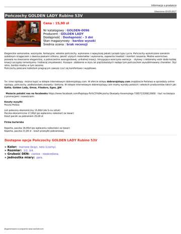 Informacje o produkcie Utworzono 03-03-2017 Pończochy GOLDEN LADY Rubino 53V Cena : 15,90 zł Nr katalogowy : GOLDEN-0096 Producent : GOLDEN LADY Dostępność : Dostępność - 3 dni Stan magazynowy : bardzo wysoki Średnia ocena : brak recenzji Eleganckie samonośne, wzorzyste, fantazyjne, włoskie pończochy, wykonane z najwyższej jakości przędz typu Lycra. Pończochy wykończone szerokim ozdobnym ściągaczem z dwoma paskami silikonu. Jakość użytych materiałów i wykonania, zapewnia trwałość i komfort noszenia. Modne wzornictwo pozwala na stworzenie eleganckiej, a jednocześnie awangardowej, unikalnej kreacji. Intrygująca wzorzysta wariacja - stylowy i niebanalny wzór doda każdej kreacji szczyptę romantyzmu i kobiecej zmysłowości. Kuszące zdobienie w stylu lat pięćdziesiatych nadaje tym pończochom wysublimowany charakter. Styl retro, bardzo modny w tym sezonie. Pończochy polecane kobietom pragnącym zawsze czuć się komfortowo i wyjątkowo. Te i inne rajstopy można kupić w sklepie internetowym dobrerajstopy.com. W ofercie sklepu dobrerajstopy.com znajdziecie Państwo w sprzedaży online rajstopy, pończochy, podkolanówki,skarpety i bieliznę. W sklepie internetowym dobrerajstopy.com mamy wyroby polskich i włoskich producentów takich jak: Gatta, Golden Lady, Omsa, Filodoro, Egeo, JJW. Możecie polubić nas na facebooku https://www.facebook.com/Rajstopy-Po%C5%84czochy-Skarpety-Ilovemylegs-728572320612600/ i być na bieżąco z promocjami i nowościami. Koszty wysyłki Poczta Polska: List polecony ekonomiczny 15,00zł (do 5-ciu sztuk) Paczka ekonomiczna 17,00zł (po wpłaceniu naleznoći za towar) Koszt paczki za pobraniem 25,00 zł. Firma kurierska Koperta, paczka 16,00zł (po wpłaceniu nalezności za towar) Koperta, paczka 21,00 zł - koszt przesyłki pobraniowej. Dostępne opcje Pończochy GOLDEN LADY Rubino 53V » » » » Kolor: marrone (brąz), nero (czarny). Rozmiar: 1/2, 3/4. Grubość DEN: cienkie - nieokreślona. Jednostka miary: para. Wygenerowano w programie www.oscGold.com