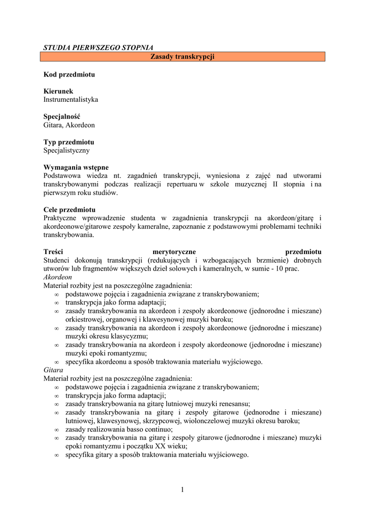STUDIA PIERWSZEGO STOPNIA Zasady transkrypcji Kod przedmiotu Kierunek Instrumentalistyka Specjalność Gitara, Akordeon Typ przedmiotu Specjalistyczny Wymagania wstępne Podstawowa wiedza nt. zagadnień transkrypcji, wyniesiona z zajęć nad utworami transkrybowanymi podczas realizacji repertuaru w szkole muzycznej II stopnia i na pierwszym roku studiów. Cele przedmiotu Praktyczne wprowadzenie studenta w zagadnienia transkrypcji na akordeon/gitarę i akordeonowe/gitarowe zespoły kameralne, zapoznanie z podstawowymi problemami techniki transkrybowania. Treści merytoryczne przedmiotu Studenci dokonują transkrypcji (redukujących i wzbogacających brzmienie) drobnych utworów lub fragmentów większych dzieł solowych i kameralnych, w sumie - 10 prac. Akordeon Materiał rozbity jest na poszczególne zagadnienia: • podstawowe pojęcia i zagadnienia związane z transkrybowaniem; • transkrypcja jako forma adaptacji; • zasady transkrybowania na akordeon i zespoły akordeonowe (jednorodne i mieszane) orkiestrowej, organowej i klawesynowej muzyki baroku; • zasady transkrybowania na akordeon i zespoły akordeonowe (jednorodne i mieszane) muzyki okresu klasycyzmu; • zasady transkrybowania na akordeon i zespoły akordeonowe (jednorodne i mieszane) muzyki epoki romantyzmu; • specyfika akordeonu a sposób traktowania materiału wyjściowego. Gitara Materiał rozbity jest na poszczególne zagadnienia: • podstawowe pojęcia i zagadnienia związane z transkrybowaniem; • transkrypcja jako forma adaptacji; • zasady transkrybowania na gitarę lutniowej muzyki renesansu; • zasady transkrybowania na gitarę i zespoły gitarowe (jednorodne i mieszane) lutniowej, klawesynowej, skrzypcowej, wiolonczelowej muzyki okresu baroku; • zasady realizowania basso continuo; • zasady transkrybowania na gitarę i zespoły gitarowe (jednorodne i mieszane) muzyki epoki romantyzmu i początku XX wieku; • specyfika gitary a sposób traktowania materiału wyjściowego. 1 Efekty kształcenia (uczenia się) po ukończeniu przedmiotu - w zakresie wiedzy • Posiada znajomość i zrozumienie podstawowych wzorców leżących u podstaw improwizacji i aranżacji (K1_W15). - w zakresie umiejętności • Posiada umiejętność wykorzystywania wiedzy dotyczącej podstawowych kryteriów stylistycznych wykonywanych utworów (K1_U05). - w zakresie kompetencji społecznych • Posiada podstawowe umiejętności kształtowania i tworzenia muzyki w sposób umożliwiający odejście od zapisanego tekstu nutowego (K1_U17). Metody nauczania Ćwiczenia, zajęcia grupowe. Nakład pracy studenta potrzebny do osiągnięcia efektów uczenia się ROK SEMESTR Punkty ECTS Ilość godzin w semestrze Rodzaj zaliczenia LEGENDA I 1 II 2 III 3 4 1 1 15 15 zal zs 5 6 zal – zaliczony; zs – zaliczenie ze stopniem; egz – egzamin; ed – egzamin dyplomowy Kryteria oceny Kolokwia pisemne, prace na zaliczenie semestrów, uwzględniające następujące kryteria: • zachowanie wzorców leżących u podstaw improwizacji, • wykorzystywanie wiedzy dotyczącej podstawowych kryteriów stylistycznych wykonywanych utworów, • wykazanie się umiejętnościami umożliwiającymi odejście od zapisanego tekstu nutowego. Literatura (piśmiennictwo) Akordeon Dawidow N., Metodyka perełożenij instrumentalnych proizwedenij dla bajana, Moskwa 1982. Fenjuk P., Chrestomatja bajanista, t. I-IV, Kijów 2008. Maurer W., Das Akkordeon, Wien 1983. Miszczenko A., Perełożenije muzykalnych proizwedenij dla dueta bajanow, Charków 2000. Puchnowski W. L., Dastych J., Akordeon od A do Z, Kraków 1966. Ziegenrücker W., Wicke P., Handbuch der populären Musik, Wiesbaden 1997. Gitara Poźniak P., Polska fantazja lutniowa na przełomie wieku XVI i XVII, Kraków 1966. Poźniak P., Utwory polskich lutnistów w rękopisie lorda Herberta of Cherbury, w: Z dziejów muzyki polskiej, Zeszyt Bydgoskiego Towarzystwa Naukowego, Bydgoszcz 1973. Poźniak P., Przejawy estetyki baroku w utworach lutniowych S. L. Weissa, w: Muzyka a społeczeństwo, Brzeg 1975. 2 Poźniak P., Twórczość Jakuba Reysa zwanego Polakiem na tle muzyki lutniowej XVI i XVII wieku, Kraków 1981. Poźniak P., Muzyka XV-XVI wieku i pojęcie renesansu w historiografii muzycznej, Kraków 2000. Wesołowski F., Basso continuo: teoria i praktyka, Łódź 2002. Język wykładowy Polski, możliwość prowadzenia zajęć w innych językach: angielskim, niemieckim, rosyjskim. Imię i nazwisko wykładowcy prof. Bogdan Dowlasz mgr Paweł Wlazło 3