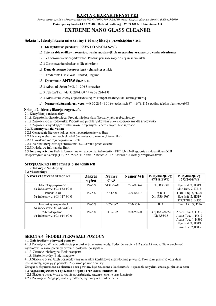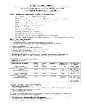 KARTA CHARAKTERYSTYKI Sporządzona zgodnie z Rozporządzeniem WE Nr 1907/2006 (REACH) oraz z Rozporządzeniem Komisji (UE) 453/2010 Data sporządzenia:01.12.2009r. Data aktualizacji: 27.03.2013r. Ilość stron: 1/5 EXTREME NANO GLASS CLEANER Sekcja 1. Identyfikacja mieszaniny i identyfikacja przedsiębiorstwa. 1.1 Identyfikator produktu: PŁYN DO MYCIA SZYB 1.2 Istotne zidentyfikowane zastosowania substancji lub mieszaniny oraz zastosowania odradzane: 1.2.1 Zastosowania zidentyfikowane: Produkt przeznaczony do czyszczenia szkła 1.2.2 Zastosowania odradzane: Nie określono 1.3 Dane dotyczące dostawcy karty charakterystyki: 1.3.1 Producent: Turtle Wax Limited, England 1.3.1Dystrybutor: AMTRA Sp. z o. o. 1.3.2 Adres: ul. Schonów 3, 41-200 Sosnowiec 1.3.3 Telefon/Fax: +48 32 2944100 / + 48 32 2944139 1.3.4 Adres email osoby odpowiedzialnej za kartę charakterystyki: [email protected] 1.4 Numer telefonu alarmowego: +48 32 294 41 30 (w godzinach 800- 1600), 112 ( ogólny telefon alarmowy)998 Sekcja 2. Identyfikacja zagrożeń. 2.1 Klasyfikacja mieszaniny: 2.1.1. Zagrożenia dla człowieka: Produkt nie jest klasyfikowany jako niebezpieczny. 2.1.2 Zagrożenie dla środowiska: Produkt nie jest klasyfikowany jako niebezpieczny dla środowiska 2.1.3 Zagrożenia wynikające z właściwości fizycznych i chemicznych: Nie są znane 2.2. Elementy oznakowania: 2.2.1 Oznaczenie literowe i określenie niebezpieczeństwa: Brak 2.2.2 Nazwy niebezpiecznych składników umieszczone na etykiecie: Brak 2.2.3 Określenie rodzaju zagrożenia: Brak 2.2.4 Warunki bezpiecznego stosowania: S2-Chronić przed dziećmi 2.2.4Dodatkowe informacje: Brak 2.3 Inne zagrożenia: Brak informacji na temat spełniania kryteriów PBT lub vPvB zgodnie z załącznikiem XIII Rozporządzenia Komisji (UE) Nr 253/2011 z dnia 15 marca 2011r. Badania nie zostały przeprowadzone. Sekcja3.Skład i informacje o składnikach 3.1 Substancje: Nie dotyczy 3.2 Mieszaniny: Nazwa chemiczna składnika 1-butoksypropan-2-ol Nr indeksowy: 603-052-00-8 Propan-2-ol Nr indeksowy: 603-117-00-0 1-metoksypropan-2-ol Nr indeksowy: 603-064-00-3 2-butoksyetanol Nr indeksowy: 603-014-00-0 Zakres stężeń Numer CAS Numer WE Klasyfikacja wg 67/548/EWG Klasyfikacja wg 1272/2008/WE 1%-5% 5131-66-8 225-878-4 Xi; R36/38 1%-5% 67-63-0 200-661-7 F; R11 Xi; R36, R67 1%-5% 107-98-2 203-539-1 R10 Eye Irrit. 2, H319 Skin Irrit. 2, H315 Flam. Liq. 2, H225 Eye Irrit. 2, H319 STOT SE 3, H336 Flam. Liq. 3,H226 1%-5% 111-76-2 203-905-0 Xn; R20/21/22 Xi; R36/38 Acute Tox. 4, H332 Acute Tox. 4, H312 Acute Tox. 4, H302 Eye Irrit. 2, H319 Skin Irrit. 2,H315 SEKCJA 4. ŚRODKI PIERWSZEJ POMOCY 4.1 Opis środków pierwszej pomocy: 4.1.1 Połknięcie: W razie połknięcia przepłukać jamę ustną wodą. Podać do wypicia 2-3 szklanki wody. Nie wywoływać wymiotów. W razie potrzeby przetransportować do szpitala. 4.1.2. Zatrucie inhalacyjne: Brak następstw 4.1.3. Skażenie skóry: Brak następstw 4.1.4.Skażenie oczu: Jeżeli poszkodowany nosi szkła kontaktowe niezwłocznie je wyjąć. Dokładnie przemyć oczy dużą ilością wody, wywijając powieki. Zapewnić pomoc okulisty. Uwaga: osoby narażone na skażenie oczu powinny być pouczone o konieczności i sposobie natychmiastowego płukania oczu 4.2 Najważniejsze ostre i opóźnione objawy oraz skutki narażenia: 4.2.1 Skażenie oczu: Może wystąpić podrażnienie, zaczerwienienie oraz łzawienie 4.2.2 Połknięcie: Mogą pojawić się mdłości, wymioty oraz ból brzucha KARTA CHARAKTERYSTYKI Sporządzona zgodnie z Rozporządzeniem WE Nr 1907/2006 (REACH) oraz z Rozporządzeniem Komisji (UE) 453/2010 Data sporządzenia:01.12.2009r. Data aktualizacji: 27.03.2013r. Ilość stron: 2/5 EXTREME NANO GLASS CLEANER 4.3 Wskazania dotyczące wszelkiej natychmiastowej pomocy lekarskiej i szczególnego postępowania z poszkodowanym: Nie dotyczy. Podjąć leczenie objawowe. SEKCJA 5. POSTĘPOWANIE W PRZYPADKU POŻARU 5.1 Środki gaśnicze: 5.1.1 Odpowiednie środki gaśnicze: Stosować proszek gaśniczy, CO2, woda-prądy rozproszone, pianę odporną na alkohol 5.1.2 Niewłaściwe środki gaśnicze: Woda- zwarty strumień wody 5.2 Szczególne zagrożenia związane z mieszaniną: Podczas spalania powstają drażniące, toksyczne i gryzące gazy 5.3 Informacje dla straży pożarnej: Środki ochrony ogólnej typowe w przypadku pożaru. Nie należy przebywać w zagrożonej ogniem strefie bez odpowiedniego ubrania odpornego na chemikalia i aparatu do oddychania z niezależnym obiegiem powietrza. Zagrożone pożarem zbiorniki usunąć jeśli to możliwe i nie wiąże się z nadmiernym ryzykiem lub chłodzić rozpyloną wodą z odpowiedniej odległości. SEKCJA 6. POSTĘPOWANIE W PRZYPADKU NIEZAMIERZONEGO UWOLIENIA DO ŚRODOWISKA 6.1 Indywidualne środki ostrożności, wyposażenie ochronne i procedury w sytuacjach awaryjnych: 6.1.1 Dla osób niezależących do personelu likwidującego skutki awarii: Ograniczyć dostęp osób postronnych do obszaru awarii do czasu usunięcia awarii. W przypadku dużych wycieków odizolować zagrożony obszar. Stosować środki ochrony indywidualnej. Unikać długotrwałego kontaktu ze skórą. Unikać kontaktu z oczami. Przestrzegać zasad i przepisów BHP obowiązujących przy pracy z preparatami chemicznymi. 6.1.2 Dla osób likwidujących skutki awarii: Usuwanie awarii i jej skutków może przeprowadzać wyłącznie przeszkolony personel. Stosować odzież ochronną na chemikalia. 6.2 Środki ostrożności w zakresie ochrony środowiska: Nie dopuścić do przedostania się do źródeł wody pitnej, gleby, kanalizacji. O ile to możliwe zlikwidować wyciek ( zamknąć dopływ cieczy, uszczelnić, uszkodzone opakowanie umieścić w szczelnym opakowaniu ochronnym). W razie potrzeby powiadomić władze i służby ratownictwa chemicznego. 6.3 Metody i materiały zapobiegające rozprzestrzenieniu się skażenia i służące do usuwania skażenia: Mniejszy wyciek zatrzeć ręcznikiem papierowym. Przy dużych wyciek