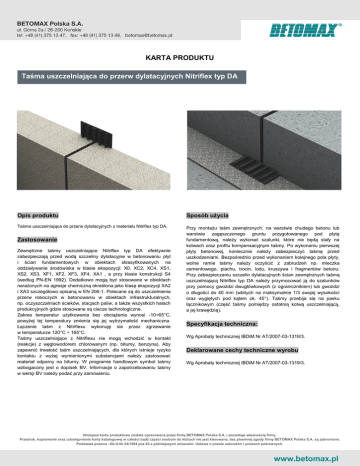 KARTA PRODUKTU Taśma uszczelniająca do przerw dylatacyjnych Nitriflex typ DA Opis produktu Sposób użycia Taśma uszczelniająca do przerw dylatacyjnych z materiału Nitriflex typ DA. Przy montażu taśm zewnętrznych, na warstwie chudego betonu lub warstwie zagęszczonego gruntu przygotowanego pod płytę fundamentową, należy wykonać szalunki, które nie będą stały na kotwach oraz profilu kompensacyjnym taśmy. Po wykonaniu pierwszej płyty betonowej, koniecznie należy zabezpieczyć taśmę przed uszkodzeniami. Bezpośrednio przed wykonaniem kolejnego pola płyty, wolne ramie taśmy należy oczyścić z zabrudzeń np. mleczka cementowego, piachu, trocin, lodu, kruszywa i fragmentów betonu. Przy zabezpieczaniu szczelin dylatacyjnych ścian zewnętrznych taśmą uszczelniającą Nitriflex typ DA należy przymocować ją do szalunków przy pomocy gwoździ dwugłówkowych (z ogranicznikiem) lub gwoździ o długości do 40 mm (wbitych na maksymalnie 1/3 swojej wysokości oraz wygiętych pod kątem ok. 45°). Taśmy przebija się na pasku łącznikowym (część taśmy pomiędzy ostatnią kotwą uszczelniającą, a jej krawędzią). Zastosowanie Zewnętrzne taśmy uszczelniające Nitriflex typ DA efektywnie zabezpieczają przed wodą szczeliny dylatacyjne w betonowaniu płyt i ścian fundamentowych w obiektach sklasyfikowanych na oddziaływanie środowiska w klasie ekspozycji: X0, XC2, XC4, XS1, XS2, XS3, XF1, XF2, XF3, XF4, XA1 , a przy klasie konstrukcji S4 (według PN-EN 1992). Dodatkowo mogą być stosowane w obiektach narażonych na agresje chemiczną określona jako klasę ekspozycji XA2 i XA3 szczegółowo opisaną w EN 206-1. Polecane są do uszczelnienia przerw roboczych w betonowaniu w obiektach infrastrukturalnych, np. oczyszczalniach ścieków, stacjach paliw, a także wszystkich halach produkcyjnych gdzie stosowane są ciecze technologiczne. Zakres temperatur użytkowania bez obciążenia wynosi -10÷65°C, powyżej tej temperatury zmienia się jej wytrzymałość mechaniczna. Łączenie taśm z Nitriflexu wykonuję sie przez zgrzewanie w temperaturze 120°C ÷ 165°C. Taśmy uszczelniające z Nitriflexu nie mogą wchodzić w kontakt (reakcje) z węglowodorem chlorowanym (np. bitumy, benzyna). Aby zapewnić trwałość taśm uszczelniających, dla których istnieje ryzyko kontaktu z wyżej wymienionymi substancjami należy zastosować materiał odporny na bitumy. W programie handlowym symbol taśmy wzbogacony jest o dopisek BV. Informacje o zapotrzebowaniu taśmy w wersji BV należy podać przy zamówieniu. Specyfikacja techniczna: Wg Aprobaty technicznej IBDiM Nr AT/2007-03-1319/3. Deklarowane cechy techniczne wyrobu Wg Aprobaty technicznej IBDiM Nr AT/2007-03-1319/3. Niniejsza karta produktowa została opracowana przez firmę BETOMAX Polska S.A. i pozostaje własnością firmy. Przedruk, kopiowanie oraz udostępnianie karty katalogowej w całości bądź części osobom do których nie jest kierowana, bez pisemnej zgody firmy BETOMAX Polska S.A. są zabronione. Podstawa prawna –Dz.U.Nr 24/1994 poz 83 z późniejszymi zmianami. Ustawa o prawie autorskim i prawach pokrewnych. Dane handlowe Nitriflex Symbol a [mm] b [mm] c [mm] f [mm] Kotwy Opakowanie Jednostka rolka/paleta [mb/szt.] sprzedaży Masa [kg/mb] Nr art. DA 240/25 240 90 4,5 25 4 25/4 rolka 2,20 SU-TU-BP-0-02198 DA 240/35 240 90 5,0 35 4 25/4 rolka 3,70 SU-TU-BP-0-02200 DA 240/45 240 90 5,0 45 4 25/4 rolka 4,10 SU-TU-BP-0-02202 DA 320/25 320 110 4,5 25 6 25/4 rolka 2,50 SU-TU-BP-0-02211 DA 320/35 320 110 5,0 35 6 25/4 rolka 4,70 SU-TU-BP-0-02213 AD 320/45 320 110 5,0 45 6 25/4 rolka 5,10 SU-TU-BP-0-02215 DA 500/25 500 120 4,5 25 8 25/2 rolka 5,60 SU-TU-BP-0-06416 DA 500/35 500 120 5,0 35 8 25/2 rolka 6,90 SU-TU-BP-0-02224 Z chwilą wydania przez nas nowej karty produktu niniejsza traci ważność. Data wydania: 2013-06-04 Niniejsza karta produktowa została opracowana przez firmę BETOMAX Polska S.A. i pozostaje własnością firmy. Przedruk, kopiowanie oraz udostępnianie karty katalogowej w całości bądź części osobom do których nie jest kierowana, bez pisemnej zgody firmy BETOMAX Polska S.A. są zabronione. Podstawa prawna –Dz.U.Nr 24/1994 poz 83 z późniejszymi zmianami. Ustawa o prawie autorskim i prawach pokrewnych.