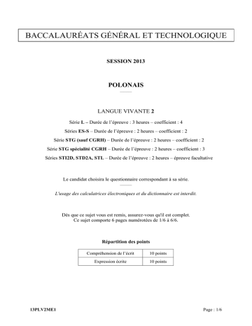 BACCALAURÉATS GÉNÉRAL ET TECHNOLOGIQUE SESSION 2013 POLONAIS _______ LANGUE VIVANTE 2 Série L – Durée de l’épreuve : 3 heures – coefficient : 4 Séries ES-S – Durée de l’épreuve : 2 heures – coefficient : 2 Série STG (sauf CGRH) – Durée de l’épreuve : 2 heures – coefficient : 2 Série STG spécialité CGRH – Durée de l’épreuve : 2 heures – coefficient : 3 Séries STI2D, STD2A, STL – Durée de l’épreuve : 2 heures – épreuve facultative Le candidat choisira le questionnaire correspondant à sa série. _______ L'usage des calculatrices électroniques et du dictionnaire est interdit. Dès que ce sujet vous est remis, assurez-vous qu'il est complet. Ce sujet comporte 6 pages numérotées de 1/6 à 6/6. Répartition des points 13PLV2ME1 Compréhension de l’écrit 10 points Expression écrite 10 points Page : 1/6 Texte 1 LUDZIE MOŻE I NIE SĄ ŹLI... Po 30 latach pracy w Stoczni Gdańskiej wręczono mi zwolnienie dyscyplinarne1, świadectwo pracy i zaległą wypłatę. Urzędniczka, która mnie zwalniała2, powiedziała: - Pani Aniu, to straszne, co robią z panią, ja dwie tabletki na uspokojenie musiałam wziąć, żeby pani dać to zwolnienie. 5 Zapytałam: - A dlaczego właściwie pani to robi? - Zwolnią mnie, jak nie zrobię - powiedziała - a wtedy przyjdzie ktoś inny i zrobi to samo. - To niech ten inny też nie robi. I jeszcze inny. Wszystkich nie zwolnią przecież. Dlaczego ludzie nie rozumieją tak prostej sprawy, jak pani uważa? 10 Anna Walentynowicz na pytanie, czy ludzie są źli. - Kiedy wybuchnął strajk, zaczęły się dziać z ludźmi jakieś dziwne rzeczy. Ludzie zrobili się dobrzy. Od razu, w ciągu jednego dnia. Nawet jeden pan, jeden z moich najgorszych prześladowców3, zaczął tak jakoś odważnie przemawiać do mikrofonu, ale tego nie wytrzymałam już i powiedziałam, jak się zachowywał wcześniej. Sytuacja zrobiła się trochę 15 niemiła i Lech musiał salę uspokoić. - Ja sam wyprowadzę tego pana, żeby mu się nie stała krzywda. I przeprowadził go do bramy, za bramę nawet, poprzez tłum, który czekał na niego. Ten człowiek był u mnie niedawno i mnie przepraszał. Wszyscy mnie przepraszają teraz i wszyscy są dla mnie bardzo mili i dobrzy. Poszłam do nich 20 któregoś dnia w czasie strajku z dziennikarzem angielskim - jakże się mną ucieszyli. Musieliśmy, pani Aniu, to wszystko robić, bo baliśmy się - powiedzieli mi. - Ale teraz się już nie boicie? - spytałam. - Nie, teraz nie. I rzuciliśmy się sobie w ramiona. Tak że - jak przypuszczam - ludzie może i nie są źli, tylko się bardzo boją. 1 zwolnienie dyscyplinarne - licenciement pour faute zwalniać kogoś z pracy - licencier 3 prześladowca – persécuteur 2 13PLV2ME1 Page : 2/6 Anna Walentynowicz na pytanie o dzień 14 sierpnia. 25 Rano byłam w naszej przychodni u lekarza. Ktoś powiedział: strajk. Spojrzałam na dźwigi4 za murem. Stały. Parę minut po dwunastej weszłam do stoczni5. W bramie stały jakieś dwie panie z kwiatami i okazało się, że były to kwiaty dla mnie. Weszłam i zobaczyłam ogromny tłum, jak podczas wizyty papieża. Nad tłumem zobaczyłam transparent: ŻĄDAMY PRZYJĘCIA WALENTYNOWICZ. 30 Starałam się nie płakać. Hanna Krall, Ludzie może i nie są źli... Wywiad z Anną Walentynowicz 4 5 dźwig - grue stocznia - chantier naval Texte 2 DANUTA WAŁĘSA O SIERPNIU 1980 Opowiedziałam o tym, co z tych dni sierpniowych pozostało w mojej pamięci. Wówczas nie analizowałam, jakie będą konsekwencje tych wydarzeń6. Dziś myślę, że Sierpień zapoczątkował naszą wolność. Wolność, którą każdy mógł zagospodarować7 po swojemu. Zagospodarować bardziej lub mniej, lecz jednak pomógł rozwinąć skrzydła8. Ci, którzy mieli 5 szczęście lub umieli się znaleźć w nowej sytuacji, doceniają tamte wydarzenia i są wdzięczni9. Niektórzy do końca życia będą tęsknić za Edwardem Gierkiem. Są też ludzie obojętni. Ale są i tacy, którzy w każdym systemie będą niezadowoleni i będą narzekać10. Wśród nich osoby niezaradne11, oczekujące tylko na to, że ktoś coś im w życiu da, bo im to coś się należy12. Zdarzało się, że przychodziły takie osoby pod furtkę13 i nagabując14 mnie o 10 pieniądze, mówiły: „strajkowałem z pani mężem. Teraz nie mam pracy.” Nie, nie prosiły o pomoc w znalezieniu pracy, chciały pieniędzy. Wiem, że o dobrą pracę nie jest łatwo. Ale żadna praca nie hańbi15. 6 wydarzenie - événement. zagospodarować - gérer 8 rozwinąć skrzydła - déployer les ailes 9 wdzięczny - reconnaissant (adj.) 10 narzekać - se plaindre 11 niezaradny (adj.) = ten, kto sobie nie radzi 12 coś należy się - cela est dû 13 furtka – portail, portillon 14 nagabywać = prosić natrętnie 15 żadna praca nie hańbi (proverbe) – il n’y a pas de sot métier 7 13PLV2ME1 Page : 3/6 Było też wielu ludzi ideowych, którzy w Sierpniu strajkowali, w latach osiemdziesiątych działali w podziemiu16, a dziś klepią biedę17. Chorym powinno w jakiś sposób pomóc 15 państwo. Choć jest to bardzo delikatna sprawa. Wtedy, w Sierpniu, w stoczni pracowało kilkanaście tysięcy ludzi, ale nie wszyscy z tych kilkunastu tysięcy strajkowali. Byli i tacy, którzy w czasie strajku remontowali mieszkania, pracowali w ogródkach. Tak, byli tacy. Po prostu samo życie. Dowiedziałam się o tym po Sierpniu. 20 W sumie mój obraz polskiego Sierpnia jest piękny, może idealistyczny. Ale, niestety, to nie ukwiecona brama numer 2 Stoczni Gdańskiej z 1980 roku, lecz pękający mur berliński stał się symbolem wolności i zjednoczenia Europy. Boli mnie, że w Europie i na świecie bardziej pamięta się właśnie o zburzeniu18 muru berlińskiego niż o polskim Sierpniu. DANUTA WAŁĘSA, Marzenia i tajemnice 16 podziemie - opposition clandestine au régime politique klepać biedę – vivre dans la misère 18 zburzyć - démolir 17 13PLV2ME1 Page : 4/6 Travail à fai