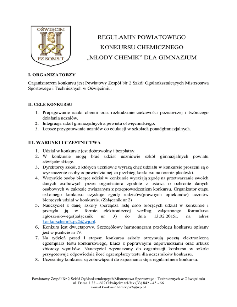 REGULAMIN POWIATOWEGO KONKURSU CHEMICZNEGO „MŁODY CHEMIK” DLA GIMNAZJUM I. ORGANIZATORZY Organizatorem konkursu jest Powiatowy Zespół Nr 2 Szkół Ogólnokształcących Mistrzostwa Sportowego i Technicznych w Oświęcimiu. II. CELE KONKURSU 1. Propagowanie nauki chemii oraz rozbudzanie ciekawości poznawczej i twórczego działania uczniów. 2. Integracja szkół gimnazjalnych z powiatu oświęcimskiego. 3. Lepsze przygotowanie uczniów do edukacji w szkołach ponadgimnazjalnych. III. WARUNKI UCZESTNICTWA 1. Udział w konkursie jest dobrowolny i bezpłatny. 2. W konkursie mogą brać udział uczniowie szkół gimnazjalnych powiatu oświęcimskiego. 3. Dyrektorzy szkół, z których uczniowie wyrażą chęć udziału w konkursie proszeni są o wyznaczenie osoby odpowiedzialnej za przebieg konkursu na terenie placówki. 4. Wszystkie osoby biorące udział w konkursie wyrażają zgodę na przetwarzanie swoich danych osobowych przez organizatora zgodnie z ustawą o ochronie danych osobowych w zakresie związanym z przeprowadzeniem konkursu. Organizator etapu szkolnego konkursu uzyskuje zgodę rodziców(prawnych opiekunów) uczniów biorących udział w konkursie. (Załącznik nr 2) 5. Nauczyciel z danej szkoły sporządza listę osób biorących udział w konkursie i przesyła ją w formie elektronicznej według załączonego formularza zgłoszeniowego(załącznik nr 3) do dnia 13.02.2015r. na adres [email protected]. 6. Konkurs jest dwuetapowy. Szczegółowy harmonogram przebiegu konkursu opisany jest w punkcie nr IV. 7. Na tydzień przed I etapem konkursu szkoły otrzymują pocztą elektroniczną egzemplarz testu konkursowego, klucz z poprawnymi odpowiedziami oraz arkusz zbiorczy wyników. Nauczyciel wyznaczony do organizacji konkursu w szkole przygotowuje odpowiednią ilość egzemplarzy testu dla uczestników konkursu. 8. Uczestnicy konkursu są zobowiązani do zapoznania się z regulaminem konkursu. Powiatowy Zespół Nr 2 Szkół Ogólnokształcących Mistrzostwa Sportowego i Technicznych w Oświęcimiu ul. Bema 8 32 – 602 Oświęcim tel/fax (33) 842 - 45 - 66 e-mail [email protected] IV. PRZEBIEG KONKURSU 1. Eliminacje konkursowe na wszystkich etapach będą przeprowadzone w formie pisemnej. 2. Etap pierwszy zostanie przeprowadzony w szkołach zgłoszonych do konkursu drogą elektroniczną przez nauczycieli, których wyznaczy dyrektor. 3. Pierwszy etap konkursu będzie obejmował pisemny test z chemii z zakresu tematycznego przedstawionego w punkcie nr VIII. 4. Szkolny etap konkursu odbędzie się 11.03.2015r. o godzinie 10.00 w siedzibach szkół i trwać będzie 45 minut. 5. W drugim etapie konkursu biorą udział uczniowie, którzy uzyskali najwyższą liczbę punktów w etapie szkolnym, jednak nie mniej niż 60% punktów możliwych do uzyskania i co najwyżej 3 uczestników z każdej szkoły. 6. Nauczyciele odpowiedzialni za przebieg konkursu na terenie danej szkoły: a) Oceniają prace uczniów zgłoszonych do konkursu według przesłanego klucza. b) Umożliwiają wgląd do prac uczniom, ich rodzicom(prawnym opiekunom) w terminie do 7 dni. c) Przesyłają do organizatora konkursu wypełniony protokół pisemny z przebiegu eliminacji szkolnych w formie elektronicznej do dnia 20.03.2015r. na adres [email protected]. d) Zabezpieczają i przechowują prace uczniów oraz zgody rodziców do dnia 31.08.2015r. 7. Pełna lista uczestników drugiego etapu konkursu wraz z uzyskanym wynikiem punktowym będzie przesłana szkołom drogą elektroniczną. 8. Drugi etap konkursu zostanie przeprowadzony w Powiatowym Zespole Nr 2 Szkół Ogólnokształcących Mistrzostwa Sportowego i Technicznych w Oświęcimiu w dniu 28.04.2015r. o godzinie 10.00 i trwać będzie 90 minut. 9. Prace uczniów po drugim etapie ocenia komisja konkursowa, w skład której wchodzą organizatorzy konkursu pod przewodnictwem dyrektora PZ Nr SOMSiT. 10. Prace pisemne z drugiego etapu zabezpiecza i przechowuje z prowadzoną dokumentacją konkursu jego organizator. 11. Rozstrzygnięcie konkursu i ogłoszenie zwycięzców zostanie opublikowane na stronie internetowej organizatora www.pz2.edu.pl. 12. O ostatecznych wynikach konkursu drogą oficjalną zostaną powiadomieni również Dyrektorzy szkół, których uczniowie zostaną laureatami. 13. Rozstrzygnięcie konkursu, ogłoszenie zwycięzców w formie publikacji na stronie internetowej organizatora www.pz2.edu.pl nastąpi najpóźniej do dnia 18.05.2015r. 14. Uroczyste wręczenie dyplomów i nagród zwycięzcom konkursu odbędzie się 13.06.2015r. w czasie uroczystego pikniku szkolnego w Powiatowym Zespole Nr 2 Szkół Ogólnokształcących Mistrzostwa Sportowego i Technicznych. Powiatowy Zespół Nr 2 Szkół Ogólnokształcących Mistrzostwa Sportowego i Technicznych w Oświęcimiu ul. Bema 8 32 – 602 Oświęcim tel/fax (33) 842 - 45 - 66 e-mail [email protected] V. PROCEDURY KODOWANIA PRAC 1. Prace uczniów są kodowane na każdym etapie konkursu. 2. Procedurę kodowania prac ustalają w pierwszym etapie przewodniczący komisji szkolnych, a w drugim etapie komisja konkursowa organizatora. 3. Zakodowane dane uczniów są zabezpieczane na czas sprawdzania zadań. 4. Po zakończeniu oceniania prace uczniów zostają rozkodowane. VI. TRYB ODWOŁAWCZY 1. Uczniowie, ich rodzice(prawni opiekunowie) oraz ich nauczyciele mają prawo wglądu do prac w następującym terminie 19.05.2015r – od godz. 13.00 do godz.18.00 w sali numer 259. 2. Prace uczestników będą udostępniane do wglądu wyłącznie w obecności członka komisji konkursowej bez możliwości kopiowania. 3. Odwołanie może być przesłane przez uczestnika konkursu e-mailem lub złożone osobiście, musi zawierać wskazanie, które fragmenty oceny są kwestionowane wraz z merytorycznym uzasadnieniem w terminie do dwóch tygodni od daty konkursu. 4. Odwołania będą rozpatrywane w terminie do 7 dni od daty wpływu. 5. Pisemne odpowiedzi na złożone zastrzeżenia są sporządzane i wysyłane zainteresow