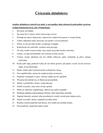 Ćwiczenia składniowe Analiza składniowa (określ typ zdań, w przypadku zdań złożonych podrzędnie zarówno według Klemensiewicza, jak i Polańskiego) 1. Kto pyta, nie błądzi. 2. Jan musi być w pracy, skoro leżą tu jego rzeczy. 3. Pomógł mu dosyć skutecznie, mianowicie załatwił mu pracę w swojej firmie. 4. Ledwo zdążyłem zmyć naczynia, już pytali o coś do jedzenia. 5. Wiem, że nie jest taki święty, na jakiego wygląda. 6. Ktokolwiek nas odwiedzi, zostanie mile przyjęty. 7. Na ulicy leżała warstwa lodu, więc starał się jechać bardzo ostrożnie. 8. Ludzie, co tędy przechodzili, nie wierzyli swoim oczom. 9. Twarzy swego opiekuna już nie zdołał zobaczyć, gdyż zasłaniały ją plecy innego człowieka. 10. Kiedy jadł zupę, podnosił łyżkę do ust takim gestem, jak gdyby czynić raczył zaszczyt zupie, że ją konsumuje. 11. Ranny zmarł, gdyż miał poważnie uszkodzony mózg. 12. Ewa zgubiła bilet, zatem nie mogła przyjść na koncert. 13. Pojechał z kolegami w góry, chociaż matka się nie zgodziła. 14. Wczoraj dowiedział się, że Basia już przyjechała. 15. Ilekroć wychodziła z domu, wyłączała gaz. 16. Zrobił wszystko, żeby mieć święty spokój. 17. Mimo że założono sygnalizację, zdarzył się ciężki wypadek. 18. Reklama nakłania potencjalnego klienta, żeby kupił dany produkt. 19. Napisał obszerny artykuł, żeby przedstawić wyniki swoich prac badawczych. 20. Zanim wyszedł z domu, zamknął szczelnie okna. 21. Rodzice chcieli pojechać nad morze, lecz matka nie dostała urlopu. 22. Przeszedł tam, skąd było lepiej widać. 1 Wskaż człony składniowe w podanych zdaniach, weź pod uwagę niepodzielne struktury: 1. W zaułku pod arkadami czytałem wtedy poemat o kimś, kto mieszkał tuż obok, pod tytułem „Godzina myśli“. (Miłosz) 2. Nie bądź taki ufny i pamiętaj, że i w Paryżu nie robią z owsa ryżu. 3. Głupiście! 4. O, jak błyszczy! To śnieg na Górze Trzykrzystej i na Biekieszowej Górze, którego nie stopi oddech krótkotrwałych ludzi. (Miłosz) 5. Do drzwi mieszkania dotarł tylko po omacku. 6. Piotr jest zań odpowiedzialny. 7. W wyjaśnieniu przyczyn katastrofy lotniczej może pomóc tylko czarna skrzynka. 8. Matka znów robi z igły widły. 9. Każde popołudnie zapełniał się Plac Defilad tłumem ludzi, którzy spieszyli się z pracy do domu. 10. Żebyś ty nas kiedyś odwiedził! Wskaż wszystkie dwuskładnikowe grupy składniowe, znajdź człon konstytutywny i określ typ grupy: 1. Te rzędami portretów zdobione filary ozwały się doń zewsząd głosami przeszłości. (Mickiewicz) 2. W tym roku było wyjątkowo dużo grzybów, malin i jeżyn. 3. Na trzecim piętrze mieszczą się biura dobrze znanej w tym mieście firmy komputerowej. 4. Sam wierzchołek góry zdobiły zasadzone drzew i kwiatów wieńce. (Mickiewicz) Zastąp strukturę zdaniową przez nominalizację 1. Swojego najlepszego przyjaciela poznał, gdy studiował w Krakowie. 2. Biegł, aż utracił oddech. 3. Sprawę planowanej podwyżki płac omówiono, gdy było spotkanie z pracownikami. 4. Czuła się źle, bo się przejadła. 5. Wycieczkę w góry odwołano, ponieważ padał deszcz. 6. Pojechał na konferencje, żeby przedstawić wyniki swoich badań. 7. Uniknął wypadkowi, bo w tym czasie wyjechał do Pragi. 8. Zgodził się przyjechać, jeżeli zwrócą mu koszty podróży. 9. Ranny zmarł, gdyż miał uszkodzony mózg. 10. Zrobił to, żeby uniknąć zarzutów. 11. Rozchorował się, bo głodował. 12. Poszedł do kina, chociaż matka mu to zakazała. 2 Czy podkreślone wyrazy są składnikami (członami składniowymi) podanych zdań? O Jowiszu gromowładny, bądź miłosierny! Niech go gęś kopnie! Fu, jakie to wstrętne! Czy mają państwo chwilę czasu? Obyś żył wiecznie, wasza świątobliwość! Daj mi, debilu, święty spokój. Obiecał, że przyjdzie, ale przedtem zatelefonuje. Weszli do sali, w której siedział ambasador z żoną. Ci studenci, którzy zdali wszystkie egzaminy, mogą wyjechać na staż. Ktokolwiek dowie się coś o zaginionej osobie, niech natychmiast zgłosi się na policję. Brat nie przyszedł na spotkanie, co mnie bardzo zdziwiło. W miejscach, gdzie się pali, mogę mieć problemy zdrowotne. Wtedy, kiedy wojna wybuchła, byłem za granicą. Pytał mnie, kto tu był. Nie wiedział, co się wydarzyło. Kto pyta, nie błądzi. Kto chce, niech idzie ze mną. Dostał książkę, jakiej dawno pragnął. Powiedziano mi, dokąd mam iść. Mówił o tym, że nie ma pieniędzy. Porozmawiaj z tym, kto ten nonsens wymyślił. Zobaczył list, którego nigdy przedtem nie widział. Ten, kto stłukł okno na korytarzu, proszony jest o jego ponowne oszklenie. Gdziekolwiek będę, nie zapomnę o twojej sprawie. Nie przyjechał dlatego, że był chory. Szedł szybkim krokiem, dlatego że był mocno spóźniony. Proszę wskazać poszczególne typy wypowiedzeń (zdania, oznajmienia, zawiadomienia) 1. 2. 3. 4. 5. 6. Każdy podróżny musi posiadać ważny bilet na przejazd. Błysnęło. Kochana mamo! Nie wypada odmówić. Młodzież przyszłością narodu. Kowalski przyszedł, usiadł i nie czekając zaczął opowiadać. 3 7. Baczność! 8. Ochłodziło się. 9. Milcz! 10. Gazety wieczorne. 11. Słychać kłótnię. 12. Zawiadowca stacji 13. Trzeba wstawić nową szybę. 14. Za zabójstwo. 15. Ojciec chory. Proszę przekształcić imiesłowowe równoważniki zdań w zdania podrzędne oraz określić typy tych zdań. 1. Jadąc do pracy, spotkałem kolegę. 2. Szedł, mocno kulejąc. 3. Pracując w banku, miał dostęp do wielu danych. 4. Oddychał, głośno sapiąc. 5. Nie mogąc znaleźć pracy, wyjechała za granicę. 6. Czując się zdrowy, wypisał się ze szpitala na własne żądanie. 7. Tańczył, kręcąc się na boki. 8. Bojąc się konsekwencji swojego czynu, zatarł wszystkie ślady. 9. Rolnicy protestowali, blokując drogi. 10. Oglądając telewizję, robiłam na drutach. Proszę wskazać błędne