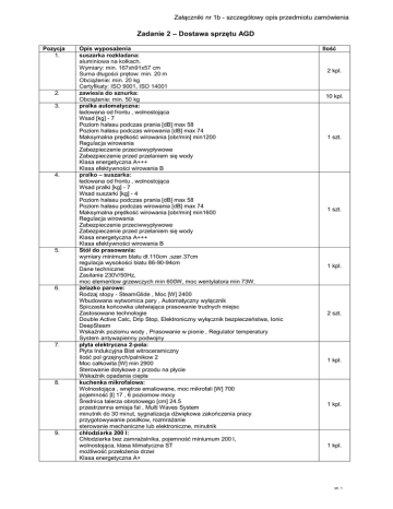 Załączniki nr 1b - szczegółowy opis przedmiotu zamówienia Zadanie 2 – Dostawa sprzętu AGD Pozycja 1. 2. 3. 4. 5. 6. 7. 8. 9. Opis wyposażenia suszarka rozkładana: aluminiowa na kołkach. Wymiary: min. 167xh91x57 cm Suma długości prętow: min. 20 m Obciążenie: min. 20 kg Certyfikaty: ISO 9001, ISO 14001 zawiesia do sznurka: Obciążenie: min. 50 kg pralka automatyczna: ładowana od frontu , wolnostojąca Wsad [kg] - 7 Poziom hałasu podczas prania [dB] max 58 Poziom hałasu podczas wirowania [dB] max 74 Maksymalna prędkość wirowania [obr/min] min1200 Regulacja wirowania Zabezpieczenie przeciwwypływowe Zabezpieczenie przed przelaniem się wody Klasa energetyczna A+++ Klasa efektywności wirowania B pralko – suszarka: ładowana od frontu , wolnostojąca Wsad pralki [kg] - 7 Wsad suszarki [kg] - 4 Poziom hałasu podczas prania [dB] max 58 Poziom hałasu podczas wirowania [dB] max 74 Maksymalna prędkość wirowania [obr/min] min1600 Regulacja wirowania Zabezpieczenie przeciwwypływowe Zabezpieczenie przed przelaniem się wody Klasa energetyczna A+++ Klasa efektywności wirowania B Stół do prasowania: wymiary minimum blatu dł.110cm ,szer.37cm regulacja wysokości blatu 86-90-94cm Dane techniczne: Zasilanie 230V/50Hz, moc elementow grzewczych min 600W, moc wentylatora min 73W. żelazko parowe: Rodzaj stopy - SteamGlide , Moc [W] 2400 Wbudowana wytwornica pary , Automatyczny wyłącznik Spiczasta końcowka ułatwiająca prasowanie trudnych miejsc Zastosowane technologie Double Active Calc, Drip Stop, Elektroniczny wyłącznik bezpieczeństwa, Ionic DeepSteam Wskaźnik poziomu wody , Prasowanie w pionie , Regulator temperatury System antywapienny podwojny płyta elektryczna 2-pola: Płyta Indukcyjna Blat witroceramiczny Ilość pol grzejnych/palnikow 2 Mοc całkowita [W] min 2900 Sterowanie dotykowe z przodu na płycie Wskaźnik opadania ciepła kuchenka mikrofalowa: Wοlnostojąca , wnętrze emaliowane, moc mikrofali [W] 700 pojemność [l] 17 , 6 poziomow mocy Średnica talerza obrotowego [cm] 24.5 przestrzenna emisja fal , Multi Waves System minutnik do 30 minut, sygnalizacja dźwiękowa zakończenia pracy przygotowywanie posiłkow, rozmrażanie sterowanie mechaniczne lub elektroniczne, minutnik chłodziarka 200 l: Chłodziarka bez zamrażalnika, pojemność miniumum 200 l, wolnostojąca, klasa klimatyczna ST możliwość przełożenia drzwi Klasa energetyczna A+ Ilość 2 kpl. 10 kpl. 1 szt. 1 szt. 1 kpl. 2 szt. 1 kpl. 1 kpl. 1 kpl. str. 1 Załączniki nr 1b - szczegółowy opis przedmiotu zamówienia 10. 11. 12. 13. 14. 15. 16. 17. 18. 19. Zużycie energii [kWh/24h] min. 0.34 Zużycie energii [kWh/rok] max.124 Sterowanie mechaniczne czajnik elektryczny: Mοc grzałki [W] 2400 , pojemność [l] 1.5 automatyczne wyłączenie po zagotowaniu, automatyczne wyłączenie w przypadku gotowania bez wody, bezpiecznik termiczny podstawa antypoślizgowa, grzałka ukryta, obrotowa podstawa wskaźnik poziomu wody dwustronny, zatrzaskiwana pokrywa filtr antywapniowy wyjmowany kosz na śmieci pedałowy: pojemność do 20L stal nierdzewna lakierowana szczelne zamknięcie pokrywy pokrywa z funkcją "zawsze otwarte" wyjmowane, wewn. wiaderko z pałąkiem niewidoczne mocowanie worka stalowy pedał nierysująca podstawa bezpieczna dla podłogi uchwyt do przenoszenia dozownik mydła: pojemność zbiornika min. 800 ml mydło uzupełniane z kanistra kolor biały okienko do kontroli poziomu mydła materiał tworzywo ABS zamykany na kluczyk pojemnik na ręczniki jednorazowe: pojemność do 500 szt. ręcznikow kolor biały materiał tworzywo ABS okienko do kontroli ilości ręcznikow w pojemniku zamykany na kluczyk pojemnik na papier toaletowy: pojemność na papier o maksymalnej średnicy roli 19 cm kolor biały materiał tworzywo ABS okienko do kontroli ilości papieru w pojemniku zamykany na kluczyk zasłonka prysznicowa z pałakiem: Drążek z rury aluminiowej malowany proszkowo Kolor biały Zasłonka transparentna PVC kosz pedałowy na zużyte ręczniki: pojemność do 20L stal nierdzewna lakierowana szczelne zamknięcie pokrywy pokrywa z funkcją "zawsze otwarte" wyjmowane, wewn. wiaderko z pałąkiem niewidoczne mocowanie worka stalowy pedał nierysująca podstawa bezpieczna dla podłogi uchwyt do przenoszenia dozownik mydła: pojemność zbiornika min. 800 ml mydło uzupełniane z kanistra kolor biały okienko do kontroli poziomu mydła materiał tworzywo ABS zamykany na kluczyk pojemnik na ręczniki jednorazowe: pojemność do 500 szt. ręcznikow kolor biały materiał tworzywo ABS okienko do kontroli ilości ręcznikow w pojemniku zamykany na kluczyk pojemnik na papier toaletowy: pojemność na papier o maksymalnej średnicy roli 19 cm 1 szt. 1 szt. 1 szt. 1 szt. 1 szt. 1 szt. 1 kpl. 1 szt. 1 szt. 1 szt. str. 2 Załączniki nr 1b - szczegółowy opis przedmiotu zamówienia 20. 21. 22. 23. 24. 25. 26. 27. 28. kolor biały materiał tworzywo ABS okienko do kontroli ilości papieru w pojemniku zamykany na kluczyk kotara wejściowa do kabin z drążkiem: Drążek z rury aluminiowej malowany proszkowo Kolor biały Zasłonka transparentna PVC kosz pedałowy na zużyte ręczniki: pojemność do 20L stal nierdzewna lakierowana szczelne zamknięcie pokrywy pokrywa z funkcją "zawsze otwarte" wyjmowane, wewn. wiaderko z pałąkiem niewidoczne mocowanie worka stalowy pedał nierysująca podstawa bezpieczna dla podłogi uchwyt do przenoszenia dozownik mydła: pojemność zbiornika min. 500 ml mydło uzupełniane z kanistra kolor biały okienko do kontroli poziomu mydła materiał tworzywo ABS zamykany na kluczyk dozownik płynu dezynfekcyjnego: pojemność zbiornika min. 500 ml płyny uzupełniane z kanistra zamykany na kluczyk mechanizm dozujący wykonany z tworzywa sztucznego do wszystkich rodzajow płynow dezynfekcyjnych przezroczysty pojemnik do kontroli poziomu płynu dezynfekcyjnego uruchamianie przyciskiem łokciowym ze stali nierdzewnej pojemnik na ręczniki jednorazowe: pojemność do 5