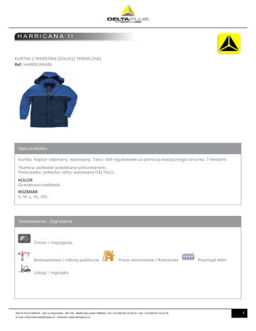 H ARRICANA II KURTKA Z WARSTWĄ IZOLACJI TERMICZNEJ Ref. HARRICANABI Opis produktu Kurtka. Kaptur odpinany, watowany. Talia i dół regulowane za pomocą elastycznego sznurka. 7 kieszeni. Tkanina: poliester powlekany poliuretanem. Podszewka: poliester tafta, watowana DELTALU. KOLOR Granatowo-niebieski ROZMIAR S, M, L, XL, XXL Zastosowanie - Zagrożenia Zimno / niepogoda Budownictwo / roboty publiczne Prace remontowe / Rzemiosło Przemysł lekki Usługi / logistyka DELTA PLUS GROUP - ZAC La Peyrolière - BP 140 - 84405 Apt cedex FRANCE- Tel.:+33 (0)4 90 74 20 33 - Fax :+33 (0)4 90 74 32 59 E-mail :[email protected] - Internet: www.deltaplus.eu 1 Zalety produktu + Korzyści dla użytkownika Podszewka izolacyjna DELTALU Miejsce na identyfikator Certyfikaty - Normy DYREKTYWA ŚOI 89/686/EWG EN340:2003 Ogóle wymagania dla odzieży EN14058:2004 Artykuły odzieżowe chroniące przed warunkami w chłodnych klimatach. 2: Odporność termiczna kompletu (1 do 3) 3: Klasa przepuszczalności powietrza (1-3) X: Klasa odporności na przesiąkanie wody (od 1 do 2) 0.276 m².K/W: Izolacja termiczna oszacowana na bazie pomiarów wykonanych na ruchomym manekinie X: Izolacja termiczna oszacowana na bazie pomiarów wykonanych na nieruchomym manekinie Referencje + Ceny przy zakupie pełnego kartonu Referencje + Ceny przy zakupie pełnego kartonu Kod kreskowy KOLOR ROZMIAR HARRIBIPT2 3295249020613 Granatowoniebieski S 10 - HARRIBITM2 3295249003524 Granatowoniebieski M 10 - HARRIBIGT2 3295249003517 Granatowoniebieski L 10 - HARRIBIXG2 3295249003531 Granatowoniebieski XL 10 - HARRIBIXX2 3295249008192 Granatowoniebieski XXL 10 - DELTA PLUS GROUP - ZAC La Peyrolière - BP 140 - 84405 Apt cedex FRANCE- Tel.:+33 (0)4 90 74 20 33 - Fax :+33 (0)4 90 74 32 59 E-mail :[email protected] - Internet: www.deltaplus.eu 2