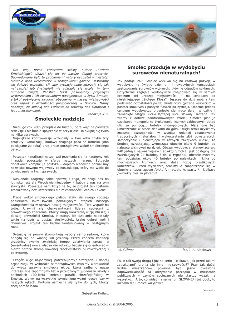 ! " " " # #$ " % " ! # " & # ' " ( # #+ ' , ! " % " # ) # ! , ! #% ( - ! # + ( # # % , # # . # & # * " , )8) + !# ( ( ! , & 9 : 7 ; !" . - % # . ' !<# =( ?( & >(. &!" + # & !@ & # # / # & & # # &! ! !# # !" ! # $ & ! ) ( & # # %# #&' & & ( )8) & && & & ( # / . , . . *( + # !) # ) # ( !) & A# # & + E # .& # # C ! - (. & (. && # *!<# . B C # D B # *! + , & ( !- & C # F C F C ! . # C F C # ! ( & * . ( ! 1 !0 + . ( !) ( ! & & #. # # # ! + # & & # & % # &! ) ' & * ( # # # != ( ! 2 (. # # & !/ ! # + # & & . 3+ # ( . # # 4 5 !/ & ( ) !8 9 # & ;# & & *( . , 33 ) . # & * . . ( !6 ! +# !" !8!7 # , ! ! !8 + 7 Kurier Smolecki © 2004/2005 ( !=GH/ I" ( . # ! Yemiołka 1 ) % & ( . # ' !< & !) . && ! % # ! &, /" 0 , 1 2 #& ". *( !) ( ! # ( 5) & > + O5 # & !0 ( # . / 2& & + 5 ( ' !/ . 9 J# ; . # . P ! @ ( ! # . . . ( # + 8 @ !: ( " ) . P * ! + & # & ! " > , : # & !" !8!7 # . ( &!J & !0 # & # # ( *( . ( ( !- . / < L # . (# . & # :# # /& * !0 / # # ( 1 9 ( !/ 8 :# . 7 ( ! . !" . &. 5 ! & * / N : = 8 7 " @ +# 7 & !/ K (# !! $< M * * 7 2 " 2 " @ 7 I G / G 2 M * @ + @ + G + * @ / 0 M * " / @ / @ 0 7 = 8 7 7 ) !/ & # 7 8 . ! # & & & . # ( . & & & / % # ' !7 . . & ( !) # ! 9 7 + ; ! & M G + + / + 7 > " ! .' & . 3 !8 # ; !: . , & . . ; !- ( & # !0 & . . + . . # & . % . ' ( % ( 9 ;, ? @ & # # , # # # ! $ . ( # = ( !" # 9 ( & ( ( & # $ 9 # # + # ! ! # & 8 < Q # ; !Q , % ( ' # / # # *( # * ( ) , ( ! # ( ( @ " :# & . 1 8 7 % & ( / - # # 7& $ . K ? / # 4! M @ = 7 ! + + @ K! ) # ) + ! 8 B! / ( 1 & < !M * ! > + + . . ( ' ! ( !J & # , !2 # !8 , !: . # # # & ! <# ! +# 7 Redakcja > > / 6 ,= G 5" ,+# 7 + R " 7 8 7 > ) Cena 0,50 zł – koszty papieru i wydruku Kurier Smolecki © 2004/2005 2