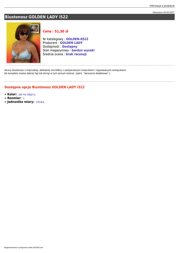 Informacje o produkcie Utworzono 03-03-2017 Biustonosz GOLDEN LADY i522 Cena : 51,30 zł Nr katalogowy : GOLDEN-0522 Producent : GOLDEN LADY Dostępność : Dostępny Stan magazynowy : bardzo wysoki Średnia ocena : brak recenzji śliczny biustonosz z mięciutkiej, delikatnej microfibry z usztywnianymi miseczkami i regulowanymi ramiączkami. Do kompletu można dobrać figi lub stringi w tym samym kolorze (patrz "akcesoria dodatkowe" ). Dostępne opcje Biustonosz GOLDEN LADY i522 » Kolor: jak na zdjęciu. » Rozmiar: L. » Jednostka miary: sztuka. Wygenerowano w programie www.oscGold.com