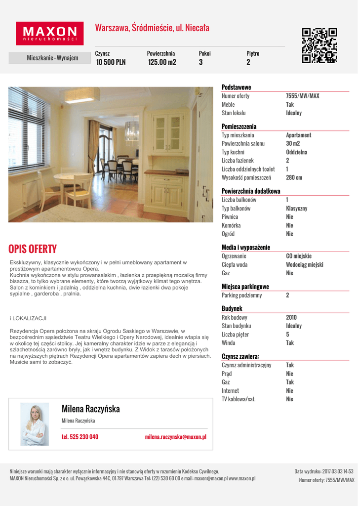 Warszawa, Śródmieście, ul. Niecała Mieszkanie - Wynajem Czynsz 10 500 PLN Powierzchnia 125.00 m2 Pokoi Piętro 3 2 Podstawowe Numer oferty 7555/MW/MAX Meble Tak Stan lokalu Idealny Pomieszczenia Typ mieszkania Apartament Powierzchnia salonu 30 m2 Typ kuchni Oddzielna Liczba łazienek 2 Liczba oddzielnych toalet 1 Wysokość pomieszczeń 280 cm Powierzchnia dodatkowa Liczba balkonów 1 Typ balkonów Klasyczny Piwnica Nie Komórka Nie Ogród Nie OPIS OFERTY Media i wyposażenie Ekskluzywny, klasycznie wykończony i w pełni umeblowany apartament w prestiżowym apartamentowcu Opera. Kuchnia wykończona w stylu prowansalskim , łazienka z przepiękną mozaiką firmy bisazza, to tylko wybrane elementy, które tworzą wyjątkowy klimat tego wnętrza. Salon z kominkiem i jadalnią , oddzielna kuchnia, dwie łazienki dwa pokoje sypialne , garderoba , pralnia. i LOKALIZACJI Rezydencja Opera położona na skraju Ogrodu Saskiego w Warszawie, w bezpośrednim sąsiedztwie Teatru Wielkiego i Opery Narodowej, idealnie wtapia się w okolicę tej części stolicy. Jej kameralny charakter idzie w parze z elegancją i szlachetnością zarówno bryły, jak i wnętrz budynku. Z Widok z tarasów położonych na najwyższych piętrach Rezydencji Opera apartamentów zapiera dech w piersiach. Musicie sami to zobaczyć. Ogrzewanie CO miejskie Ciepła woda Wodociąg miejski Gaz Nie Milena Raczyńska Miejsca parkingowe Parking podziemny 2 Budynek Rok budowy 2010 Stan budynku Idealny Liczba pięter 5 Winda Tak Czynsz zawiera: Czynsz administracyjny Tak Prąd Nie Gaz Tak Internet Nie TV kablowa/sat. Nie Milena Raczyńska tel. 525 230 040 [email protected] Niniejsze warunki mają charakter wyłącznie informacyjny i nie stanowią oferty w rozumieniu Kodeksu Cywilnego. MAXON Nieruchomości Sp. z o o. ul. Powązkowska 44C, 01-797 Warszawa Tel: (22) 530 60 00 e-mail: [email protected] www.maxon.pl Data wydruku: 2017-03-03 14:53 Numer oferty: 7555/MW/MAX