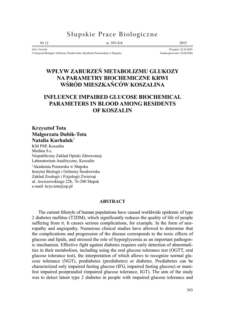 S ł u p s k i e Pr a c e B i o l o g i c z n e Nr 12 ss. 393-416 ISSN 1734-0926 © Instytut Biologii i Ochrony Środowiska Akademii Pomorskiej w Słupsku 2015 Przyjęto: 12.10.2015 Zaakceptowano: 25.02.2016 WPŁYW ZABURZEŃ METABOLIZMU GLUKOZY NA PARAMETRY BIOCHEMICZNE KRWI WŚRÓD MIESZKAŃCÓW KOSZALINA INFLUENCE IMPAIRED GLUCOSE BIOCHEMICAL PARAMETERS IN BLOOD AMONG RESIDENTS OF KOSZALIN Krzysztof Tota Małgorzata Dubik-Tota Natalia Kurhaluk1 KM PSP, Koszalin Medina S.c. Niepubliczny Zakład Opieki Zdrowotnej Laboratorium Analityczne, Koszalin 1 Akademia Pomorska w Słupsku Instytut Biologii i Ochrony Środowiska Zakład Zoologii i Fizjologii Zwierząt ul. Arciszewskiego 22b, 76-200 Słupsk e-mail: [email protected] ABSTRACT The current lifestyle of human populations have caused worldwide epidemic of type 2 diabetes mellitus (T2DM), which significantly reduces the quality of life of people suffering from it. It causes serious complications, for example. In the form of neuropathy and angiopathy. Numerous clinical studies have allowed to determine that the complications and progression of the disease corresponds to the toxic effects of glucose and lipids, and stressed the role of hyperglycemia as an important pathogenic mechanism. Effective fight against diabetes requires early detection of abnormalities in their metabolism, including using the oral glucose tolerance test (OGTT, oral glucose tolerance test), the interpretation of which allows to recognize normal glucose tolerance (NGT), prediabetes (prediabetes) or diabetes. Prediabetes can be characterized only impaired fasting glucose (IFG, impaired fasting glucose) or manifest impaired postprandial (impaired glucose tolerance, IGT). The aim of the study was to detect latent type 2 diabetes in people with impaired glucose tolerance and 393 the influence of impaired fasting glucose (IGF) and impaired glucose tolerance (NGT) on selected biochemical parameters of blood in a group of residents of Koszalin. In the group of patients we were in previous studies abnormal levels of fasting glucose, which was an indication for the test OGTT. There was an increase in the incidence of type 2 diabetes with age. It has been found that in the case of impaired glucose metabolism significantly increased levels of total cholesterol (CH) and triglyceride (TG) in the serum. Słowa kluczowe: cukrzyca, stan przedcukrzycowy, profilaktyka Key words: diabetes, prediabetes, prevention WPROWADZENIE U podłoża zaburzeń tolerancji glukozy leży dysfunkcja komórek bądź też oporność na działanie endogennej insuliny (Alberti i Zimmet 1998). Uszkodzenie funkcji komórek i oporność na działanie tego hormonu ma różne podłoże i bardzo złożony charakter (American Diabetes Association, 2005, 2011). Upośledzenie metabolizmu glukozy oraz wzrost wątrobowej glukoneogenezy prowadzą w konsekwencji do hiperglikemii (Piwońska-Solska 2009). Poza wątrobą i mięśniami w zaburzeniach homeostazy glukozy istotną rolę odgrywają inne narządy i tkanki, w tym adipocyty, w których dochodzi do przyspieszenia lipolizy, przewód pokarmowy z zaburzeniami funkcji inkretyn, a także komórki β trzustki, nerki i ośrodkowy układ nerwowy (Piwońska-Solska 2009; Di Landro i in. 1998). Według zaleceń Polskiego Towarzystwa Diabetologicznego (PTD z 2015 r.) w grupach ryzyka konieczne jest prowadzenie badań przesiewowych w kierunku cukrzycy, ponieważ u ponad połowy chorych nie występują objawy hiperglikemii. Badanie należy przeprowadzić raz w ciągu 3 lat u każdej osoby powyżej 45. roku życia. Raz w roku należy wykonać badanie, niezależnie od wieku, u osób z nadwagą lub otyłością, cukrzycą występującą w rodzinie, nadciśnieniem tętniczym, dyslipidemią lub jeśli w poprzednim badaniu stwierdzono stan przedcukrzycowy oraz u kobiet z przebytą cukrzycą ciążową (Buchanan 2007). Cukrzyca jest chorobą przewlekłą, a zbyt późno rozpoznana i nieleczona lub leczona nieskutecznie powoduje rozwój późnych powikłań, będących przyczyną przedwczesnego inwalidztwa i zwiększonej umieralności (Charles i in. 1991, Lyons i in. 2004, Holman i in. 2008). Patogeneza przewlekłych powikłań cukrzycy jest wieloczynnikowa i złożona (Dembińska-Kieć, Naskalski 2002). Są one głównie następstwem zaburzeń metabolicznych typowych dla cukrzycy (American Diabetes Association 2005, 2011). Do powikłań mikronaczyniowych należą neuropatia, retinopatia oraz nefropatia cukrzycowa. U chorych z cukrzycą typu 1. wymienione powikłania rozwijają się po pewnym czasie od chwili rozpoznania cukrzycy, natomiast u chorych z cukrzycą typu 2. już w czasie rozpoznania choroby, u dużego odsetka populacji (niemal 50%) obserwuje się przewlekłe powikłania (Hopper i in. 2011). Spektrum parametrów przyczyniających się do rozwoju cukrzycy (szczególnie typu 2.) jest szerokie i zalicza się do nich wiele substancji endogennych, przede wszystkim hormony stresowe: zarówno katecholaminy (noradrenalina i adrenalina), 394 jak i steroidy nadnerczowe (kortyzol). Natomiast badania biochemiczne najczęściej wykorzystywane w diagnostyce i leczeniu cukrzycy to przede wszystkim oznaczenie stężenia glukozy we krwi (czyli glikemii) na czczo, doustny test tolerancji glukozy (OTTG), odsetek hemoglobiny glikowanej, inaczej HbA1c, stężenie glukozy i acetonu w moczu. W przypadku wątpliwości dotyczących rozpoznania typu cukrzycy można wykonać inne badania, np. stężenie peptydu C we krwi, czy oznaczenie poziomu przeciwciał przeciwtrzustkowych. Obecnie znanych jest 5 przeciwciał, które powodują cukrzycę typu 1.: przeciwwyspowe (ICA), przeciw dekarboksylazie kwasu glutaminowego (anty-GAD), przeciw insulinie, przeciw fosfatazom tyrozynowym i przeciwcynkowe (Zn8) (Yousefzadeh i in. 2015). Badanie albuminy w moczu może być wykorzystywane w diagnostyce nefropatii cukrzycowej (zmian w nerkach pojawiających się w przebiegu cukrzycy), natomiast mikroalbuminuria to bada