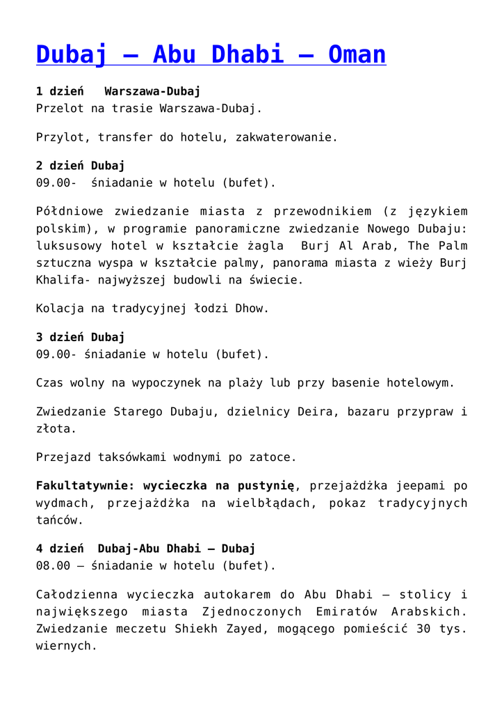 Dubaj – Abu Dhabi – Oman 1 dzień Warszawa-Dubaj Przelot na trasie Warszawa-Dubaj. Przylot, transfer do hotelu, zakwaterowanie. 2 dzień Dubaj 09.00- śniadanie w hotelu (bufet). Półdniowe zwiedzanie miasta z przewodnikiem (z językiem polskim), w programie panoramiczne zwiedzanie Nowego Dubaju: luksusowy hotel w kształcie żagla Burj Al Arab, The Palm sztuczna wyspa w kształcie palmy, panorama miasta z wieży Burj Khalifa- najwyższej budowli na świecie. Kolacja na tradycyjnej łodzi Dhow. 3 dzień Dubaj 09.00- śniadanie w hotelu (bufet). Czas wolny na wypoczynek na plaży lub przy basenie hotelowym. Zwiedzanie Starego Dubaju, dzielnicy Deira, bazaru przypraw i złota. Przejazd taksówkami wodnymi po zatoce. Fakultatywnie: wycieczka na pustynię, przejażdżka jeepami po wydmach, przejażdżka na wielbłądach, pokaz tradycyjnych tańców. 4 dzień Dubaj-Abu Dhabi – Dubaj 08.00 – śniadanie w hotelu (bufet). Całodzienna wycieczka autokarem do Abu Dhabi – stolicy i największego miasta Zjednoczonych Emiratów Arabskich. Zwiedzanie meczetu Shiekh Zayed, mogącego pomieścić 30 tys. wiernych. Heritage Village z muzeum obrazującym życie lokalnych plemion przed odkryciem ropy naftowej. Powrój do Dubaju na kolację i nocleg. 5 dzień Dubaj – Muscat – Nizwa Wczesne śniadanie w hotelu, transfer na lotnisko. 08.00 – odlot do Muscatu. 09.00 – przylot, przejazd autokarem do Nizwy (175 km) Przyjazd, zakwaterowanie w hotelu. Zwiedzanie Nizwy, dawnej oazy, położonej w rozległej kotlinie górskiej, która obecnie jest jednym z najciekawszych i najbardziej malowniczych miast Omanu. Zwiedzanie fortu zXVII wieku, z największą w krajach arabskich okrągłą wieżą, beduińskiego souku – znanego ze wspaniałych wyrobów ze srebra, biżuterii beduińskiej oraz białej broni. Następnie zwiedzanie Pałacu Jabrin ze słynnymi freskami oraz miasteczka Bahla, znanego z wyrobów ceramicznych i okazałego fortu. Kolacja i nocleg w Nizwa. 6 dzień Nizwa-Sur 09.00 – śniadanie w hotelu. Przejazd do Sur, miasteczka portowego położonego nad Zatoką Omańską, znanego z produkcji tradycyjnych łodzi. Według legendy, Sur jest rodzinnym miastem Sindbada Żeglarza. Spacer po malowniczych, wąskich uliczkach miasta. W okolicach Sur znajdują się liczne wąwozy (wadis) z bujną, zieloną roślinnością. Kolacja i nocleg w Sur w hotelu 3* . 7 dzień Sur-Muscat 09.00 – śniadanie w hotelu. Przejazd autokarem do Muscatu – stolicy Sułtanatu Omanu. Malowniczo położone wzdłuż wybrzeża Morza Arabskiego miasto kultywuje dawne tradycje. Piaszczyste plaże przedzielone są skałami, tworząc naturalne porty. Zakwaterowanie w hotelu 4* w pobliżu plaży. 8 dzień Muscat 09.00- śniadanie w hotelu, czas wolny na plażowanie przy basenie lub na plaży. Po południu zwiedzanie Muscatu, między innymi: Wielki Meczet Sułtana Qaboos – jeden z najpiękniejszych obiektów architektury Islamu (zwiedzających obowiązuje nakrycie głowy, długie spodnie, zakryte ramiona), najstarszy targ w Omanie, gdzie można poczuć autentyzm tego miasta. Kolacja pożegnalna w tradycyjnej restauracji restauracji Kargeen www.kargeencaffe.com Powrót do hotelu. 9 dzień Muscat-Dubaj-Warszawa Przelot na trasie Muskat-Dubaj-Warszawa. Cena za program zostanie podana po uzgodnieniu terminu. Cena obejmuje następujące świadczenia: przelot samolotem rejsowym na trasie Warszawa-DubajMuskat-Dubaj-Warszawa zakwaterowanie w hotelach 4* w Dubaju i Muskacie, 3* w Nizwa i Sur śniadania i kolacje zwiedzania zgodnie z programem z przewodnikiem lokalnym, wstępy koszt wizy do Omanu ubezpieczenie KL + NW opieka pilota Holiday Travel na całej trasie Veranda Le Palmar Beach 3* Położony bezpośrednio przy pięknej, piaszczystej plaży Belle Mare na północno-zachodnim wybrzeżu wyspy. Turkusowe wody Oceanu świetnie nadają się do kąpieli oraz uprawiania wszelkich sportów wodnych. Do dyspozycji gości basen, 2 restauracje, 2 bary, serwis plażowy 77 pokoi z widokiem na ocean, klimatyzacją, balkonem lub tarasem, łazienką, suszarką do włosów, sejfem, czajnikiem do kawy/herbaty, mini barem, TV SAT W pokoju 2 osobowym „Comfort” istnieje możliwość zakwaterowania 2 osób dorosłych + 2 dzieci do lat 12-tu lub 3 osób dorosłych 2 restauracje (możliwość zamówienia dań wegetariańskich) : Regatta – menu à la carte lub bufet śniadania: 07.30 – 10.00 19.00 – 22.00 obiady 12.00 – 15.00 kolacje L’Horizon – dania z grilla, owoce morza Obiady: 12.30 – 15.00 Kolacje: 19.00 rezerwacja) – 22.00 (5 razy w 2 bary: L’Horizon : 11.00 – 17.00 (przy plaży) Barracuda: 11.00 – 23.00 (przy basenie) Sporty gratis: tygodniu, wymagana gimnastyka wodna, deski do windsurfingu, przejażdżki łodzią ze szklanym dnem z możliwością nurkowania z maską przy rafie koralowej, rowery wodne, kajaki, żaglówki, tenis stołowy, sala fitness Sporty płatne: narty wodne, katamarany, nurkowanie z butlami, rowery, bilard Cena przelotu skalkulowana została na podstawie przelotu rejsowego liniami EMIRATES (PLN 4000 od osoby), cena zależy od dostępności miejsc w danym terminie i w przyjętej taryfie cenowej. Ewentualna zmiana ceny i terminu przelotu zostanie zaproponowana klientowi do akceptacji. Istnieje możliwość zamówienia dowolnej liczby noclegów. Veranda Le Palmar Beach 3* 5 nocy/All Inclusive Przelot WAW-MRU-WAW Transfer lotnisko/hotel/lotnisko Ceny w PLN Miejsce w pokoju 2-os „Comfort” 01.10 – 31.10.14 noc 01.05 – 30.09.14 noc 6990 520 6480 420 1-sze dziecko do lat 12-tu na dostawce 2-gie dziecko do lat 12-tu bezpłatnie 1100 bezpłatnie 1100 na dostawce Oferty specjalne (noce gratis All Inclusive) podróż poślubna co 5-ta rocznica ślubu Barano Rosalia 6 płatnych + 1 gratis 8 płatnych + 2 gratis 11 płatnych + 3 gratis – 25% – 25% d’Ischia, 5 płatnych + 2 gratis 150 10 płatnych + 4 gratis – 25% – 25% Villa Willa położona jest na wzgórzu, z zapierającym dech w piersiach