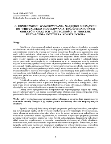 Jacek ABRAMCZYK Zakład Geometrii i Grafiki Inżynierskiej Politechnika Rzeszowska im. I. Łukasiewicza O KONIECZNOŚCI WYKORZYSTANIA NARZĘDZI SŁUŻĄCYCH DO WIRTUALNEGO MODELOWANIA TRÓJWYMIAROWYCH OBIEKTÓW ORAZ ICH UŻYTECZNOŚCI W PROCESIE KSZTAŁCENIA INŻYNIERA KONSTRUKTORA Wstęp Stabilizacja obserwowanych dzisiaj trendów w nauce, dydaktyce i technice wymagają od absolwenta uczelni technicznej coraz rozleglejszej wiedzy oraz umiejętności wybierania odpowiedniego obszaru dla własnej aktywności zawodowej. Ponadto dość ograniczony czas nauki należy umiejętnie i efektywnie wykorzystać wskazując studentom możliwość rozwoju odpowiednich umiejętności także poza podstawowymi zajęciami. Skoro obszar każdej dziedziny wiedzy znacznie się poszerzył a liczba godzin nauki na uczelni w ostatnich latach wprost przeciwnie, zmniejszyła się, to podejmowane są m. in. następujące sposoby szukania wyjścia z zaistniałej sytuacji: zwiększenie szybkości podawania informacji na wykładzie i na ćwiczeniach (slajdy, animacje, przykłady wykonywane bez czynnego udziału studentów itp.); wzrost atrakcyjności formy podawanych informacji, ażeby równocześnie zwiększyły się możliwości studenta w zakresie przyswajania (również samodzielnego) danej partii materiału [2]; wprowadzenie zajęć fakultatywnych głównie po to, żeby studiujący mógł nauczyć się wykorzystywać posiadaną wiedzę teoretyczną do tworzenia modeli oraz dokumentacji obiektów inżynierskich. Dzięki odpowiednio dobranym programom zajęć przyszły absolwent mógłby wybierać, przyswajać oraz doskonalić w pracowni komputerowej zwłaszcza te umiejętności, z którymi wiąże swoją karierę zawodową. Na dodatek swoją wiedzę i twórcze, nowatorskie pomysły mógłby natychmiast sfinalizować w postaci wirtualnych modeli. Ażeby dobór oprogramowania komputerowego wspomagającego zajęcia był trafny, nauczyciel musi wpierw sam poznać jego możliwości. Dlatego autor postanowił podjąć próbę przedstawienia możliwości stosowanego powszechnie oprogramowania. Wady i zalety wirtualnego oprogramowania graficznego z uwagi na jego przydatność w nauczaniu metody Monge'a i jej wykorzystania do budowy obrazów rozpatrywanych obiektów Spośród istniejącej dużej oferty różnych programów graficznych możliwe jest wybranie niewielkiej ich liczby, tak by w bardzo efektywny sposób wspomogły proces nauczania. Autor obserwuje następujące zjawisko. Mimo tego, że metody odwzorowań wykreślnych na wszystkich wydziałach uczelni są jednakowe, to stosowane w dydaktyce programy graficzne powinny być przynajmniej częściowo różne. Powód jest następujący. Programy te wchodzą w skład systemów projektowania, wykonania i zarządzania użytkowanymi później obiektami. Ponieważ autor jest nauczycielem na Wydziale Budownictwa i Inżynierii Środowiska, to podjął próbę omówienia możliwości programów znajdujących wykorzystanie przede wszystkim w budownictwie, a są to AutoCAD, AMD i 3D Studio (mimo chęci nie miał autor dostatecz- -8- nych wiadomości pozwalających uwzględnić również możliwości programu Microstation). W celu przedstawienia zróżnicowanych możliwości tych programów pod względem przydatności w nauce metody Monge'a, postanowił autor wyróżnić trzy etapy w nauczaniu tej metody. Są to: 1) etap sporządzania obrazów obiektów w postaci związanych rzutów, 2) etap restytucji obiektów na podstawie związanych rzutów, 3) etap wykorzystania metody Monge'a do ustalania budowy konkretnych obiektów inżynierskich np. w oparciu o dane narzucające niektóre właściwości geometryczne projektowanym obiektom. Umiejętny dobór przykładów ćwiczeniowych wykorzystywanych na każdym z w/ w etapów, powinien zdaniem autora pozwolić studentowi na samodzielną pracę i weryfikację poprawności uzyskanych wyników. Wówczas wspomaganie komputerowe będzie miało sens i oprócz wspomagania programowych zajęć będzie również dodatkowym ich uzupełnieniem obok pozycji literaturowych np. skryptów. Współczesne wersje programów graficznych w zasadzie nie ograniczają pola działalności i pomysłowości nauczyciela pragnącego je wykorzystać podczas zajęć omawiających pierwszy etap. Większość programów generuje automatycznie rzuty związane brył (tzw. prymitywów ewentualnie brył powstałych w wyniku operacji Boole'a na kilku prymitywach) z uwzględnieniem widoczności w postaci zróżnicowania struktury linii rzutów. Tylko nieliczne programy samoczynnie generują rzuty nie tylko brył, ale także wielościanów i wycinków powierzchni. Niektóre natomiast nie uwzględniają w rzutach widoczności w tzw. obiektach szkieletowych, zaś w tzw. obiektach powlekanych fasetami rzuty elementów niewidocznych nie są G uwzględniane. Przyjrzyjmy się figurze przedstawionej na rys.1. Praktycznie każ1 2 dy liczący się program do modelowania G G "3D" potrafi wygenerować trzy wzajemnie związane rzuty tej figury. W tym momencie nauczyciel nie powinien koń3 czyć, ale dopiero rozpocząć wykorzystyG wanie komputera i jego możliwości. Zaprezentujmy przykładowo działania, jakie może on (ewentualnie sami studenci mogliby wykonać poniższe czynności) wykonać w stosunku do figury i jej rzutów, ażeby lepiej przybliżyć dane zagadnienie, Rys.1. którego nie zrozumieli. Możliwe jest: a) utworzenie przestrzennej siatki punktów leżących w stałych odległościach, do których przyciągany jest kursor, a następnie umieszczanie w węzłach tej siatki wierzchołków tworzonej figury G, b) przemieszczanie figury G względem rzutni, c) wzajemne przemieszczanie względem siebie elementów składowych figury G, d) modyfikowanie właściwości miarowych figury G i jej elementów składowych, e) zmiana kolejno wyróżnianych kierunków obserwacji, -9- a następnie sprawdzanie poprawności przewidywania wyników (rezultatów dokonanych zmian) poprzez ich po