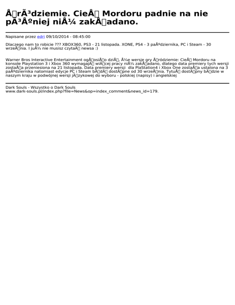 Åródziemie. CieÅ Mordoru padnie na nie później niż zakÅadano. Napisane przez edri 09/10/2014 - 08:45:00 Dlaczego nam to robicie ??? XBOX360, PS3 - 21 listopada. XONE, PS4 - 3 października, PC i Steam - 30 wrzeÅnia. I już nie musisz czytaÄ newsa :) Warner Bros Interactive Entertainment ogÅosiÅo dziÅ, że wersje gry Åródziemie: CieÅ Mordoru na konsole Playstation 3 i Xbox 360 wymagajÄ wiÄcej pracy niż zakÅadano, dlatego data premiery tych wersji zostaÅa przeniesiona na 21 listopada. Data premiery wersji dla PlaStation4 i Xbox One zostaÅa ustalona na 3 października natomiast edycje PC i Steam bÄdÄ dostÄpne od 30 wrzeÅnia. TytuÅ dostÄpny bÄdzie w naszym kraju w podwójnej wersji jÄzykowej do wyboru - polskiej (napisy) i angielskiej Dark Souls - Wszystko o Dark Souls www.dark-souls.pl/index.php?file=News&op=index_comment&news_id=179.
