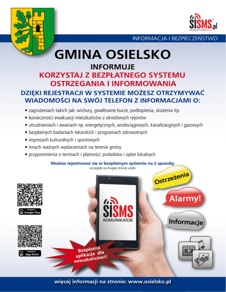 INFORMACJA I BEZPIECZEŃSTWO GMINA OSIELSKO INFORMUJE KORZYSTAJ Z BEZPŁATNEGO SYSTEMU OSTRZEGANIA I INFORMOWANIA DZIĘKI REJESTRACJI W SYSTEMIE MOŻESZ OTRZYMYWAĆ WIADOMOŚCI NA SWÓJ TELEFON Z INFORMACJAMI O: • zagrożeniach takich jak: wichury, gwałtowne burze, podtopienia, skażenia itp. • konieczności ewakuacji mieszkańców z określonych rejonów • utrudnieniach i awariach np. energetycznych, wodociągowych, kanalizacyjnych i gazowych • bezpłatnych badaniach lekarskich i programach zdrowotnych • imprezach kulturalnych i sportowych • innych ważnych wydarzeniach na terenie gminy • przypomnienia o termiach i płatności: podatków i opłat lokalnych Możesz rejestrować się w bezpłatnym systemie na 2 sposoby szczegóły na drugiej stronie ulotki POBIERZ Z Google Play POBIERZ Z App Store tna Bezpła dla ja c a k apli !! ańców mieszk więcej informacji na stronie: www.osielsko.pl 1 Jeśli posiadasz smartfona: Pobierz aplikację Komunikator SISMS Komunikator SISMS przeznaczony jest dla posiadaczy telefonów typu smartfon. Dzięki aplikacji będziesz otrzymywać rozszerzone powiadomienia z Urzędu Gminy. Do wiadomości mogą być dołączone zdjęcia, filmy, pliki audio. 1. Pobierz za darmo aplikację za pomocą QR kodu lub poprzez stronę: www.komunikator.sisms.pl. 2. Zarejestruj swój profil w Komunikatorze SISMS. 3. Wyszukaj w dostępnej liście Komunikatora interesujący Cię serwis informacyjny i zapisz się w nim. 4. Od tej pory będziesz otrzymywać najważniejsze i ciekawe informacje z Urzędu Gminy w postaci wiadomości SMS Cloud. 5. Jeśli chcesz zrezygnować z usługi i wyrejestrować się z systemu, przekaż taką informację poprzez formularz na stronie: www. komunikator.sisms.pl/wyrejestruj. Usługa jest świadczona przez SISMS Sp. z o. o. na rzecz Użytkownika na podstawie Umowy zawartej z Gminą Osielsko. Usługa jest świadczona zgodnie z Regulaminem dostępnym na stronie: www.komunikator.sisms.pl/regulamin-uzytkownicy 2 Jeśli posiadasz klasyczny telefon komórkowy: Wyślij SMS* z wybranym kodem rejestracyjnym na numer 661 000 112 Serwis informacyjny kod rejestrujący kod wyrejestrowujący Mieszkańcy - informacje ogólne tak.cby06 nie.cby06 Oświata tak.cby068 nie.cby068 Podatki opłaty lokalne tak.cby069 nie.cby069 Sołectwo Bożenkowo tak.cby061 nie.cby061 Sołectwo Jarużyn tak.cby062 nie.cby062 Sołectwo Maksymilianowo tak.cby063 nie.cby063 Sołectwo Niemcz tak.cby064 nie.cby064 Sołectwo Niwy-Wilcze tak.cby065 nie.cby065 Sołectwo Osielsko tak.cby066 nie.cby066 Sołectwo Żołędowo tak.cby067 nie.cby067 1. Wyślij SMS* o treści wybranego kodu rejestrującego na numer 661 000 112 2. Jeśli dokonasz poprawnej rejestracji otrzymasz SMS z potwierdzeniem rejestracji w serwisie. 3. Od tej pory będziesz otrzymywał ważne informacje z Urzędu Gminy w postaci wiadomości SMS. 4. Jeśli chcesz się wyrejestrować wyślij SMS* z kodem wyrejestrowującym na numer 661 000 112 *Opłata za wysłanie wiadomości SMS jest zgodna z Twoim planem taryfowym. Wysłanie wiadomości SMS o zdefiniowanej treści oznacza akceptację regulaminu dostępnego na stronie www.sisms.pl. W treści SMS-a powinien być wpisany tylko kod rejestrujący serwisu. Zawarty w kodzie znak “0” jest cyfrą “zero”.