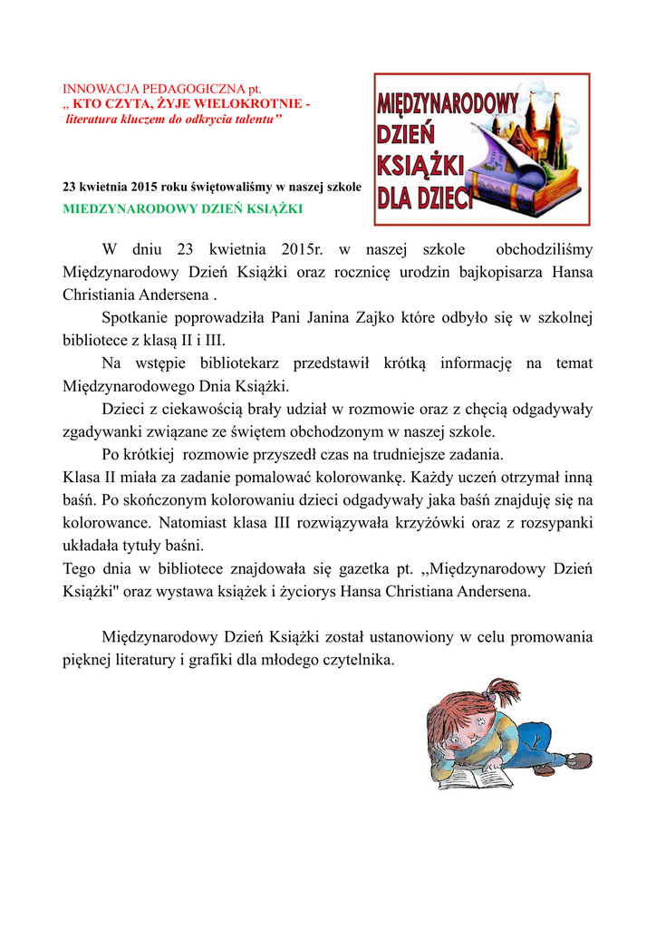 INNOWACJA PEDAGOGICZNA pt. ,, KTO CZYTA, ŻYJE WIELOKROTNIE literatura kluczem do odkrycia talentu’’ 23 kwietnia 2015 roku świętowaliśmy w naszej szkole MIEDZYNARODOWY DZIEŃ KSIĄŻKI W dniu 23 kwietnia 2015r. w naszej szkole obchodziliśmy Międzynarodowy Dzień Książki oraz rocznicę urodzin bajkopisarza Hansa Christiania Andersena . Spotkanie poprowadziła Pani Janina Zajko które odbyło się w szkolnej bibliotece z klasą II i III. Na wstępie bibliotekarz przedstawił krótką informację na temat Międzynarodowego Dnia Książki. Dzieci z ciekawością brały udział w rozmowie oraz z chęcią odgadywały zgadywanki związane ze świętem obchodzonym w naszej szkole. Po krótkiej rozmowie przyszedł czas na trudniejsze zadania. Klasa II miała za zadanie pomalować kolorowankę. Każdy uczeń otrzymał inną baśń. Po skończonym kolorowaniu dzieci odgadywały jaka baśń znajduję się na kolorowance. Natomiast klasa III rozwiązywała krzyżówki oraz z rozsypanki układała tytuły baśni. Tego dnia w bibliotece znajdowała się gazetka pt. ,,Międzynarodowy Dzień Książki'' oraz wystawa książek i życiorys Hansa Christiana Andersena. Międzynarodowy Dzień Książki został ustanowiony w celu promowania pięknej literatury i grafiki dla młodego czytelnika.