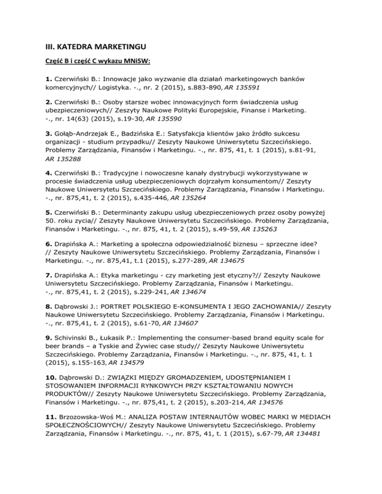 III. KATEDRA MARKETINGU Część B i część C wykazu MNiSW: 1. Czerwiński B.: Innowacje jako wyzwanie dla działań marketingowych banków komercyjnych// Logistyka. -., nr. 2 (2015), s.883-890, AR 135591 2. Czerwiński B.: Osoby starsze wobec innowacyjnych form świadczenia usług ubezpieczeniowych// Zeszyty Naukowe Polityki Europejskie, Finanse i Marketing. -., nr. 14(63) (2015), s.19-30, AR 135590 3. Gołąb-Andrzejak E., Badzińska E.: Satysfakcja klientów jako źródło sukcesu organizacji - studium przypadku// Zeszyty Naukowe Uniwersytetu Szczecińskiego. Problemy Zarządzania, Finansów i Marketingu. -., nr. 875, 41, t. 1 (2015), s.81-91, AR 135288 4. Czerwiński B.: Tradycyjne i nowoczesne kanały dystrybucji wykorzystywane w procesie świadczenia usług ubezpieczeniowych dojrzałym konsumentom// Zeszyty Naukowe Uniwersytetu Szczecińskiego. Problemy Zarządzania, Finansów i Marketingu. -., nr. 875,41, t. 2 (2015), s.435-446, AR 135264 5. Czerwiński B.: Determinanty zakupu usług ubezpieczeniowych przez osoby powyżej 50. roku zycia// Zeszyty Naukowe Uniwersytetu Szczecińskiego. Problemy Zarządzania, Finansów i Marketingu. -., nr. 875, 41, t. 2 (2015), s.49-59, AR 135263 6. Drapińska A.: Marketing a społeczna odpowiedzialność biznesu – sprzeczne idee? // Zeszyty Naukowe Uniwersytetu Szczecińskiego. Problemy Zarządzania, Finansów i Marketingu. -., nr. 875,41, t.1 (2015), s.277-289, AR 134675 7. Drapińska A.: Etyka marketingu - czy marketing jest etyczny?// Zeszyty Naukowe Uniwersytetu Szczecińskiego. Problemy Zarządzania, Finansów i Marketingu. -., nr. 875,41, t. 2 (2015), s.229-241, AR 134674 8. Dąbrowski J.: PORTRET POLSKIEGO E-KONSUMENTA I JEGO ZACHOWANIA// Zeszyty Naukowe Uniwersytetu Szczecińskiego. Problemy Zarządzania, Finansów i Marketingu. -., nr. 875,41, t. 2 (2015), s.61-70, AR 134607 9. Schivinski B., Łukasik P.: Implementing the consumer-based brand equity scale for beer brands – a Tyskie and Żywiec case study// Zeszyty Naukowe Uniwersytetu Szczecińskiego. Problemy Zarządzania, Finansów i Marketingu. -., nr. 875, 41, t. 1 (2015), s.155-163, AR 134579 10. Dąbrowski D.: ZWIĄZKI MIĘDZY GROMADZENIEM, UDOSTĘPNIANIEM I STOSOWANIEM INFORMACJI RYNKOWYCH PRZY KSZTAŁTOWANIU NOWYCH PRODUKTÓW// Zeszyty Naukowe Uniwersytetu Szczecińskiego. Problemy Zarządzania, Finansów i Marketingu. -., nr. 875,41, t. 2 (2015), s.203-214, AR 134576 11. Brzozowska-Woś M.: ANALIZA POSTAW INTERNAUTÓW WOBEC MARKI W MEDIACH SPOŁECZNOŚCIOWYCH// Zeszyty Naukowe Uniwersytetu Szczecińskiego. Problemy Zarządzania, Finansów i Marketingu. -., nr. 875, 41, t. 1 (2015), s.67-79, AR 134481 12. Kucharska W., Drozd R.: e-logistyka dystrybucji a czynnik ludzki w procesie kształtowania wartości marki - ujęcie praktyczne// Zeszyty Naukowe Uniwersytetu Szczecińskiego. Problemy Zarządzania, Finansów i Marketingu. -., nr. 875, 41. t. 2 (2015), s.497-507, AR 134479 13. Kucharska W.: Transfer znaczeń a kreowanie wartości marki w gospodarce sieciowej w aspekcie S-DLogic// Zeszyty Naukowe Uniwersytetu Szczecińskiego. Problemy Zarządzania, Finansów i Marketingu. -., nr. 875,41, t. 2 (2015), s.96-106, AR 134478 14. Gołąb-Andrzejak E.: Lojalność eurokonsumentów pokolenia Y// Handel Wewnętrzny. -., nr. 1(354) (2015), s.110-119, AR 134034 15. Gołąb-Andrzejak E.: Innowacje w marketingu jako czynnik kształtujący konkurencyjność polskich przedsiębiorstw na rynku UE// Logistyka. -., nr. 2 (2015), s.1212-1220, AR 134033 16. Łukasik P., Schivinski B.: Effects of Store Brand Perceived Risk on Buyers’ Behavior – Four Decades of Research Overview = Wpływ postrzeganego ryzyka związanego z markami własnymi na zachowania nabywców – przegląd czterech dekad badań// Annales Universitatis Mariae Curie-Skłodowska, Sectio H Oeconomia. -Vol. 49., nr. 3 (2015), s.117-124, AR 133781 17. Dąbrowski D.: Rola marketingu w kształtowaniu innowacji produktowych// Logistyka. -., nr. 2 (2015), s.891-896, AR 132436 18. Brzozowska-Woś M.: Wybrane aspekty zachowań internautów a skuteczny proces komunikacji marketingowej// Logistyka. -., nr. 2 (2015), s.1146-1152, AR 132254 19. Kucharska W.: Image as a key factor of brand value at social media // Logistyka. -., nr. 2 (2015), s.1256-1265, AR 132246 20. Schivinski B., Łukasik P., Dąbrowski D.: User-generated images and its impact on consumer-based brand equity and on purchase intention// Logistyka. -., nr. 2 (2015), s.1054-1061, AR 132240 21. Schivinski B., Brzozowska-Woś M.: Badanie aktywności online polskich konsumentów dotyczącej marek// e-mentor. -., nr. 2 (59) (2015), s.77-85, AR 132177 22. Schivinski B., Łukasik P.: Typologia aktywności online konsumenta w zakresie marki// MARKETING I RYNEK. -., nr. 3 (2015), s.20-27, AR 132063 23. Łukasik P., Schivinski B.: Pomiar kapitału marek własnych detalistów// Annales Universitatis Mariae Curie-Skłodowska, Sectio H Oeconomia. -Vol. 49 (XLIX)., nr. 1 (2015), s.81-88, AR 132051 24. Schivinski B., Dąbrowski D.: The impact of brand communication on brand equity through Facebook// Journal of Research in Interactive Marketing. -Vol. 9., iss. 1 (2015), s.31-53, AR 131761 ROZDZIAŁY W MONOGRAFIACH NAUKOWYCH W JĘZYKU POLSKIM 1. Kucharska W.: Media społecznościowe: innowacja w kreowaniu polskich marek// W : Innowacje i przedsiębiorczość w procesie podnoszenia konkurencyjności przedsiębiorstw/ ed. Z. Dacko-Pikiewicz, V.Marakova, R.Niestrój Dąbrowa Górnicza: Wydawnictwo Naukowe WSB, 2015, s.117-126, MCK 134158 2. Gołąb-Andrzejak E.: Budowanie relacji a wartość dla klienta na przykładzie usług hotelarskich Grupy Hotelowej Orbis// W : Determinanty i efekty współczesnej aktywności marketingowej/ ed. Joanna Wiażewicz, Agnieszka Zielińska Rzeszów: Oficyna Wydawnicza Politechniki Rzeszowskiej, 2015, s.55-64, MCK 134035 3. Brzozowska-Woś M.: Cena i dystrybucja, jako instrumenty kreujące wizerunek nowego produktu// W : Planowanie i rozwój nowych produktów 