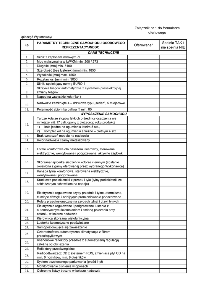 Załącznik nr 1 do formularza ofertowego /pieczęć Wykonawcy/ Lp. 1. 2. 3. 4. 5. 6. 7. 8. 9. 10. 11. 12. 13. 14. PARAMETRY TECHNICZNE SAMOCHODU OSOBOWEGO REPREZENTACYJNEGO DANE TECHNICZNE Silnik z zapłonem iskrowym ZI Moc maksymalna w kW/KM min. 200 / 273 Długość [mm] min. 5100 Szerokość (bez lusterek) [mm] min. 1850 Wysokość [mm] max. 1550 Rozstaw osi [mm] min. 3050 Silniki spełniający normę EURO 4 Skrzynia biegów automatyczna z systemem preselekcyjnej zmiany biegów Napęd na wszystkie koła (4x4) Nadwozie zamknięte 4 – drzwiowe typu „sedan”, 5 miejscowe Pojemność zbiornika paliwa [l] min. 80 WYPOSAŻENIE SAMOCHODU Tarcze koła ze stopów lekkich o średnicy osadzenia nie mniejszej niż 17 cali, opony z bieżącego roku produkcji 1) koła jezdne na ogumieniu letnim 5 szt., 2) komplet kół na ogumieniu śnieżno – błotnym 4 szt. Brak oznaczeń modelu na nadwoziu Kolor nadwozia czarny metalizowany 15. Fotele komfortowe dla pasażera i kierowcy, sterowane elektrycznie, wentylowane i podgrzewane, aktywne zagłówki 16. Skórzana tapicerka siedzeń w kolorze ciemnym (zostanie określona z gamy oferowanej przez wybranego Wykonawcę) 17. 18. 19. 20. 21. 22. 23. 24. 25. 26. 27. 28. 29. 30. 31. Kanapa tylna komfortowa, sterowana elektrycznie, wentylowana i podgrzewana Środkowe podłokietniki z przodu i tyłu (tylny podłokietnik ze schładzanym schowkiem na napoje) Elektrycznie regulowane szyby przednie i tylne, atermiczne, tłumiące dźwięki i odbijające promieniowanie podczerwone Rolety przeciwsłoneczne na szybach tylnej i drzwi tylnych Elektrycznie regulowane i podgrzewane lusterka z automatycznym ściemnianiem i zmianą położenia przy cofaniu, w kolorze nadwozia Kierownica skórzana wielofunkcyjna Lusterka kosmetyczne podświetlane Samopoziomujące się zawieszenie Czterostrefowa automatyczna klimatyzacja z filtrem przeciwpyłkowym Ksenonowe reflektory przednie z automatyczną regulacją zależną od obciążenia Reflektory przeciwmgielne Radioodtwarzacz CD z systemem RDS, zmieniacz płyt CD na min. 6 nośników, min. 8 głośników System bezpiecznego parkowania (przód i tył) Monitorowanie ciśnienia w oponach Ochronne listwy boczne w kolorze nadwozia Oferowane* Spełnia TAK / nie spełnia NIE 32. 33. 34. 35. 36. 37. 38. 39. 40. 41. 42. 43. 44. 45. 46. 47. 48. 49. 50. 51. 52. 53. 54. 55. 56. 57. Podpórki dla nóg po obu stronach pojazdu (dla pasażerów podróżujących z tyłu) Centralny zamek z pilotem, z elektroniczną blokadą zapłonu Zabezpieczenie antykradzieżowe (Immobiliser) Dodatkowe gniazdo elektryczne 12 V w przestrzeni bagażowej Alarm antywłamaniowy z niezależnym zasilaniem, funkcją kontroli wnętrza i zabezpieczeniem przed odholowaniem, wyłącznik / tryb serwisowy System multimedialny z tyłu pojazdu Komputer pokładowy Telefon komórkowy GSM na małą kartę SIM, słuchawka bezprzewodowa umieszczona w podłokietniku w części przedniej Gniazda pod sztyce dla proporców na błotnikach przednich Sztyce do proporców kompletne, 2 szt. Trójkąt ostrzegawczy, apteczka, gaśnica oraz fabryczny zestaw narzędzi Dywaniki gumowe przednie i tylne BEZPIECZEŃSTWO Wspomaganie układu kierowniczego zależne od prędkości jazdy, bezpieczna kolumna kierownicy Bezwładnościowe trójpunktowe pasy bezpieczeństwa z przodu z regulacją wysokości Trzy bezwładnościowe pasy bezpieczeństwa z tyłu Pirotechniczne napinacze pasów bezpieczeństwa z przodu i z tyłu Poduszki powietrzne kierowcy i pasażera z przodu Boczne poduszki powietrzne z przodu i z tyłu Kurtyny powietrzne Hamulce tarczowe z przodu i z tyłu, wentylowane Elektroniczny system kontroli trakcji wraz z ABS oraz asystentem siły hamowania, układ wspomagania nagłego hamowania Pięć zagłówków (dwa aktywne z przodu) Automatyczna i ręczna blokada wszystkich drzwi Tempomat Kolumna kierownicy z elektryczną regulacją w dwóch płaszczyznach z pamięcią ustawienia Instalacja elektryczna przystosowana do podłączenia dodatkowych odbiorników prądu tj.: 1) radiotelefon samochodowy (instalacja ekranowana), 2) sygnały uprzywilejowania w ruchu. Sygnały uprzywilejowania w ruchu drogowym firmy Federal lub Elektra: 1) lampy dachowe stroboskopowe magnetyczne 2 szt. (czerwona i niebieska) z przesłonami, umożliwiające jazdę z prędkością maksymalną 58. 2) wzmacniacz sygnałów oferujący komplet funkcji i sterowanie sygnalizacją świetlną i dźwiękową, 3) głośnik kompaktowy o mocy min. 100 W, 4) lampy ksenonowe lub typu LED zamontowane w przedniej części pojazdu oraz na tylnej półce, 5) interkom 59. 60. 61. 62. 63. 64. 65. 66. 67. Miejsca zamontowania poszczególnych elementów zostaną ustalone z wybranym Wykonawcą, niezwłocznie po zakończeniu postępowania. Radiotelefon samochodowy Motorola GM 360 (pasmo pracy 136 – 174 MHz) miejsce zamontowania zostanie ustalone z wybranym Wykonawcą niezwłocznie po zakończeniu postępowania. INFORMACJE DODATKOWE Samochód z roku produkcji 2007 Wyciąg ze świadectwa homologacji dla każdego pojazdu Gwarancja mechaniczna min.2 lata Gwarancja na perforację nadwozia min. 10 lat Gwarancja na powłokę lakierniczą min.3 lata Wykonawca dostarcza pojazdy do siedziby Zamawiającego Wykonawca zbilansuje łączną moc wszystkich zainstalowanych w pojeździe urządzeń elektrycznych i elektronicznych (łącznie z odbiornikami łączności oraz sygnałami uprzywilejowania) i wyposaży pojazd w odpowiedni dla pełnego obciążenia akumulator i alternator Przez okres obowiązywania gwarancji mechanicznej obsługa pojazdów i serwisowanie odbywać się będzie na koszt Wykonawcy (średni przebieg pojazdu w skali roku 30 000 km) * Wykonawca wypełnia kolumnę tabeli "Oferowane" wpisując oferowane parametry, natomiast w pozycjach bez wartości wpisuje słowa "tak" lub "nie" Kolumnę "Spełnia TAK / nie spełnia NIE" - wypełnia w celu oceny Zamawiający. ……………………………………………… podpis uprawnionego przedstawici
