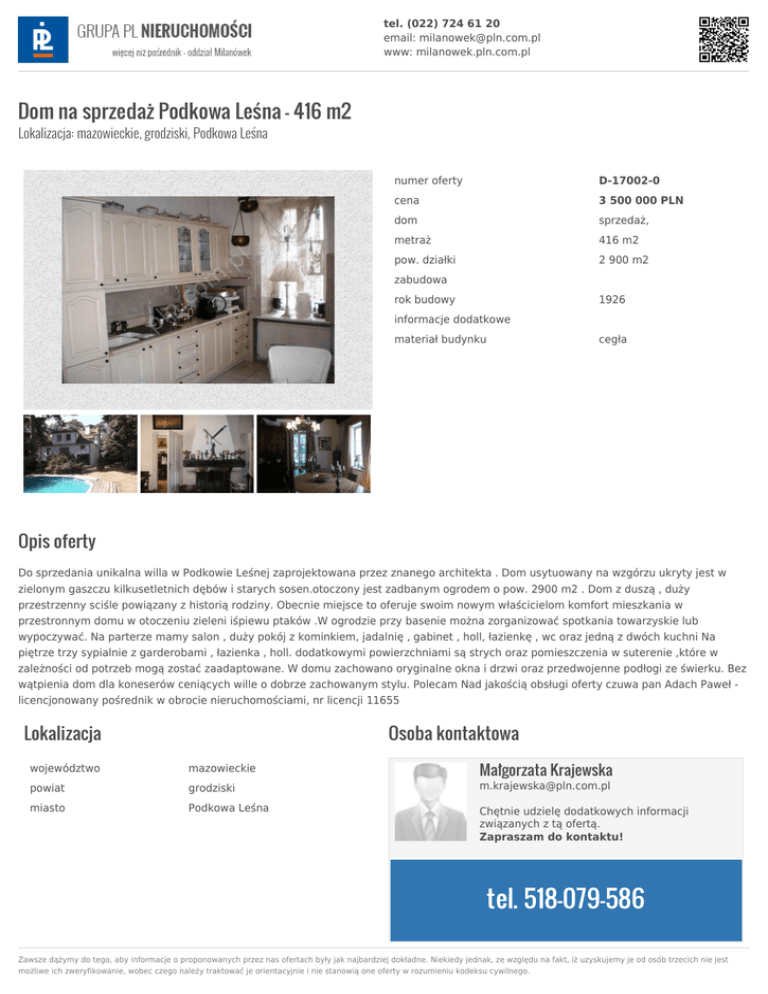 tel. (022) 724 61 20 email: [email protected] www: milanowek.pln.com.pl Dom na sprzedaż Podkowa Leśna - 416 m2 Lokalizacja: mazowieckie, grodziski, Podkowa Leśna numer oferty D-17002-0 cena 3 500 000 PLN dom sprzedaż, metraż 416 m2 pow. działki 2 900 m2 zabudowa rok budowy 1926 informacje dodatkowe materiał budynku cegła Opis oferty Do sprzedania unikalna willa w Podkowie Leśnej zaprojektowana przez znanego architekta . Dom usytuowany na wzgórzu ukryty jest w zielonym gaszczu kilkusetletnich dębów i starych sosen.otoczony jest zadbanym ogrodem o pow. 2900 m2 . Dom z duszą , duży przestrzenny sciśle powiązany z historią rodziny. Obecnie miejsce to oferuje swoim nowym właścicielom komfort mieszkania w przestronnym domu w otoczeniu zieleni iśpiewu ptaków .W ogrodzie przy basenie można zorganizować spotkania towarzyskie lub wypoczywać. Na parterze mamy salon , duży pokój z kominkiem, jadalnię , gabinet , holl, łazienkę , wc oraz jedną z dwóch kuchni Na piętrze trzy sypialnie z garderobami , łazienka , holl. dodatkowymi powierzchniami są strych oraz pomieszczenia w suterenie ,które w zależności od potrzeb mogą zostać zaadaptowane. W domu zachowano oryginalne okna i drzwi oraz przedwojenne podłogi ze świerku. Bez wątpienia dom dla koneserów ceniących wille o dobrze zachowanym stylu. Polecam Nad jakością obsługi oferty czuwa pan Adach Paweł licencjonowany pośrednik w obrocie nieruchomościami, nr licencji 11655 Lokalizacja Osoba kontaktowa Małgorzata Krajewska województwo mazowieckie powiat grodziski [email protected] miasto Podkowa Leśna Chętnie udzielę dodatkowych informacji związanych z tą ofertą. Zapraszam do kontaktu! tel. 518-079-586 Zawsze dążymy do tego, aby informacje o proponowanych przez nas ofertach były jak najbardziej dokładne. Niekiedy jednak, ze względu na fakt, iż uzyskujemy je od osób trzecich nie jest możliwe ich zweryfikowanie, wobec czego należy traktować je orientacyjnie i nie stanowią one oferty w rozumieniu kodeksu cywilnego.