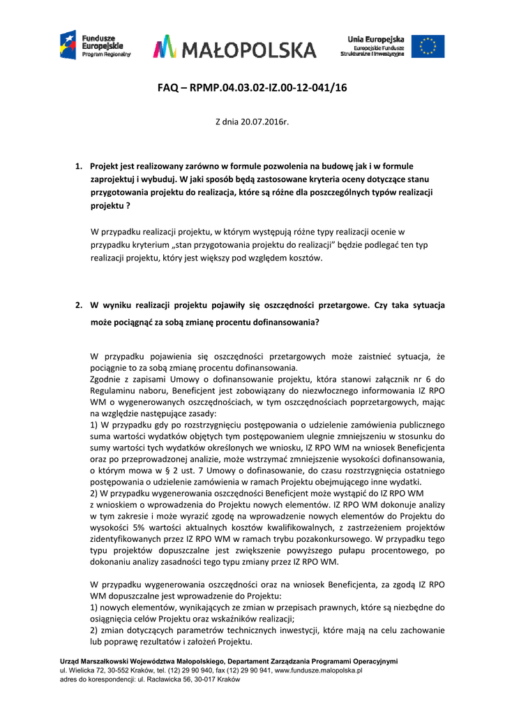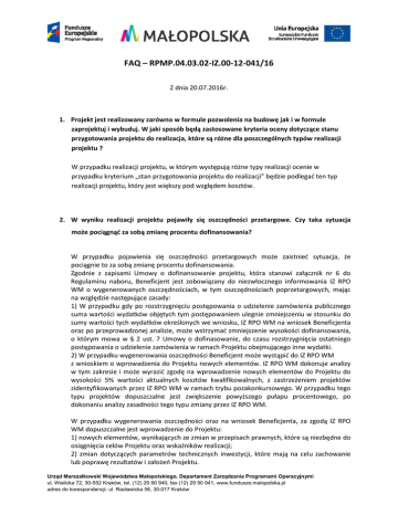 FAQ – RPMP.04.03.02-IZ.00-12-041/16 Z dnia 20.07.2016r. 1. Projekt jest realizowany zarówno w formule pozwolenia na budowę jak i w formule zaprojektuj i wybuduj. W jaki sposób będą zastosowane kryteria oceny dotyczące stanu przygotowania projektu do realizacja, które są różne dla poszczególnych typów realizacji projektu ? W przypadku realizacji projektu, w którym występują różne typy realizacji ocenie w przypadku kryterium „stan przygotowania projektu do realizacji” będzie podlegać ten typ realizacji projektu, który jest większy pod względem kosztów. 2. W wyniku realizacji projektu pojawiły się oszczędności przetargowe. Czy taka sytuacja może pociągnąć za sobą zmianę procentu dofinansowania? W przypadku pojawienia się oszczędności przetargowych może zaistnieć sytuacja, że pociągnie to za sobą zmianę procentu dofinansowania. Zgodnie z zapisami Umowy o dofinansowanie projektu, która stanowi załącznik nr 6 do Regulaminu naboru, Beneficjent jest zobowiązany do niezwłocznego informowania IZ RPO WM o wygenerowanych oszczędnościach, w tym oszczędnościach poprzetargowych, mając na względzie następujące zasady: 1) W przypadku gdy po rozstrzygnięciu postępowania o udzielenie zamówienia publicznego suma wartości wydatków objętych tym postępowaniem ulegnie zmniejszeniu w stosunku do sumy wartości tych wydatków określonych we wniosku, IZ RPO WM na wniosek Beneficjenta oraz po przeprowadzonej analizie, może wstrzymać zmniejszenie wysokości dofinansowania, o którym mowa w § 2 ust. 7 Umowy o dofinasowanie, do czasu rozstrzygnięcia ostatniego postępowania o udzielenie zamówienia w ramach Projektu obejmującego inne wydatki. 2) W przypadku wygenerowania oszczędności Beneficjent może wystąpić do IZ RPO WM z wnioskiem o wprowadzenia do Projektu nowych elementów. IZ RPO WM dokonuje analizy w tym zakresie i może wyrazić zgodę na wprowadzenie nowych elementów do Projektu do wysokości 5% wartości aktualnych kosztów kwalifikowalnych, z zastrzeżeniem projektów zidentyfikowanych przez IZ RPO WM w ramach trybu pozakonkursowego. W przypadku tego typu projektów dopuszczalne jest zwiększenie powyższego pułapu procentowego, po dokonaniu analizy zasadności tego typu zmiany przez IZ RPO WM. W przypadku wygenerowania oszczędności oraz na wniosek Beneficjenta, za zgodą IZ RPO WM dopuszczalne jest wprowadzenie do Projektu: 1) nowych elementów, wynikających ze zmian w przepisach prawnych, które są niezbędne do osiągnięcia celów Projektu oraz wskaźników realizacji; 2) zmian dotyczących parametrów technicznych inwestycji, które mają na celu zachowanie lub poprawę rezultatów i założeń Projektu. Urząd Marszałkowski Województwa Małopolskiego, Departament Zarządzania Programami Operacyjnymi ul. Wielicka 72, 30-552 Kraków, tel. (12) 29 90 940, fax (12) 29 90 941, www.fundusze.malopolska.pl adres do korespondencji: ul. Racławicka 56, 30-017 Kraków 3. Z dokumentacji konkursowej wynika, że w stosunku do kart projektu we wniosku nie podlega zmianie tytuł projektu, wnioskodawca oraz kwota dofinansowania. Czy we wniosku może ulec zmianie koszt całkowity projektu w stosunku do tego co było zawarte w karcie projektu? Koszt całkowity projektu we wniosku może różnić się w stosunku do tego, który został określony w karcie projektu. Oczywiście należy pamiętać o ograniczeniu jakim jest maksymalny dopuszczalny procent dofinansowania przewidziany dla poddziałania 4.3.2, wiec zmiana kosztu całkowitego projektu nie może skutkować przekroczeniem maksymalnego poziomu dofinansowania i wymaganego minimalnego poziomu wkładu własnego. 4. W przypadku projektu realizowanego przez podmiot świadczący usługi w zakresie opieki szpitalnej wymagane jest uzasadnienie realizacji projektu w kontekście map potrzeb zdrowotnych. Mapy potrzeb zdrowotnych są w trakcie przygotowywania przez Ministerstwo Zdrowa, co w przypadku jeśli w zakresie odnoszącym się do realizowanego projektu mapy nie są jeszcze przygotowane? Z pozyskanych informacji, na chwilę obecną mapy potrzeb zdrowotnych nie są przygotowane tylko dla Ambulatoryjnej opieki specjalistycznej i podstawowej opieki zdrowotnej (prace powinny zostać zakończane do końca roku). Kryterium oceny projektu „Specyficzne warunki wstępne”, w części dotyczącej uzasadnienia realizacji projektu w kontekście map potrzeb zdrowotnych brzmi: Pkt. 5 czy realizacja projektu jest uzasadniona w kontekście map potrzeb zdrowotnych opracowanych przez Ministerstwo Zdrowia – subkryterium skierowane wyłącznie do podmiotów świadczących usługi w zakresie opieki szpitalnej” Oznacza to, iż warunek wynikający z kryteriów ma być spełniony wyłącznie dla podmiotów w zakresie opieki szpitalnej, dla której wszystkie mapy zdrowotne są już przygotowane. Urząd Marszałkowski Województwa Małopolskiego, Departament Zarządzania Programami Operacyjnymi ul. Wielicka 72, 30-552 Kraków, tel. (12) 29 90 940, fax (12) 29 90 941, www.fundusze.malopolska.pl adres do korespondencji: ul. Racławicka 56, 30-017 Kraków 5. Po realizacji projektu planowane jest podłączenie obiektu do sieci ciepłowniczej. Czy to dyskwalifikuje projekt do objęcia wsparciem? Zgodnie z zapisem Podręcznika kwalifikowania wydatków w odniesieniu do poddziałania 4.3.2, w przypadku gdy budynek jest podłączony do sieci ciepłowniczej/chłodniczej lub możliwe i racjonalne pod względem ekonomicznym jest podłączenie do ww. sieci, to w takim projekcie niekwalifikowane będą koszty związane z wymianą źródła ciepła. Jeśli w projekcie przewidziana jest wymiana źródła ciepła, wsparcie może zostać udzielone w przypadku wykazania zgodności z planami rozwoju sieci ciepłowniczej dla danego obszaru, w tym braku możliwości i racjonalności pod względem ekonomicznym/efektywności energetycznej podłączenia budynku do sieci ciepłowniczej do roku 2023. 6. Na stronie 13 Regulaminu 