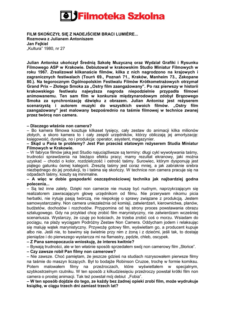 FILM SKOŃCZYŁ SIĘ Z NADEJŚCIEM BRACI LUMIÈRE... Rozmowa z Julianem Antoniszem Jan Fejkiel „Kultura” 1980, nr 27 Julian Antonisz ukończył Średnią Szkołę Muzyczną oraz Wydział Grafiki i Rysunku Filmowego ASP w Krakowie. Debiutował w krakowskim Studio Miniatur Filmowych w roku 1967. Zrealizował kilkanaście filmów, kilka z nich nagrodzono na krajowych i zagranicznych festiwalach (Tourń 69., Poznań 71., Kraków, Manheim 73., Zakopane 80.). Na tegorocznym Ogólnopolskim Festiwalu Filmów Krótkometrażowych otrzymał Grand Prix – Złotego Smoka za „Ostry film zaangażowany”. Po raz pierwszy w historii krakowskiego festiwalu najwyższa nagroda niepodzielnie przypadła filmowi animowanemu. Ten sam film w konkursie międzynarodowym zdobył Brązowego Smoka za synchronizację dźwięku z obrazem. Julian Antonisz jest reżyserem scenarzystą i autorem muzyki do wszystkich swoich filmów. „Ostry film zaangażowany” jest malowany bezpośrednio na taśmie filmowej w technice zwanej przez twórcę non camera. – Dlaczego właśnie non camera? – Bo kamera filmowa kosztuje kilkaset tysięcy, cały zestaw do animacji kilka milionów złotych, a skoro kamera to i cały zespół urzędników, którzy obliczają jej amortyzację: księgowość, dyrekcja, no i produkcja: operator, asystent, magazynier. – Skąd u Pana te problemy? Jest Pan przecież etatowym reżyserem Studia Miniatur Filmowych w Krakowie. – W fabryce filmów jaką jest Studio najuciążliwsze są terminy: długi cykl wywoływania taśmy, trudności sprawdzenia na bieżąco efektu pracy; mamy rezultat ekranowy, jaki można uzyskać – chodzi o kolor, rozdzielczość i ostrość taśmy. Surowiec, którym dysponuję jest piątego gatunku ósmej kategorii. Zresztą taśmy jest coraz mniej, a jak zabraknie srebra niezbędnego do jej produkcji, to i taśma się skończy. W technice non camera pracuje się na odpadach taśmy, koszty są minimalne. – A więc w dobie gospodarki oszczędnościowej technika jak najbardziej godna polecenia... – Są też inne zalety. Dzięki non camerze nie muszę być nudnym, naprzykrzającym się realizatorem zawracającym głowę urzędnikom od filmu. Nie przerywam nikomu picia herbatki, nie irytuję pasją twórczą, nie niepokoję o sprawy związane z produkcją. Jestem samowystarczalny. Non camera uniezależnia od komisji, zatwierdzeń, kierownictwa, planów, budżetów, dochodów i rozchodów. Przypomina od tej strony proces powstawania obrazu sztalugowego. Gdy na przykład chcę zrobić film marynistyczny, nie zatwierdzam wcześniej scenariusza. Wystarczy, że czuję po kościach, że trzeba zrobić coś o morzu. Wsiadam do pociągu, na plaży wyciągam Podróżny Zestaw Non Camera. Oddycham jodem i relaksując się maluję wątek marynistyczny. Przywożę gotowy film, wyświetlam go, a producent kupuje albo nie. Jeśli nie, to bawimy się świetnie przy nim z żoną i z dziećmi, jeśli tak, to dostaję pieniądze i do pierwszego wystarcza mi na flamastry, pędzle, chleb, oscypek. – Z Pana samopoczucia wnioskuję, że interes kwitnie? – Bywają trudności, ale w ten właśnie sposób sprzedałem swój non camerowy film „Słońce”. – Czy zawsze robił Pan filmy non camerowe? – Nie zawsze. Choć pamiętam, że jeszcze gdzieś na studiach rozrysowałem pierwsze filmy na taśmie do maszyn liczących. Był to bodajże Robinson Cruzoe, trochę w formie komiksu. Potem malowałem filmy na przeźroczach, które wyświetlałem w specjalnym, szybkostrzelnym rzutniku. W ten sposób z kilkudziesięciu przeźroczy powstał krótki film non camera o prostej animacji. Tak też powstał mój debiut „Fobia”. – W ten sposób dojdzie do tego, ze każdy bez żadnej opieki zrobi film, może wydrukuje książkę, w ciągu trzech dni zamiast trzech lat? – No oczywiście. Może te filmy zadecydowałyby o renesansie małych kin, może zaczęłyby powstawać małe, ajencyjne naiwno-niedzielne kinka, gdzie energiczny ajent wyświetlałby filmy non camerzystów. Takie kino byłoby szalenie prężne, częste zmiany programu, szybka reakcja na wydarzenia. Chociażby wybuch wulkanu: w jednej chwili, na bieżąco non camerzysta rysuje z wyobraźni wybuch wulkanu na taśmie filmowej i już wieczorem w ilustrowanej kronice filmowej non camera mamy wybuch wulkanu. A więc non–camera to nie tylko minimalne koszty, ale też i szybkość, a szybkość jest dziś decydująca. Już widzę takie kino. Na początku muzyka ze starych płyt, potem non camerowa kronika i dodatek, na końcu puenta wieczoru, non camerowy film z życia wyższych sfer; koniecznie, bo tylko takie filmy są dobre. Tytuł filmu, na przykład „Porwana w noc poślubną”. – Brzmi to nostalgicznie – Niestety... Zaginęły już odpustowe gabinety cieni, nie ma już fotografii jednominutowej, kończą się fotoplastikony i inne audiowizualne zabawki. Dawno już skończyła się epoka eksperymentu wizualno-ślusarsko-mechaniczno-rozrywkowo-złudzeniowo-optycznego. A jest to ta odnoga kinematografii, gdzie tysiące pomysłów odeszło w przeszłość. Dogrzebując się do tych spraw, łącząc je z nowymi technologiami, można uzyskać cudownie nową jakość. Taki na przykład Emil Renaud, sam produkował, malował filmy, sam je wyświetlał we własnym teatrze filmowym. Był to w ogóle geniusz, wynalazł taśmę filmową o specyficznej perforacji, skonstruował unikalny zestaw do projekcji, wszystko dla potrzeb non camery. – A potem przyszli bracia Lumière... – Diabelscy bracia Lumière. Film się skończył z chwilą wynalezienia kamery filmowej. Wszędzie panowała wspaniała non camera dopóki oni nie opatentowali tego fatalnego wynalazku. Od tego czasu zaczęło się na ekranie naturalistyczne przedstawianie rzeczywistości, a przecież lepiej zamiast oglądać na ekranie krowę wyjechać na wieś i przyjrzeć się jej z bliska, w kolorze i trójwymiarowo... – Czy Pana zdaniem jest wielu plastyków zdo