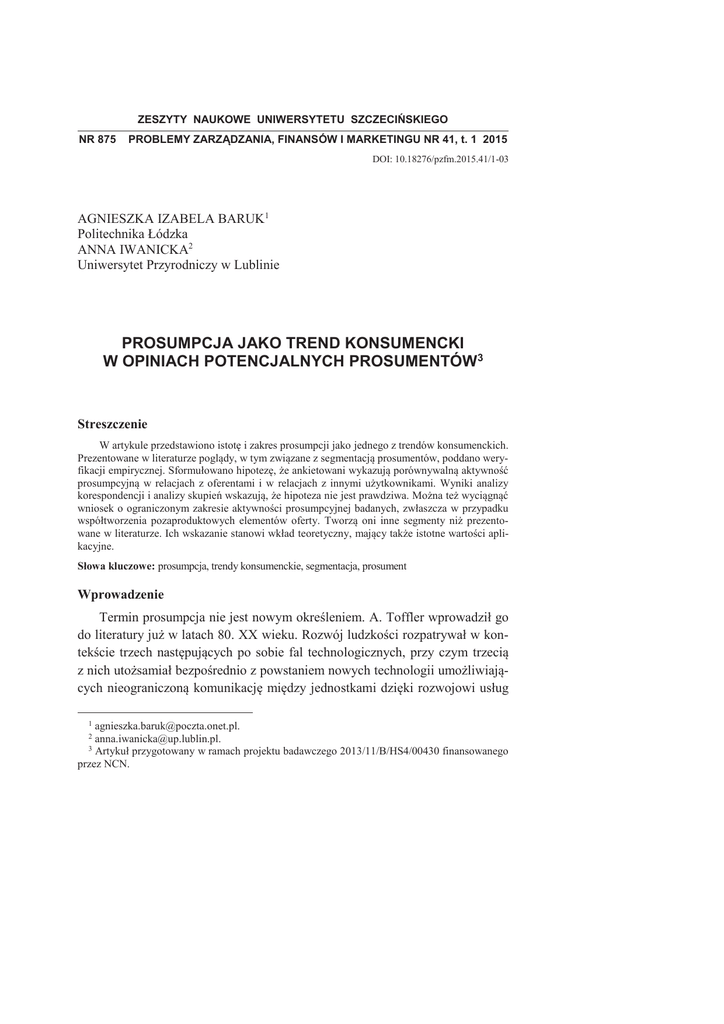 ZESZYTY NAUKOWE UNIWERSYTETU SZCZECIŃSKIEGO NR 875 PROBLEMY ZARZĄDZANIA, FINANSÓW I MARKETINGU NR 41, t. 1 2015 DOI: 10.18276/pzfm.2015.41/1-03 AGNIESZKA IZABELA BARUK1 Politechnika Łódzka ANNA IWANICKA2 Uniwersytet Przyrodniczy w Lublinie PROSUMPCJA JAKO TREND KONSUMENCKI W OPINIACH POTENCJALNYCH PROSUMENTÓW3 Streszczenie W artykule przedstawiono istotę i zakres prosumpcji jako jednego z trendów konsumenckich. Prezentowane w literaturze poglądy, w tym związane z segmentacją prosumentów, poddano weryfikacji empirycznej. Sformułowano hipotezę, że ankietowani wykazują porównywalną aktywność prosumpcyjną w relacjach z oferentami i w relacjach z innymi użytkownikami. Wyniki analizy korespondencji i analizy skupień wskazują, że hipoteza nie jest prawdziwa. Można też wyciągnąć wniosek o ograniczonym zakresie aktywności prosumpcyjnej badanych, zwłaszcza w przypadku współtworzenia pozaproduktowych elementów oferty. Tworzą oni inne segmenty niż prezentowane w literaturze. Ich wskazanie stanowi wkład teoretyczny, mający także istotne wartości aplikacyjne. Słowa kluczowe: prosumpcja, trendy konsumenckie, segmentacja, prosument Wprowadzenie Termin prosumpcja nie jest nowym określeniem. A. Toffler wprowadził go do literatury już w latach 80. XX wieku. Rozwój ludzkości rozpatrywał w kontekście trzech następujących po sobie fal technologicznych, przy czym trzecią z nich utożsamiał bezpośrednio z powstaniem nowych technologii umożliwiających nieograniczoną komunikację między jednostkami dzięki rozwojowi usług 1 [email protected]. [email protected]. 3 Artykuł przygotowany w ramach projektu badawczego 2013/11/B/HS4/00430 finansowanego przez NCN. 2 40 Agnieszka Izabela Baruk, Anna Iwanicka i odejściu od masowej produkcji. Wskazywał jednocześnie na niepokojące zjawisko wzrostu konsumpcji i możliwości jego ograniczenia właśnie dzięki prosumpcji. Prosumenta Toffler traktował jako osobę, która jest skłonna do przejęcia części zadań wcześniej wykonywanych przez producenta4. Współcześnie prosumpcja rozumiana jest znacznie szerzej. Określa się ją mianem inteligentnej konsumpcji i zalicza do trendów konsumenckich. Z jednej strony coraz częściej pojawia się ona we współczesnej literaturze, z drugiej zaś – zalicza się do niej coraz szerszy zbiór różnorodnych form aktywności nabywców. W literaturze funkcjonuje ponadto wiele zbliżonych kategorii, takich jak: koncepcja współtworzenia wartości z klientami5, zaangażowanie konsumentów w środowisku wirtualnym i Web 2.06, crowdsourcing7, produkcja partnerska (peer production), otwarta innowacja (open innovation)8, wikinomia (wikinomics)9, zbiorowa inteligencja (collective intelligence)10, mądrość tłumów (wisdom of the crowds)11 czy wzmacnianie klienta (customer improwerment)12. Rozwój kategorii, jaką obecnie stanowi prosumpcja w dużej mierze uzależniony jest od rozwoju dotychczas istniejących, silnie powiązanych ze sobą koncepcji marketingu relacji, usługowej logiki marketingu oraz marketingu kolaboracyjnego. 4 A. Toffler, Trzecia fala, Państwowy Instytut Wydawniczy, Warszawa 1997, s. 43–45, 409–412. T. Doligalski, Internet w zarządzaniu wartością klienta, Oficyna Wyd. SGH, Warszawa 2013, s. 84–103; C.K. Prahalad, V. Ramaswamy, The future of competition: co-creating unique value with customers, Harvard Business School Press, Boston, Massachusetts 2004. 6 E. Claffey, M. Brady, A model of consumer engagement in a virtual customer environment, „Journal of Customer Behaviour” 2014, Vol. 13, Iss. 4, s. 325–346; P.R. Berthon et al., Marketing meets Web 2.0, social media and creative consumers: implications for international marketing strategy, „Business Horizons” 2012, Vol. 55, Iss. 3, s. 261–271; R. Brodie et al., Consumer engagement in a virtual brand community: An exploratory analysis, „Journal of Business Research” 2013, Vol. 66, Iss. 1, s. 105–114. 7 J. Howe, The rise of crowdsourcing, „Wired” 2006, Vol. 6, http://archive.wired.com/wired /archive/14.06/crowds.html (12.05.2015). 8 C. Battistella, F. Nonino, Open innovation web-based platforms: the impact of different forms of motivation on collaboration, „Innovation: Management, Policy & Practice” 2012, Vol. 14, Iss., s. 557–575. 9 D. Tapscott, A.D. Williams, Wikinomia. O globalnej współpracy, która zmienia wszystko, Wydawnictwa Akademickie i Profesjonalne, Warszawa 2008, www.waip.com.pl/index.php/waip/ waip/serie_wydawnicze/cyberkultura_internet_spoleczenstwo/wikinomia_o_globalnej_wspolpra cy_ktora_zmienia_wszystko (14.01.2015). 10 M. Maleszka, N.T. Nguyen, Integration computing and collective intelligence, „Expert Systems with Applications” 2015, Vol. 42, Iss. 1, s. 332–340. 11 J. Surowiecki, The wisdom of crowds – why the many are smarter than the few, First Anchor Books Edition, New York 2005, s. 3–23. 12 Ch. Fuchs, M. Schreier, Customer empowerment in new product development, „Journal of Product Innovation Management” 2011, Vol. 28, Iss. 1, s. 17–32. 5 Prosumpcja jako trend konsumencki w opiniach… 41 Każda bowiem z nich eksponuje korzyści wynikające ze stałego dialogu z nabywcą, jego indywidualizm oraz emocjonalny charakter relacji z oferentem13. Podstawowym celem niniejszego artykułu było zidentyfikowanie i poddanie analizie zakresu i charakteru aktywności prosumpcyjnej respondentów reprezentujących polskich nabywców. W procesie jego realizacji weryfikacji poddano następującą hipotezę badawczą: H1 – ankietowani wykazują porównywalną aktywność prosumpcyjną w relacjach z oferentami oraz w relacjach z innymi użytkownikami. Prosumpcja jako forma aktywnego uczestnictwa nabywców w procesie kształtowania oferty marketingowej przedsiębiorstwa Według Szul prosumpcja oznacza redefiniowanie roli konsumenta. Wpływa na rozwój produktów przez poszukiwanie nowych sposobów wykorzystywania istniejących produktów, tworzenie i