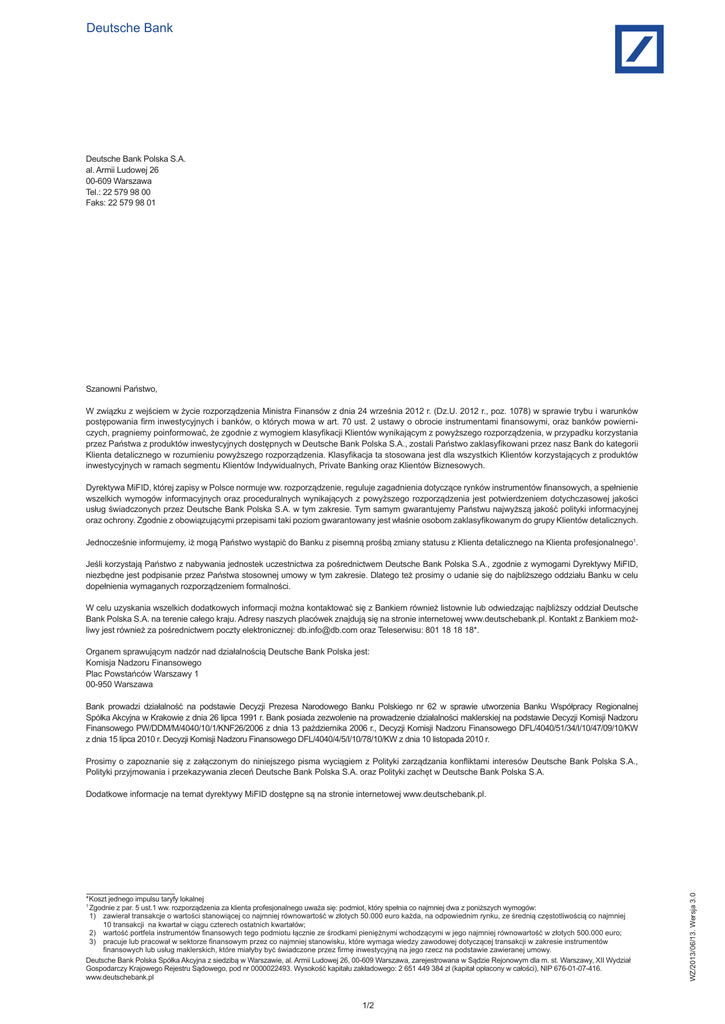 Deutsche Bank Deutsche Bank Polska S.A. al. Armii Ludowej 26 00-609 Warszawa Tel.: 22 579 98 00 Faks: 22 579 98 01 Szanowni Państwo, W związku z wejściem w życie rozporządzenia Ministra Finansów z dnia 24 września 2012 r. (Dz.U. 2012 r., poz. 1078) w sprawie trybu i warunków postępowania firm inwestycyjnych i banków, o których mowa w art. 70 ust. 2 ustawy o obrocie instrumentami finansowymi, oraz banków powierniczych, pragniemy poinformować, że zgodnie z wymogiem klasyfikacji Klientów wynikającym z powyższego rozporządzenia, w przypadku korzystania przez Państwa z produktów inwestycyjnych dostępnych w Deutsche Bank Polska S.A., zostali Państwo zaklasyfikowani przez nasz Bank do kategorii Klienta detalicznego w rozumieniu powyższego rozporządzenia. Klasyfikacja ta stosowana jest dla wszystkich Klientów korzystających z produktów inwestycyjnych w ramach segmentu Klientów Indywidualnych, Private Banking oraz Klientów Biznesowych. Dyrektywa MiFID, której zapisy w Polsce normuje ww. rozporządzenie, reguluje zagadnienia dotyczące rynków instrumentów finansowych, a spełnienie wszelkich wymogów informacyjnych oraz proceduralnych wynikających z powyższego rozporządzenia jest potwierdzeniem dotychczasowej jakości usług świadczonych przez Deutsche Bank Polska S.A. w tym zakresie. Tym samym gwarantujemy Państwu najwyższą jakość polityki informacyjnej oraz ochrony. Zgodnie z obowiązującymi przepisami taki poziom gwarantowany jest właśnie osobom zaklasyfikowanym do grupy Klientów detalicznych. Jednocześnie informujemy, iż mogą Państwo wystąpić do Banku z pisemną prośbą zmiany statusu z Klienta detalicznego na Klienta profesjonalnego1. Jeśli korzystają Państwo z nabywania jednostek uczestnictwa za pośrednictwem Deutsche Bank Polska S.A., zgodnie z wymogami Dyrektywy MiFID, niezbędne jest podpisanie przez Państwa stosownej umowy w tym zakresie. Dlatego też prosimy o udanie się do najbliższego oddziału Banku w celu dopełnienia wymaganych rozporządzeniem formalności. W celu uzyskania wszelkich dodatkowych informacji można kontaktować się z Bankiem również listownie lub odwiedzając najbliższy oddział Deutsche Bank Polska S.A. na terenie całego kraju. Adresy naszych placówek znajdują się na stronie internetowej www.deutschebank.pl. Kontakt z Bankiem możliwy jest również za pośrednictwem poczty elektronicznej: [email protected] oraz Teleserwisu: 801 18 18 18*. Organem sprawującym nadzór nad działalnością Deutsche Bank Polska jest: Komisja Nadzoru Finansowego Plac Powstańców Warszawy 1 00-950 Warszawa Bank prowadzi działalność na podstawie Decyzji Prezesa Narodowego Banku Polskiego nr 62 w sprawie utworzenia Banku Współpracy Regionalnej Spółka Akcyjna w Krakowie z dnia 26 lipca 1991 r. Bank posiada zezwolenie na prowadzenie działalności maklerskiej na podstawie Decyzji Komisji Nadzoru Finansowego PW/DDM/M/4040/10/1/KNF26/2006 z dnia 13 października 2006 r., Decyzji Komisji Nadzoru Finansowego DFL/4040/51/34/I/10/47/09/10/KW z dnia 15 lipca 2010 r. Decyzji Komisji Nadzoru Finansowego DFL/4040/4/5/I/10/78/10/KW z dnia 10 listopada 2010 r. Prosimy o zapoznanie się z załączonym do niniejszego pisma wyciągiem z Polityki zarządzania konfliktami interesów Deutsche Bank Polska S.A., Polityki przyjmowania i przekazywania zleceń Deutsche Bank Polska S.A. oraz Polityki zachęt w Deutsche Bank Polska S.A. * Koszt jednego impulsu taryfy lokalnej 1 Zgodnie z par. 5 ust.1 ww. rozporządzenia za klienta profesjonalnego uważa się: podmiot, który spełnia co najmniej dwa z poniższych wymogów: 1) zawierał transakcje o wartości stanowiącej co najmniej równowartość w złotych 50.000 euro każda, na odpowiednim rynku, ze średnią częstotliwością co najmniej 10 transakcji na kwartał w ciągu czterech ostatnich kwartałów; 2) wartość portfela instrumentów finansowych tego podmiotu łącznie ze środkami pieniężnymi wchodzącymi w jego najmniej równowartość w złotych 500.000 euro; 3) pracuje lub pracował w sektorze finansowym przez co najmniej stanowisku, które wymaga wiedzy zawodowej dotyczącej transakcji w zakresie instrumentów finansowych lub usług maklerskich, które miałyby być świadczone przez firmę inwestycyjną na jego rzecz na podstawie zawieranej umowy. Deutsche Bank Polska Spółka Akcyjna z siedzibą w Warszawie, al. Armii Ludowej 26, 00-609 Warszawa, zarejestrowana w Sądzie Rejonowym dla m. st. Warszawy, XII Wydział Gospodarczy Krajowego Rejestru Sądowego, pod nr 0000022493. Wysokość kapitału zakładowego: 2 651 449 384 zł (kapitał opłacony w całości), NIP 676-01-07-416. www.deutschebank.pl 1/2 WZ/2013/06/13. Wersja 3.0 Dodatkowe informacje na temat dyrektywy MiFID dostępne są na stronie internetowej www.deutschebank.pl. W działalności Deutsche Bank Polska S.A. (zwanego dalej „Bankiem”) i działającego w jego ramach Biura Maklerskiego, jako dostawcy usług finansowych, należącego do globalnej Grupy Deutsche Bank mogą pojawić się sytuacje skutkujące powstaniem potencjalnych i rzeczywistych konfliktów interesów. Polityka Banku zakłada podejmowanie uzasadnionych działań dla utrzymania i funkcjonowania skutecznych procesów mających na celu identyfikowanie i zarządzanie poszczególnymi konfliktami. W szczególności Bank dąż y do tego, aby jego systemy bankowe, mechanizmy kontroli i procedury były adekwatne do potrzeb identyfikowania potencjalnych konfliktów interesów. Potencjalnymi źródłami konfliktu interesów są w szczególności sytuacje, w których występuje: 1. prawdopodobieństwo uzyskania korzyści finansowej lub uniknięcia straty finansowej kosztem Klienta, 2. zainteresowanie rezultatem usługi świadczonej Klientowi lub transakcji przeprowadzonej w imieniu Klienta, które różni się od zainteresowania, jakie Klient pokłada w takim rezultacie, 3. zachęta (w postaci pieniędzy, towarów lub usług innych niż standardowa pr
