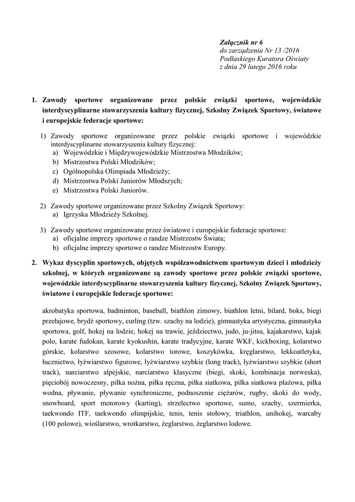 Załącznik nr 6 do zarządzenia Nr 13 /2016 Podlaskiego Kuratora Oświaty z dnia 29 lutego 2016 roku 1. Zawody sportowe organizowane przez polskie związki sportowe, wojewódzkie interdyscyplinarne stowarzyszenia kultury fizycznej, Szkolny Związek Sportowy, światowe i europejskie federacje sportowe: 1) Zawody sportowe organizowane przez polskie związki sportowe i interdyscyplinarne stowarzyszenia kultury fizycznej: a) Wojewódzkie i Międzywojewódzkie Mistrzostwa Młodzików; b) Mistrzostwa Polski Młodzików; c) Ogólnopolska Olimpiada Młodzieży; d) Mistrzostwa Polski Juniorów Młodszych; e) Mistrzostwa Polski Juniorów. wojewódzkie 2) Zawody sportowe organizowane przez Szkolny Związek Sportowy: a) Igrzyska Młodzieży Szkolnej. 3) Zawody sportowe organizowane przez światowe i europejskie federacje sportowe: a) oficjalne imprezy sportowe o randze Mistrzostw Świata; b) oficjalne imprezy sportowe o randze Mistrzostw Europy. 2. Wykaz dyscyplin sportowych, objętych współzawodnictwem sportowym dzieci i młodzieży szkolnej, w których organizowane są zawody sportowe przez polskie związki sportowe, wojewódzkie interdyscyplinarne stowarzyszenia kultury fizycznej, Szkolny Związek Sportowy, światowe i europejskie federacje sportowe: akrobatyka sportowa, badminton, baseball, biathlon zimowy, biathlon letni, bilard, boks, biegi przełajowe, brydż sportowy, curling (tzw. szachy na lodzie), gimnastyka artystyczna, gimnastyka sportowa, golf, hokej na lodzie, hokej na trawie, jeździectwo, judo, ju-jitsu, kajakarstwo, kajak polo, karate fudokan, karate kyokushin, karate tradycyjne, karate WKF, kickboxing, kolarstwo górskie, kolarstwo szosowe, kolarstwo torowe, koszykówka, kręglarstwo, lekkoatletyka, łucznictwo, łyżwiarstwo figurowe, łyżwiarstwo szybkie (long track), łyżwiarstwo szybkie (short track), narciarstwo alpejskie, narciarstwo klasyczne (biegi, skoki, kombinacja norweska), pięciobój nowoczesny, piłka nożna, piłka ręczna, piłka siatkowa, piłka siatkowa plażowa, piłka wodna, pływanie, pływanie synchroniczne, podnoszenie ciężarów, rugby, skoki do wody, snowboard, sport motorowy (karting), strzelectwo sportowe, sumo, szachy, szermierka, taekwondo ITF, taekwondo olimpijskie, tenis, tenis stołowy, triathlon, unihokej, warcaby (100 polowe), wioślarstwo, wrotkarstwo, żeglarstwo, żeglarstwo lodowe.
