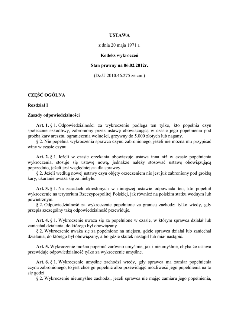 USTAWA z dnia 20 maja 1971 r. Kodeks wykroczeń Stan prawny na 06.02.2012r. (Dz.U.2010.46.275 ze zm.) CZĘŚĆ OGÓLNA Rozdział I Zasady odpowiedzialności Art. 1. § 1. Odpowiedzialności za wykroczenie podlega ten tylko, kto popełnia czyn społecznie szkodliwy, zabroniony przez ustawę obowiązującą w czasie jego popełnienia pod groźbą kary aresztu, ograniczenia wolności, grzywny do 5.000 złotych lub nagany. § 2. Nie popełnia wykroczenia sprawca czynu zabronionego, jeżeli nie można mu przypisać winy w czasie czynu. Art. 2. § 1. Jeżeli w czasie orzekania obowiązuje ustawa inna niż w czasie popełnienia wykroczenia, stosuje się ustawę nową, jednakże należy stosować ustawę obowiązującą poprzednio, jeżeli jest względniejsza dla sprawcy. § 2. Jeżeli według nowej ustawy czyn objęty orzeczeniem nie jest już zabroniony pod groźbą kary, ukaranie uważa się za niebyłe. Art. 3. § 1. Na zasadach określonych w niniejszej ustawie odpowiada ten, kto popełnił wykroczenie na terytorium Rzeczypospolitej Polskiej, jak również na polskim statku wodnym lub powietrznym. § 2. Odpowiedzialność za wykroczenie popełnione za granicą zachodzi tylko wtedy, gdy przepis szczególny taką odpowiedzialność przewiduje. Art. 4. § 1. Wykroczenie uważa się za popełnione w czasie, w którym sprawca działał lub zaniechał działania, do którego był obowiązany. § 2. Wykroczenie uważa się za popełnione na miejscu, gdzie sprawca działał lub zaniechał działania, do którego był obowiązany, albo gdzie skutek nastąpił lub miał nastąpić. Art. 5. Wykroczenie można popełnić zarówno umyślnie, jak i nieumyślnie, chyba że ustawa przewiduje odpowiedzialność tylko za wykroczenie umyślne. Art. 6. § 1. Wykroczenie umyślne zachodzi wtedy, gdy sprawca ma zamiar popełnienia czynu zabronionego, to jest chce go popełnić albo przewidując możliwość jego popełnienia na to się godzi. § 2. Wykroczenie nieumyślne zachodzi, jeżeli sprawca nie mając zamiaru jego popełnienia, popełnia je jednak na skutek niezachowania ostrożności wymaganej w danych okolicznościach, mimo że możliwość popełnienia tego czynu przewidywał albo mógł przewidzieć. Art. 7. § 1. Nieświadomość tego, że czyn jest zagrożony karą, nie wyłącza odpowiedzialności, chyba że nieświadomość była usprawiedliwiona. § 2. Nie popełnia wykroczenia umyślnego, kto pozostaje w błędzie co do okoliczności stanowiącej znamię czynu zabronionego. Art. 8. Na zasadach określonych w niniejszej ustawie odpowiada ten, kto popełnia czyn zabroniony po ukończeniu lat 17. Art. 9. § 1. Jeżeli czyn wyczerpuje znamiona wykroczeń określonych w dwóch lub więcej przepisach ustawy, stosuje się przepis przewidujący najsurowszą karę, co nie stoi na przeszkodzie orzeczeniu środków karnych na podstawie innych naruszonych przepisów. § 2. Jeżeli jednocześnie orzeka się o ukaraniu za dwa lub więcej wykroczeń, wymierza się łącznie karę w granicach zagrożenia określonych w przepisie przewidującym najsurowszą karę, co nie stoi na przeszkodzie orzeczeniu środków karnych na podstawie innych naruszonych przepisów. Art. 10. § 1. Jeżeli czyn będący wykroczeniem wyczerpuje zarazem znamiona przestępstwa, orzeka się za przestępstwo i za wykroczenie, z tym że jeżeli orzeczono za przestępstwo i za wykroczenie karę lub środek karny tego samego rodzaju, wykonuje się surowszą karę lub środek karny. W razie uprzedniego wykonania łagodniejszej kary lub środka karnego zalicza się je na poczet surowszych. § 2. Przy zaliczaniu kar przyjmuje się jeden dzień aresztu za równoważny jednemu dniowi pozbawienia wolności, dwóm dniom ograniczenia wolności oraz grzywnie w kwocie od 20 do 150 złotych. § 3. Karę aresztu orzeczoną za wykroczenie uważa się za karę tego samego rodzaju co kara pozbawienia wolności orzeczona za przestępstwo. § 4. Zaliczeniu, o którym mowa w § 1, nie podlegają środki karne w postaci: 1) nawiązki, jeżeli za wykroczenie i za przestępstwo orzeczono je na rzecz różnych podmiotów; 2) obowiązku naprawienia szkody, jeżeli za wykroczenie i za przestępstwo orzeczono je w związku z różnym rodzajem szkód. Art. 11. § 1. Odpowiada za usiłowanie, kto w zamiarze popełnienia czynu zabronionego swoim zachowaniem bezpośrednio zmierza do jego dokonania, które jednak nie następuje. § 2. Odpowiedzialność za usiłowanie zachodzi, gdy ustawa tak stanowi. § 3. Karę za usiłowanie wymierza się w granicach zagrożenia przewidzianego dla danego wykroczenia. § 4. Nie podlega karze za usiłowanie, kto dobrowolnie odstąpił od czynu lub zapobiegł skutkowi stanowiącemu znamię czynu zabronionego. Art. 12. Odpowiada za podżeganie, kto chcąc, aby inna osoba dokonała czynu zabronionego, nakłania ją do tego. Art. 13. Odpowiada za pomocnictwo, kto w zamiarze, aby inna osoba dokonała czynu zabronionego, swoim zachowaniem ułatwia jego popełnienie, w szczególności dostarczając narzędzie, środek przewozu, udzielając rady lub informacji; odpowiada za pomocnictwo także ten, kto wbrew prawnemu, szczególnemu obowiązkowi niedopuszczenia do popełnienia czynu zabronionego swoim zaniechaniem ułatwia innej osobie jego popełnienie. Art. 14. § 1. Odpowiedzialność za podżeganie i pomocnictwo zachodzi wtedy, gdy ustawa tak stanowi i tylko w razie dokonania przez sprawcę czynu zabronionego. § 2. Każdy ze współdziałających w popełnieniu czynu zabronionego odpowiada w granicach swojej umyślności lub nieumyślności, niezależnie od odpowiedzialności pozostałych współdziałających. § 3. Karę za podżeganie lub za pomocnictwo wymierza się w granicach zagrożenia przewidzianego dla danego wykroczenia. Art. 15. Nie popełnia wykroczenia, kto w obronie koniecznej odpiera bezpośredni bezprawny zamach na jakiekolwiek dobro chronione prawem. Art. 16. § 1. Nie popełnia wykroczenia, kto działa w celu uchylenia be