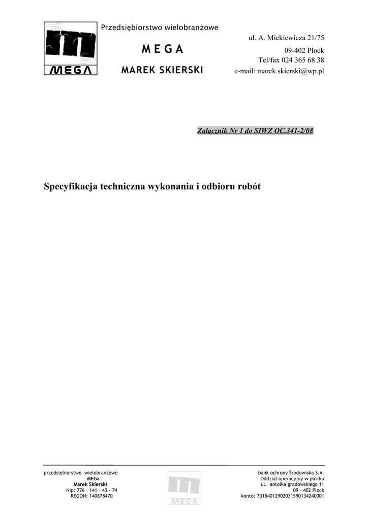 Przedsiębiorstwo wielobranżowe ul. A. Mickiewicza 21/75 MEGA MAREK SKIERSKI 09-402 Płock Tel/fax 024 365 68 38 e-mail: [email protected] Załącznik Nr 1 do SIWZ OC.341-2/08 Specyfikacja techniczna wykonania i odbioru robót przedsiębiorstwo wielobranżowe MEGa Marek Skierski Nip: 776 – 141 – 43 - 74 REGON: 140878470 bank ochrony Środowiska S.A. Oddział operacyjny w płocku ul. antolka gradowskiego 11 09 – 402 Płock konto: 70154012902031590134240001 Przedsiębiorstwo wielobranżowe MEGA MAREK SKIERSKI ul. A. Mickiewicza 21/75 09-402 Płock Tel/fax 024 365 68 38 e-mail: [email protected] 1. Nazwa zamówienia Wykonanie Systemów zabezpieczenia Elektronicznego obejmujących System telewizji Dozorowej na terenie Gminy Nieporęt. 2. Przedmiot i zakres robót Przedmiotem zamówienia jest wykonanie Systemów Zabezpieczenia Elektronicznego, polegających na: • Budowie Systemu Monitoringu Wizyjnego • Budowie Systemu łączności bezprzewodowej Zakres prac obejmuje: • Wykonanie systemu łączności bezprzewodowej pracującej w nielicencjonowanym paśmie 5GHz; • Montaż kamer na słupach oświetleniowych we wskazanych w projekcie technicznym miejscach • Montaż słupa o wys. 12m na terenie Dzikiej Plaży • Montaż dwóch kamer na budynku Urzędu Gminy w Nieporęcie • Doprowadzenie sygnału z kamer do rejestratora • Montaż szafy 42 U z osprzętem w pomieszczeniu 27 budynku Urzędu Gminy • Montaż urządzeń rejestrujących w szafie • Montaż komputera klasy PC z oprogramowaniem do podglądu wizyjnego • Szkolenie obsługi • Test systemu • Wykonanie dokumentacji powykonawczej. przedsiębiorstwo wielobranżowe MEGa Marek Skierski Nip: 776 – 141 – 43 - 74 REGON: 140878470 bank ochrony Środowiska S.A. Oddział operacyjny w płocku ul. antolka gradowskiego 11 09 – 402 Płock konto: 70154012902031590134240001 Przedsiębiorstwo wielobranżowe MEGA MAREK SKIERSKI ul. A. Mickiewicza 21/75 09-402 Płock Tel/fax 024 365 68 38 e-mail: [email protected] 3. Organizacja robót W związku z tym, że prace prowadzone będą budynku Urzędu Gminy jak również na ulicach Zamawiający wymaga aby Wykonawca utrzymywał czystość i porządek w miejscu prowadzenia prac. Ponadto Wykonawca na własny koszt zobowiązany jest do zabezpieczenia robót prowadzonych na terenie ulic i skrzyżowań. Każdorazowe zajęcie pasa drogowego musi być zgłoszone odpowiednim organom i dopiero po ich pozytywnej opinii prace mogą być prowadzone. Pobór prądu odbywa się na koszt Zamawiającego. Zamawiający wskaże Wykonawcy miejsca , w których może podłączyć się instalacji energii elektrycznej. Wykonawca zobowiązany jest do pozostawienia terenu prac w stanie uporządkowanym, oraz do usunięcia na swój koszt wszelkich uszkodzeń powstałych podczas prowadzenia prac. Wykonawca jest zobowiązany do powiadomienia przedstawiciela Zamawiającego w osobie p. Michała Rasińskiego o ewentualnych utrudnieniach powstałych przy realizacji robót. Wykonawca odpowiada za szkody w przypadku braku ich wcześniejszego właściwego zasygnalizowania. Wszystkie prace mogą być wykonywany w godzinach pracy Urzędu tj: • Poniedziałek i czwartek w godz. 10.00 – 18.00, • Wtorek, środa i piątek w godz. 8.00 – 16.00. W przypadku kiedy prace musza być wykonywane poza tymi godzinami Wykonawca każdorazowo ustali to z przedstawicielem Zamawiającego. Wykonawca zobowiązany jest do ubezpieczenia się w zakresie prowadzonej działalności gospodarczej z tytułu szkód, które mogą zaistnieć w związku z określonymi zdarzeniami losowymi oraz od odpowiedzialności cywilnej za szkody oraz następstwa nieszczęśliwych wypadków – dotyczących pracowników i osób trzecich, powstałe w związku z prowadzonymi robotami, w tym także pojazdów mechanicznych. W trakcie realizacji robót Wykonawca jest zobowiązany znać i stosować się do przepisów zawartych we wszystkich regulacjach prawnych w zakresie ochrony środowiska, jak również do przestrzegania przepisów w zakresie BHP i OP, ze szczególnym uwzględnieniem prac prowadzonych przy włączeniu się do czynnych instalacji kablowych. Zamawiający nie ma możliwości udostępnienia Wykonawcy pomieszczenia socjalnego i magazynowego. Na każde żądanie Zamawiającego Wykonawca zobowiązany jest okazać, w stosunku do wskazanych materiałów, certyfikat lub deklaracje zgodności z Polską Normą albo aprobatę techniczną w odniesieniu do wyrobów nie objętych certyfikacją. Zamawiający wymaga aby zastosowany sieciowy osprzęt pasywny (okablowanie, wtyki, itp.) pochodził od jednego dowolnie wybranego przez Wykonawcę producenta. Wykonawca jest zobowiązany do używania jedynie takiego sprzętu, który nie spowoduje niekorzystnego wpływu na jakość wykonywanych robót i środowisko. przedsiębiorstwo wielobranżowe MEGa Marek Skierski Nip: 776 – 141 – 43 - 74 REGON: 140878470 bank ochrony Środowiska S.A. Oddział operacyjny w płocku ul. antolka gradowskiego 11 09 – 402 Płock konto: 70154012902031590134240001 Przedsiębiorstwo wielobranżowe MEGA MAREK SKIERSKI ul. A. Mickiewicza 21/75 09-402 Płock Tel/fax 024 365 68 38 e-mail: [email protected] 4. Dokumenty odniesienia Roboty będące przedmiotem zamówienia realizowane będą na podstawie dokumentacji projektowej składającej się z mapek sytuacyjnych, opisu robót, oraz innych dokumentów takich jak Polskie i europejskie normy: - PN-93/E-08390/14 Systemy alarmowe – Wymagania ogólne. Zasady stosowania. - PN-EN 50130-4 Systemy alarmowe – Część 4: Kompatybilność elektromagnetyczna. - PN-EN 50130-5 Systemy alarmowe- Część 5: próby środowiskowe. - PN-EN 50132-7:2003 Systemy alarmowe- systemy dozorowe CCTV stosowane w zabezpieczeniach. Część 7: Wytyczne stosowania. - CLC/TS 50136-7:2004 systemy alarmowe i urządzenia transmisji alarmu. - 99/5/EC (RTTE) - Telekomunikacyjne urządzenia końcowe i urządzenia radiowe, - 73/23/EEC (LVD) - Niskonapięciowe wyroby elektr