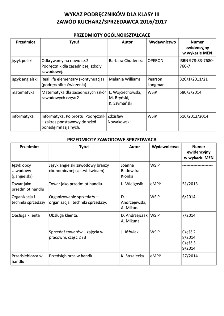WYKAZ PODRĘCZNIKÓW DLA KLASY III ZAWÓD KUCHARZ/SPRZEDAWCA 2016/2017 PRZEDMIOTY OGÓLNOKSZTAŁCACE Przedmiot język polski Tytuł Autor Odkrywamy na nowo cz.2 Podręcznik dla zasadniczej szkoły zawodowej. język angielski Real life elementary (kontynuacja) (podręcznik + ćwiczenia) Wydawnictwo Numer ewidencyjny w wykazie MEN Barbara Chuderska OPERON ISBN 978-83-7680760-7 Melanie Williams Pearson Longman 320/1/2011/21 matematyka Matematyka dla zasadniczych szkół L. Wojciechowski, zawodowych część 2 M. Bryński, K. Szymański WSiP 580/3/2014 informatyka Informatyka. Po prostu. Podręcznik Zdzisław – zakres podstawowy do szkół Nowakowski ponadgimnazjalnych. WSiP 516/2012/2014 PRZEDMIOTY ZAWODOWE SPRZEDWACA Przedmiot Tytuł Autor Wydawnictwo Numer ewidencyjny w wykazie MEN Język obcy zawodowy (j.angielski) Język angielski zawodowy branży ekonomicznej (zeszyt ćwiczeń) Joanna BadowskaKionka WSiP ---------------------- Towar jako przedmiot handlu Towar jako przedmiot handlu. I. Wielgosik eMPi² 51/2013 Organizacja i Organizowanie sprzedaży – techniki sprzedaży organizacja i techniki sprzedaży. D. WSiP Andrzejewski, A. Mikuna 6/2014 Obsługa klienta Obsługa klienta. D. Andrzejczak WSiP A. Mikuna 7/2014 Sprzedaż towarów – zajęcia w pracowni, część 2 i 3 J. Jóźwiak WSiP Część 2 8/2014 Część 3 9/2014 Przedsiębiorca w handlu. K. Strzelecka eMPi² 27/2014 Przedsiębiorca w handlu PRZEDMIOTY ZAWODOWE KUCHARZ Przedmiot Język angielski zawodowy Tytuł Język angielski zawodowy w gastronomii (zeszyt ćwiczeń) Autor Wydawnictwo Numer ewidencyjny w wykazie MEN Rafał Sarna, Katarzyna Sarna WSiP ----------------- Technologia Technologia gastronomiczna z gastronomiczna z towaroznawstwem. Kwalifikacja T.6 towaroznawstwem część 2 Małgorzata Konarzewska REA 2015 Wyposażenie Wyposażenie i zasady bezpieczeństwa techniczne i zasady w gastronomii. Kwalifikacja T.6 bezpieczeństwa w gastronomii Agnieszka REA Kasperek Marzena Kondratowicz 2013 Działalność gospodarcza w gastronomii Hanna Górska- REA Warsewicz, Beata Sawicka, Teresa Mikulska 1/2014 Działalność gospodarcza w gastronomii