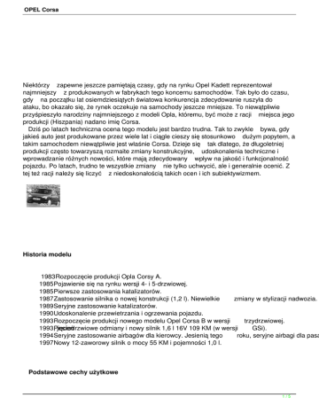 OPEL Corsa Niektórzy zapewne jeszcze pamiętają czasy, gdy na rynku Opel Kadett reprezentował najmniejszy z produkowanych w fabrykach tego koncernu samochodów. Tak było do czasu, gdy na początku lat osiemdziesiątych światowa konkurencja zdecydowanie ruszyła do ataku, bo okazało się, że rynek oczekuje na samochody jeszcze mniejsze. To niewątpliwie przyśpieszyło narodziny najmniejszego z modeli Opla, któremu, być może z racji miejsca jego produkcji (Hiszpania) nadano imię Corsa. Dziś po latach techniczna ocena tego modelu jest bardzo trudna. Tak to zwykle bywa, gdy jakieś auto jest produkowane przez wiele lat i ciągle cieszy się stosunkowo dużym popytem, a takim samochodem niewątpliwie jest właśnie Corsa. Dzieje się tak dlatego, że długoletniej produkcji często towarzyszą rozmaite zmiany konstrukcyjne, udoskonalenia techniczne i wprowadzanie różnych nowości, które mają zdecydowany wpływ na jakość i funkcjonalność pojazdu. Po latach, trudno te wszystkie zmiany nie tylko uchwycić, ale i generalnie ocenić. Z tej też racji należy się liczyć z niedoskonałością takich ocen i ich subiektywizmem. Historia modelu 1983 Rozpoczęcie produkcji Opla Corsy A. 1985 Pojawienie się na rynku wersji 4- i 5-drzwiowej. 1985 Pierwsze zastosowania katalizatorów. 1987 Zastosowanie silnika o nowej konstrukcji (1,2 l). Niewielkie zmiany w stylizacji nadwozia. 1989 Seryjne zastosowanie katalizatorów. 1990 Udoskonalenie przewietrzania i ogrzewania pojazdu. 1993 Rozpoczęcie produkcji nowego modelu Opel Corsa B w wersji trzydrzwiowej. 1993,Pięciodrzwiowe jesień odmiany i nowy silnik 1,6 l 16V 109 KM (w wersji GSi). 1994 Seryjne zastosowanie airbagów dla kierowcy. Jesienią tego roku, seryjne airbagi dla pasa 1997 Nowy 12-zaworowy silnik o mocy 55 KM i pojemności 1,0 l. Podstawowe cechy użytkowe 1/5 OPEL Corsa + ZALETY - Przejrzysta karoseria z wygodnym bagażnikiem Dobre właściwości jezdne Niezła poręczność Bezproblemowe prowadzenie auta na trasie Niskie zużycie paliwa Funkcjonalne przyrządy i wyposażenie. Wysoka jakość wykonania aut z młodszych roczników. - WADY - Stosunkowo głośne wnętrze pojazdu. Przeciętny komfort resorowania. Spartańskie wyposażenie wersji podstawowych. Złe ukształtowanie foteli (niewygodna pozycja ciała). Dość ciężko pracujący układ kierowniczy (w autach bez jego wspomagania). Stosunkowo luźna dźwignia zmiany biegów i długa droga jej prowadzenia. Wysoka cena zakupu Opinie fachowców W starszych samochodach lista usterek jest stosunkowo długa. Pojawiają się wycieki oleju spod pokrywy rozrządu zaworów, czasami po większych przebiegach (100 tys. km) olej wycieka z połączenia skrzyni biegów z silnikiem, zdarzają się też przypadki uszkodzenia uszczelki podgłowicowej. W samochodach wyprodukowanych do 1988 r. notowano dość częste uszkodzenia wyłącznika wentylatora chłodnicy. Dopiero w 1990 r. zmodernizowano niepewnie działający uprzednio układ wtrysku paliwa. Z kolei w 1991 r. zmieniono niezbyt trwałą pompę paliwa. Fachowcy zwracają też uwagę na szybkie utlenianie się styków lub brak kontaktu w złączach, stanowiące jedno ze źródeł usterek w instalacjach elektrycznych. Również defekty przewodów zapłonowych nie należały do rzadkości. Dosyć pospolitą usterką była trudność włączania poszczególnych biegów, spowodowana szybkim zużyciem i nadmiernymi luzami w mechanizmie zmiany biegów. Zwłaszcza w autach pochodzących z wcześniejszych lat produkcji zauważano szybko postępującą korozję w niektórych newralgicznych miejscach nadwozia i podwozia. Już w trakcie jednego z 2/5 OPEL Corsa pierwszych testów długodystansowych, po półrocznej eksploatacji i przebiegu 30 tys. km stwierdzono znaczną korozję w gniazdach sprężyn zawieszenia, na obrzeżach drzwi i na powierzchniach zbiornika paliwowego. Klocki hamulcowe z reguły wymagały wymiany po 50 tys. km przebiegu Dosyć zróżnicowaną trwałość wykazywały układy wydechowe. Na ogół w większości aut, tłumik wytrzymywał 4 do 5 lat eksploatacji, ale zdarzały się pojazdy, w których należało go wymienić już po rocznym użytkowaniu. Do reguły należała konieczność wymiany wszystkich amortyzatorów po 80 tys. km. Narzekano na zbyt podłą jakość materiałów zastosowanych do wyposażenia wnętrza pojazdu. Szczególnie wiele krytycznych uwag budziła tablica rozdzielcza wykonana ze zbyt twardego tworzywa sztucznego. Inne typowe usterki to: - defekty ogumienia skorodowane przewody hamulcowe jednostronne działanie hamulca ręcznego korozja nadwozi (do 1990 roku) W Oplach Corsa B: - szybko zużywające się elementy gumowe w zawieszeniu luzy w układzie kierowniczym uszkodzenia układu zapłonowego szybko zużywające się paski klinowe mało trwały fabryczny akumulator nieszczelności przewodów paliwowych Mimo wielu usterek i wad, Opel Corsa cieszył się popularnością. Sprzyjała temu jego długowieczność, tak zresztą charakterystyczna dla całej rodziny Opli. Mówi się, że silniki Corsy potrafią wytrzymać bez naprawy głównej przebiegi rzędu 250 tys. km. Sprzęgło wytrzymuje bez wymiany 150 tys. km. Auto mimo, że nie należy przecież do dużych, jest dosyć wygodne i stosunkowo tanie w eksploatacji (spala od 6 do 8 l benzyny na 100 km). W klasyfikacji niemieckiego ADAC Corsa jest umieszczana w pierwszej piątce najmniej usterkowych aut. Jednak fachowcy doradzają, aby wybierać raczej auta wyprodukowane po 1989 roku. Mniej więcej od 1985 roku sukcesywnie poprawiono jakość wyposażenia we 3/5 OPEL Corsa wnętrzu samochodu. Z dużym natomiast zaufaniem można się odnieść do zawieszenia kół i układu kierowniczego. W badaniach testowych niemieckiego ADAC w 1993 roku, Opel Corsa Joy 1,2i, najwyższą notę (2,2 ) otrzymał za właściwości jezdne. Podobnie wysokie oceny (2,3) przyznano dla nadwozia, silnika i zespołu napędowego. Najniżej sklasyfikowano bagażnik (3,0)