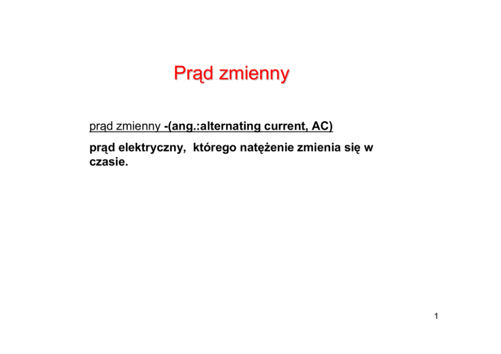 Prąd zmienny prąd zmienny -(ang.:alternating current, AC) prąd elektryczny, którego natężenie zmienia się w czasie. 1 Oś wartości natężenia prądu Oś czasu 2 Definicja natężenia prądu zmiennego dq i= ≠0 dt q – ładunek, t – czas „Natężeniem prądu nazywamy iloraz wartości ładunku dq przepływającego w jednostce czasu dt przez poprzeczny przekrój przewodnika” 3 Prąd elektryczny o sinusoidalnym przebiegu w czasie „prąd sinusoidalny” Jest to prąd przemienny, czyli symetryczny względem osi czasu, zmieniający się w czasie wg zależności gdzie i = I m sin(ωt ) i-natężenie prądu (prąd) -wartość chwilowa, Im-amplituda prądu (największa wartość funkcji sinusoidalnej), ω - pulsacja t – czas 4 15 10 prąd i 5 kąt ω t 0 0 90 180 270 360 -5 -10 -15 Wykres prądu sinusoidalnego w funkcji kąta. Strzałki pokazują umowny kierunek ruchu ładunków. 5 15 10 prąd i 5 kąt ω t 0 0 90 180 270 360 450 540 630 720 810 900 990 1080 -5 -10 -15 6 Z wzoru wynika, że i = I m sin (ωt ) wielkość zawarta w nawiasie (ωt) jest argumentem funkcji trygonometrycznej, a więc jest kątem, czyli jest drogą kątową. Droga kątowa = prędkość kątowa x czas α = ω ⋅t Oznacza to, że ω ma sens prędkości kątowej 7 Można również napisać i = I m sin (α ) Jednostką α (kąta) jest radian lub stopień. Zależność pomiędzy miarą kąta wyrażoną w stopniach i w radianach jest następująca: kąt w radianach = (kąt w stopniach/180). π α = 45 o π 45 α = ⋅π = 4 180 8 15 Im 10 prąd i 5 kąt ω t 0 0 90 180 270 360 -5 -10 π -15 Wykres prądu sinusoidalnego w zależności od kąta wyrażonego w stopniach i w radianach. 9 Okres Okres T jest odstępem pomiędzy jednakowymi wartościami prądu sinusoidalnego (rosnącego lub malejącego). Np. pomiędzy odpowiednimi wartościami zerowymi (rysunek). Miarą okresu jest czas., po którym następuje powtórzenie przebiegu. Miarą okresu jest również kąt (okres odpowiada kątowi 2π lub 360 stopniom). 10 15 Im 10 π prąd i 5 T T/2 kąt ω t 0 0 -5 90 180 270 360 π → 180 o → 1 /2 T -10 2π -15 Sinusoida z zaznaczonymi wielkościami na osi „czasu”. ½okresu (1/2T) odpowiada: 180 w stopniach π w radianach 1 okres (T) odpowiada: 360 w stopniach 2π w radianach 11 Częstotliwość Częstotliwość f jest wielkością określającą ile pełnych okresów przebiegu sinusoidalnego przypada na 1 sekundę. Częstotliwość 1 f = T T = 0,02 s 1 1 f = = = 50 Hz T 0,02 12 1kHz = 10 Hz 3 1MHz = 10 Hz 6 1GHz = 10 Hz 9 13 15 10 prąd i 5 kąt ω t 0 0 90 180 270 360 -5 -10 -15 Częstotliwość 50Hz i 150Hz Częstotliwość 50Hz i 150Hz 14 15 10 prąd i 5 kąt ω t 0 0 90 180 270 360 -5 -10 -15 Częstotliwość 50Hz i 250Hz 15 15 10 prąd i 5 kąt ω t 0 0 90 180 270 360 -5 -10 -15 Częstotliwość 50Hz, 150Hz i 250Hz 16 http://upload.wikimedia.org/wikipedia/commons/e/ea/Wave_frequency.gif 17 Fale radiowe 3kHz − 3THz 18 Podział pasma radiowego Częstotliw ość Długość Nazwa angielska Skrót angielski 3-30 Hz 10-100 tys. km Extremely low frequency ELF 30-300 Hz 1-10 tys. km Super low frequency SLF 300-3000 Hz 100-1000 km Ultra low frequency ULF fale myriametrowe, fale bardzo długie 3-30 kHz 10-100 km Very low frequency VLF fale kilometrowe, f ale długie 30-300 kHz 1-10 km Low frequency LF Nazwa fal 19 Częstotliw ość Długość Nazwa angielska Skrót angielski fale hektometrowe, fale średnie 300-3000 kHz 1001000 m Medium frequency MF fale dekametrowe, fale krótkie 3-30 MHz 10-100 m High frequency HF fale metrowe, fale ultrakrótkie 30-300 MHz 1-10 m Very high frequency VHF Nazwa fal 20 Nazwa fal Częstotliw ość Długość Nazwa angielska Skrót angielski fale decymetrowe 300-3000 MHz 1001000 mm Ultra high frequency UHF fale centymetrowe 3-30 GHz 10-100 mm Super high frequency SHF fale milimetrowe 30-300 GHz 1-10 mm Extremely high frequency EHF fale submilimetrow e 300-3000 GHz 1001000 µm 21 Faza początkowa Pokazane dotychczas przebiegi sinusoidalne były narysowane w taki sposób, że miejsce zerowe sinusoidy przypadało w początku układu współrzędnych. Jest to wygodny sposób prezentowania przebiegu sinusoidalnego, bowiem w jego opisie matematycznym nie występuje tzw „przesunięcie fazowe”, czyli dodatkowy kąt ilustrujący odłegłość przejścia sinusoidy przez zero od początku układu wpspółrzędnych, Przykłady: 22 Faza początkowa równa zeru Wykres prądu sinusoidalnego w zakresie od kąta 0 do 360 stopni 1,5 1 0,5 0 0 30 60 90 120 150 180 210 240 270 300 330 360 390 -0,5 -1 -1,5 i = I m sin (ωt ) 23 Faza początkowa równa zeru Wykres prądu sinusoidalnego w zakresie od kąta -360 do +360 stopni 1,5 1 0,5 0 -360 -270 -180 -90 0 90 180 270 360 -0,5 -1 -1,5 i = I m sin (ωt ) 24 Faza początkowa nie jest równa zeru 1,5 1 0,5 0 -360 -270 -180 -90 0 90 180 270 360 -0,5 -1 -1,5 Faza początkowa ψ = 30 o i = I m sin (ωt + 30) 25 Faza początkowa nie jest równa zeru 1,5 1 0,5 0 -360 -270 -180 -90 0 90 180 270 360 -0,5 -1 -1,5 ψ = −60 i = I m sin (ωt − 60) o Faza początkowa 26 Prezentacja fazy początkowej na wykresie wskazowym Im prąd i 15 kąt ωt 0 -180 -90 0 90 180 270 φ=450 -15 i = I m sin(ωt + ψ ) 360 ψ = 45o i = I m sin(ωt + 45) 27 Prezentacja fazy początkowej na wykresie wskazowym prąd i 15 kąt ωt 0 -180 -90 0 90 180 270 360 φ=-450 i = I m sin(ωt − 45) -15 ψ = −45o i = I m sin(ωt − ψ ) Im 28 Zakres zmian od ψ = 0 do ψ = 360 o 29 Przesunięcie fazowe Dwie wielkości sinusoidalne mogą być w fazie tj. φ1=φ2 lub mogą być przesunięte względem siebie w fazie φ1≠φ2. 2 1,5 1 0,5 0 -360 -270 -180 -90 -0,5 0 90 180 270 360 -1 -1,5 -2 Sinusoidy znajdujące się w fazie ψ 1 = ψ 2 = −60 o 30 Sinusoidy przesunięte względem siebie w fazie 2 ψ 1 = 30 o 1,5 1 0,5 ψ 2 = −60 o 0 -360 -270 -180 -90 -0,5 0 90 180 270 360 -1 -1,5 -2 Różnica faz = przesunięcie fazowe ϕ = ψ 1 −ψ 2 ϕ = 30 − ( −60 ) = 90 0 0 o 31 Ilustracja p